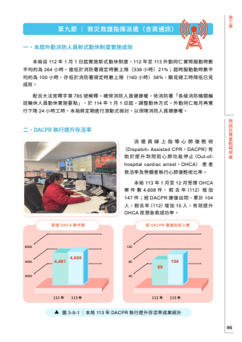 %u7b2c%u4e09%u7ae0%u65bd%u653f%u8a08%u756b%u91cd%u9ede%u8207%u6210%u679c96%u7b2c%u4e5d%u7bc0 %uff5c %u6551%u707d%u6551%u8b77%u6307%u63ee%u6d3e%u9063%uff08%u542b%u8cc7%u901a%u8a0a%uff09%u4e00%u3001%u672c%u5c40%u5916%u52e4%u6d88%u9632%u4eba%u54e1%u65b0%u5f0f%u52e4%u4f11%u5236%u5ea6%u5be6%u65bd%u6210%u6548%u672c%u5c40%u81ea 112 %u5e74 1 %u6708 1 %u65e5%u8d77%u5be6%u65bd%u65b0%u5f0f%u52e4%u4f11%u5236%u5ea6%uff0c112 %u5e74%u81f3 113 %u5916%u52e4%u540c%u4ec1%u5be6%u969b%u670d%u52e4%u6642%u6578%u5e73%u5747%u7d04%u70ba 264 %u5c0f%u6642%uff0c%u9060%u4f4e%u65bc%u6d88%u9632%u7f72%u898f%u5b9a%u6642%u6578%u4e0a%u9650%uff08336 %u5c0f%u6642%uff0921%%uff1b%u8d85%u6642%u670d%u52e4%u52e4%u6642%u6578%u5e73%u5747%u7d04%u70ba 100 %u5c0f%u6642%uff0c%u4ea6%u4f4e%u65bc%u6d88%u9632%u7f72%u898f%u5b9a%u6642%u6578%u4e0a%u9650%uff08160 %u5c0f%u6642%uff0938%%uff0c%u986f%u898b%u7e3d%u5de5%u6642%u964d%u4f4e%u5df2%u898b%u6210%u6548%u3002%u914d%u5408%u5927%u6cd5%u5b98%u91cb%u5b57%u7b2c 785 %u865f%u89e3%u91cb%uff0c%u78ba%u4fdd%u6d88%u9632%u4eba%u54e1%u5065%u5eb7%u6b0a%uff0c%u4f9d%u6d88%u9632%u7f72%u300c%u5404%u7d1a%u6d88%u9632%u6a5f%u95dc%u8f2a%u73ed%u8f2a%u4f11%u4eba%u54e1%u52e4%u4f11%u5be6%u65bd%u8981%u9ede%u300d%uff0c%u65bc 114 %u5e74 1 %u6708 1 %u65e5%u8d77%uff0c%u8abf%u6574%u52e4%u4f11%u65b9%u5f0f%uff0c%u5916%u52e4%u540c%u4ec1%u6bcf%u6708%u518d%u5be6%u884c%u4e0b%u964d 24 %u5c0f%u6642%u5de5%u6642%uff0c%u672c%u5c40%u5c07%u5b9a%u671f%u9032%u884c%u6efe%u52d5%u5f0f%u6aa2%u8a0e%uff0c%u4ee5%u4fdd%u969c%u6d88%u9632%u4eba%u54e1%u5065%u5eb7%u6b0a%u3002%u4e8c%u3001DACPR %u57f7%u884c%u63d0%u5347%u5b58%u6d3b%u7387%u6d3e%u9063%u54e1%u7dda%u4e0a%u6307%u5c0e%u5fc3%u80ba%u5fa9%u7526%u8853%uff08Dispatch- Assisted CPR%uff0cDACPR%uff09%u6709%u52a9 %u65bc %u63d0 %u5347 %u5230 %u9662 %u524d %u5fc3 %u80ba %u529f %u80fd %u505c %u6b62%uff08Out-ofhospital cardiac arrest%uff0cOHCA%uff09%u60a3%u8005%u6551%u6d3b%u7387%u53ca%u65c1%u89c0%u8005%u57f7%u884c%u5fc3%u80ba%u5fa9%u7526%u8853%u6bd4%u7387%u3002%u672c%u5c40 113 %u5e74 1 %u6708%u81f3 12 %u6708%u53d7%u7406 OHCA%u6848%u4ef6%u6578 4,608 %u4ef6%uff0c %u8f03 %u53bb %u5e74%uff08112%uff09%u589e %u52a0147 %u4ef6%uff1b%u7d93 DACPR %u5eb7%u5fa9%u51fa%u9662%uff0c%u7d2f%u8a08 104%u4eba%uff0c%u8f03%u53bb%u5e74%uff08112%uff09%u589e%u52a0 15 %u4eba%uff0c%u6709%u6548%u63d0%u5347OHCA %u6c11%u773e%u6025%u6551%u6210%u529f%u7387%u3002%u25b6 %u5716 3-9-1 %uff5c%u672c%u5c40 113 %u5e74 DACPR %u57f7%u884c%u63d0%u5347%u5b58%u6d3b%u7387%u6210%u679c%u7d71%u8a082000 404000 806000 12089104 4,608 4,461%u53d7%u7406 OHCA %u6848%u4ef6%u6578 %u7d93 DACPR %u5eb7%u5fa9%u51fa%u9662%u4eba%u6578