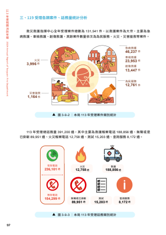 97 113%u5e74%u5ea6%u6843%u5712%u6d88%u9632%u5e74%u58312024 Annual Report of Taoyuan Fire Department%u6709%u6548%u96fb%u8a71 236,101 %u901a%u7121%u6548%u96fb%u8a71 154,299 %u901a%u706b%u707d 12,758 %u901a%u7121%u8072%u6216%u5df2%u639b%u65b7 89,951 %u901a%u6e2c%u8a66 15,203 %u901a%u67e5%u8a62%u670d%u52d9 8,172 %u901a%u6551%u8b77 188,856 %u901a%u4e09%u3001119 %u53d7%u7406%u5404%u985e%u6848%u4ef6%u3001%u8a71%u52d9%u91cf%u7d71%u8a08%u5206%u6790%u6551%u707d%u6551%u8b77%u6307%u63ee%u4e2d%u5fc3%u5168%u5e74%u53d7%u7406%u6848%u4ef6%u7e3d%u6578%u70ba 131,541 %u4ef6%uff0c%u4ee5%u6551%u8b77%u6848%u4ef6%u70ba%u5927%u5b97%uff0c%u4e3b%u8981%u70ba%u6025%u75c5%u6551%u8b77%u3001%u8eca%u798d%u6551%u8b77%u3001%u5275%u50b7%u6551%u8b77%uff0c%u5176%u9918%u6848%u4ef6%u6578%u91cf%u4f9d%u6b21%u70ba%u70ba%u6c11%u670d%u52d9%u3001%u706b%u707d%u3001%u707d%u5bb3%u6436%u6551%u7b49%u6848%u4ef6%u3002113 %u5e74%u53d7%u7406%u7e3d%u8a71%u52d9%u91cf 391,200 %u901a%uff0c%u5176%u4e2d%u4e3b%u8981%u70ba%u6551%u8b77%u5831%u6848%u96fb%u8a71 188,856 %u901a%u3001%u7121%u8072%u6216%u662f%u5df2%u639b%u65b7 89,951 %u901a%u3001%u706b%u707d%u5831%u6848%u96fb%u8a71 12,758 %u901a%u3001%u6e2c%u8a66 15,203 %u901a%u3001%u67e5%u8a62%u670d%u52d9 8,172 %u901a%u3002%u6025%u75c5%u6551%u8b77 46,237 %u4ef6%u70ba%u6c11%u670d%u52d9 12,761 %u4ef6%u8eca%u798d%u6551%u8b77 23,953 %u4ef6%u5275%u50b7%u6551%u8b77 13,447 %u4ef6%u707d%u5bb3%u6436%u65511,164 %u4ef6%u706b%u707d3,996 %u4ef6%u25b6 %u5716 3-9-2 %uff5c%u672c%u5c40 113 %u5e74%u53d7%u7406%u6848%u4ef6%u985e%u5225%u7d71%u8a08%u25b6 %u5716 3-9-3 %uff5c%u672c%u5c40 113 %u5e74%u53d7%u7406%u8a71%u52d9%u985e%u5225%u7d71%u8a08