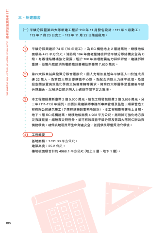 105 113%u5e74%u5ea6%u6843%u5712%u6d88%u9632%u5e74%u58312024 Annual Report of Taoyuan Fire Department%u4e09%u3001%u65b0%u5efa%u5ef3%u820d%uff08%u4e00%uff09%u5e73%u93ae%u5206%u968a%u66a8%u7b2c%u56db%u5927%u968a%u65b0%u5efa%u5de5%u7a0b%u65bc 110 %u5e74 11 %u6708%u767c%u5305%u8a2d%u8a08%uff0c111 %u5e74 1 %u6708%u52d5%u5de5%uff0c113 %u5e74 7 %u6708 23 %u65e5%u5b8c%u5de5%uff0c113 %u5e74 11 %u6708 22 %u65e5%u843d%u6210%u555f%u7528%u3002%u5e73%u93ae%u5206%u968a%u8208%u5efa%u65bc 74 %u5e74%uff0876 %u5e74%u5b8c%u5de5%uff09%uff0c%u70ba RC %u69cb%u9020%u5730%u4e0a 2 %u5c64%u5efa%u7bc9%u7269%uff0c%u7e3d%u6a13%u5730%u677f%u9762%u7a4d%u70ba 473 %u5e73%u65b9%u516c%u5c3a%u3002%u6d88%u9632%u5c40 104 %u5e74%u5ea6%u8001%u5c4b%u5065%u6aa2%u8a55%u4f30%u5e73%u93ae%u5206%u968a%u7d50%u69cb%u5b89%u5168%u70ba C%u7d1a%uff0c%u6709%u8fa6%u7406%u7d50%u69cb%u88dc%u5f37%u4e4b%u9700%u8981%uff1b%u9042%u65bc 108 %u5e74%u8fa6%u7406%u8010%u9707%u80fd%u529b%u8a73%u7d30%u8a55%u4f30%uff0c%u5efa%u8b70%u62c6%u9664%u91cd%u5efa%uff0c%u4e26%u7372%u5167%u653f%u90e8%u6d88%u9632%u7f72%u524d%u77bb%u8a08%u756b%u88dc%u52a9%u65b0%u81fa%u5e63 7,630 %u842c%u5143%u3002%u7b2c%u56db%u5927%u968a%u76ee%u524d%u8207%u9f8d%u6f6d%u5206%u968a%u5408%u7f72%u8fa6%u516c%uff0c%u56e0%u4eba%u529b%u589e%u52a0%u4e14%u8fd1%u5e74%u5e73%u93ae%u5340%u4eba%u53e3%u5feb%u901f%u6210%u9577%u9054 22 %u842c%u4eba%uff0c%u70ba%u7b2c%u56db%u5927%u968a%u4e3b%u8981%u8f44%u5340%u4e2d%u5fc3%u9ede%uff0c%u70ba%u914d%u5408%u6d88%u9632%u4eba%u529b%u9010%u5e74%u905e%u589e%uff0c%u53ca%u589e%u8a2d%u7a7a%u9593%u653e%u7f6e%u9ad8%u6548%u80fd%u5316%u5b78%u6551%u707d%u88dd%u5099%u8eca%u8f1b%u7b49%u9700%u6c42%uff0c%u5c07%u7b2c%u56db%u5927%u968a%u9077%u79fb%u81f3%u91cd%u5efa%u5f8c%u5e73%u93ae%u5206%u968a%u5ef3%u820d%uff0c%u4ee5%u89e3%u6c7a%u76ee%u524d%u6d88%u9632%u4eba%u529b%u9032%u99d0%u7a7a%u9593%u4e0d%u8db3%u4e4b%u7a98%u5883%u3002%u672c%u5de5%u7a0b%u7e3d%u7d93%u8cbb%u65b0%u81fa%u5e63 2 %u5104 5,900 %u842c%u5143%uff0c%u7d71%u5305%u5de5%u7a0b%u767c%u5305%u7d93%u8cbb 2 %u5104 3,636 %u842c%u5143%uff0c%u5206%u4e09%u5e74%uff08111-113%uff09%u5e74%u7de8%u5217%uff0c%u7531%u5f35%u5f18%u9f0e%u5efa%u7bc9%u5e2b%u4e8b%u52d9%u6240%u5c08%u6848%u7ba1%u7406%u53ca%u76e3%u9020%uff1b%u9806%u696d%u71df%u9020%u5de5%u7a0b%u6709%u9650%u516c%u53f8%u7d71%u5305%u65bd%u5de5%uff08%u5c39%u5f65%u7a0b%u5efa%u7bc9%u5e2b%u4e8b%u52d9%u6240%u8a2d%u8a08%uff09%uff0c%u672c%u5de5%u7a0b%u898f%u5283%u8208%u5efa%u5730%u4e0a 5 %u5c64%u3001%u5730%u4e0b 1 %u5c64 RC %u7d50%u69cb%u5efa%u7bc9%uff0c%u7e3d%u6a13%u5730%u677f%u9762%u7a4d 4,968 %u5e73%u65b9%u516c%u5c3a%u3002%u5c46%u6642%u9664%u53ef%u5f37%u5316%u5730%u65b9%u6551%u707d%u6551%u8b77%u80fd%u91cf%uff0c%u7e2e%u77ed%u6551%u707d%u6642%u7a0b%u5916%uff0c%u4e26%u53ef%u6709%u6548%u6539%u5584%u5e73%u93ae%u5206%u968a%u53ca%u7b2c%u56db%u5927%u968a%u540c%u4ec1%u8fa6%u516c%u8207%u5099%u52e4%u74b0%u5883%uff0c%u78ba%u4fdd%u8a72%u5730%u5340%u6c11%u773e%u751f%u547d%u8ca1%u7522%u5b89%u5168%uff0c%u4e26%u63d0%u4f9b%u6c11%u773e%u512a%u8cea%u6d3d%u516c%u74b0%u5883%u3002%u5de5%u7a0b%u6982%u8981%u57fa%u5730%u9762%u7a4d%uff1a1731.33 %u5e73%u65b9%u516c%u5c3a%u3002%u5efa%u7bc9%u9ad8%u5ea6%uff1a25.2 %u516c%u5c3a%u3002%u6a13%u5730%u677f%u9762%u7a4d%u5408%u8a08%u7d04 4968.1 %u5e73%u65b9%u516c%u5c3a%uff08%u5730%u4e0a 5 %u5c64%u3001%u5730%u4e0b 1 %u5c64%uff09%u30023421