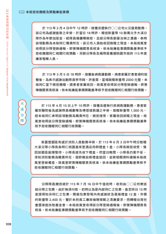 109 113%u5e74%u5ea6%u6843%u5712%u6d88%u9632%u5e74%u58312024 Annual Report of Taoyuan Fire Department%u5206%u968a%u968a%u54e1%u9b4f%u70ac%u658c%u65bc 113 %u5e74 7 %u6708 16 %u65e5%u4e2d%u5348%u503c%u73ed%u6642%uff0c%u6536%u5230%u7531%u25cb%u25cb%u516c%u53f8%u5bc4%u9001%u7d66%u5206%u968a%u4e4b%u5305%u88f9%uff0c%u7531%u65bc%u7121%u9808%u4ed8%u6b3e%uff0c%u521d%u6642%u4ee5%u70ba%u662f%u5167%u90e8%u540c%u4ec1%u4e4b%u5305%u88f9%uff0c%u76f4%u81f3%u540c%u65e5 15 %u6642%u67e5%u8b49%u5f97%u77e5%u975e%u540c%u4ec1%u4e4b%u5305%u88f9%uff0c%u958b%u555f%u5305%u88f9%u767c%u73fe%u5167%u6709%u611f%u8b1d%u72c0%u53ca%u86cb%u6372%u79ae%u76d2 12 %u76d2%uff0c%u5e02%u50f9%u7d04%u65b0%u81fa%u5e63 2,400 %u5143%uff0c%u9452%u65bc%u672c%u5e9c%u54e1%u5de5%u5ec9%u653f%u502b%u7406%u898f%u7bc4%u4e4b%u6e05%u5ec9%u8981%u6c42%uff0c%u800c%u8f49%u8d08%u53f0%u7063%u5152%u7ae5%u66a8%u5bb6%u5ead%u6276%u52a9%u57fa%u91d1%u6703%u3002%u672c%u5c40%u653f%u98a8%u5ba4%u6536%u5f97%u8a72%u5206%u968a%u767b%u9304%u901a%u5831%u5f8c%uff0c%u5373%u7c3d%u9673%u6a5f%u95dc%u9996%u9577%u6838%u51c6%uff0c%u4f9d%u672c%u5c40%u5ec9%u80fd%u4e8b%u8e5f%u734e%u52f5%u57fa%u6e96%u6838%u4e88%u62d2%u6536%u993d%u8d08%u540c%u4ec1%u76f8%u95dc%u884c%u653f%u734e%u52f5%u3002%u67d0%u9732%u71df%u5712%u5340%u6709%u611f%u65bc%u6d88%u9632%u4eba%u54e1%u52e4%u52d9%u8f9b%u52de%uff0c%u65bc 113 %u5e74 6 %u6708 3 %u65e5%u4e2d%u5348%u6642%u5206%u81f4%u8d08%u5927%u6eaa%u5206%u968a%u5c0f%u968a%u9577%u5433%u660e%u4ec1%u6843%u5712%u559c%u4f86%u767b%u9152%u5e97%u8089%u7cbd%u79ae%u76d2 1 %u76d2%uff0c%u5c0f%u968a%u9577%u5a49%u62d2%u6536%u53d7%uff0c%u60df%u56e0%u8a72%u5712%u5340%u526f%u7406%u5805%u6301%uff0c%u5c0f%u968a%u9577%u9042%u5148%u6536%u4e0b%u79ae%u76d2%u3002%u7136%u7576%u65e5%u665a%u9593%uff0c%u5c0f%u968a%u9577%u4ecd%u89ba%u4e0d%u59a5%uff0c%u6df1%u77e5%u6d88%u9632%u52e4%u52d9%u70ba%u8077%u8cac%u6240%u5728%uff0c%u65cb%u5373%u89aa%u81ea%u5c07%u79ae%u76d2%u9000%u56de%uff0c%u4e26%u5c07%u76f8%u95dc%u8cc7%u6599%u901a%u5831%u672c%u5c40%u653f%u98a8%u5ba4%u767b%u9304%u5099%u67e5%uff0c%u653f%u98a8%u5ba4%u5373%u7c3d%u9673%u6a5f%u95dc%u9996%u9577%u6838%u51c6%uff0c%u4f9d%u672c%u5c40%u5ec9%u80fd%u4e8b%u8e5f%u734e%u52f5%u57fa%u6e96%u6838%u4e88%u62d2%u6536%u993d%u8d08%u540c%u4ec1%u76f8%u95dc%u884c%u653f%u734e%u52f5%u3002%u5927%u6eaa%u5206%u968a%u65bc 113 %u5e74 4 %u6708 15 %u65e5%u4e0a%u5348 10 %u6642%u8a31%uff0c%u63a5%u7372%u6d3e%u9063%u57f7%u884c%u75be%u75c5%u6551%u8b77%u52e4%u52d9%uff0c%u60a3%u8005%u5bb6%u5c6c%u5230%u91ab%u9662%u5f8c%u70ba%u611f%u8b1d%u968a%u54e1%u694a%u53e2%u6689%u53ca%u5085%u715c%u57ce%u6551%u8b77%u4e4b%u8f9b%u52de%uff0c%u81f4%u8d08%u65b0%u81fa%u5e63 1,000 %u5143%uff0c%u7d93%u672c%u5c40%u540c%u4ec1%u8868%u660e%u8a72%u9805%u52e4%u52d9%u70ba%u8077%u8cac%u6240%u5728%uff0c%u5a49%u62d2%u63a5%u53d7%uff0c%u5bb6%u5c6c%u6536%u56de%u6b32%u8d08%u4e4b%u73fe%u91d1%u3002%u653f%u98a8%u5ba4%u6536%u5f97%u8a72%u5206%u968a%u767b%u9304%u901a%u5831%uff0c%u5373%u7c3d%u9673%u6a5f%u95dc%u9996%u9577%u6838%u51c6%uff0c%u4f9d%u672c%u5c40%u5ec9%u80fd%u4e8b%u8e5f%u734e%u52f5%u57fa%u6e96%u6838%u4e88%u62d2%u6536%u993d%u8d08%u540c%u4ec1%u76f8%u95dc%u884c%u653f%u734e%u52f5%u3002%u65bc 113 %u5e74 3 %u6708 5 %u65e5 18 %u6642%u8a31%uff0c%u63a5%u7372%u6025%u75c5%u6551%u8b77%u52e4%u52d9%uff0c%u75c5%u60a3%u5bb6%u5c6c%u65bc%u60a3%u8005%u9806%u5229%u5c31%u91ab%u5f8c%uff0c%u70ba%u8868%u793a%u611f%u8b1d%u51fa%u52e4%u968a%u54e1%u674e%u5b97%u9321%u3001%u8a31%u5584%u5dfd%uff0c%u7576%u5834%u81f4%u8d08%u65b0%u81fa%u5e63 2000 %u5143%u6574%u3002%u672c%u5c40%u540c%u4ec1%u7576%u4e0b%u5a49%u62d2%u993d%u8d08%uff0c%u8acb%u60a3%u8005%u5bb6%u5c6c%u6536%u56de%uff0c%u653f%u98a8%u5ba4%u6536%u5f97%u8a72%u5206%u968a%u767b%u9304%u901a%u5831%uff0c%u5373%u7c3d%u9673%u6a5f%u95dc%u9996%u9577%u6838%u51c6%uff0c%u4f9d%u672c%u5c40%u5ec9%u80fd%u4e8b%u8e5f%u734e%u52f5%u57fa%u6e96%u6838%u4e88%u62d2%u6536%u993d%u8d08%u540c%u4ec1%u76f8%u95dc%u884c%u653f%u734e%u52f5%u3002%u65bc 113 %u5e74 2 %u6708 4 %u65e5%u4e2d%u5348 12 %u6642%u8a31%uff0c%u63a5%u7372%u6d3e%u9063%u57f7%u884c%u25cb%u25cb%u516c%u53f8%u706b%u707d%u6436%u6551%u52e4%u52d9%uff0c%u8a72%u516c%u53f8%u70ba%u611f%u8b1d%u6436%u6551%u4e4b%u8f9b%u52de%uff0c%u65bc%u7576%u65e5 18 %u6642%u8a31%uff0c%u8d08%u9001%u65b0%u81fa%u5e63 10 %u9918%u842c%u5143%u4e88%u5927%u6eaa%u5206%u968a%u4f5c%u70ba%u5e74%u7bc0%u52a0%u83dc%u91d1%uff0c%u7d93%u968a%u54e1%u694a%u53e2%u6689%u5a49%u62d2%uff0c%u4e14%u7d93%u5206%u968a%u9577%u5289%u664f%u6c5d%u8207%u4e4b%u6e9d%u901a%uff0c%u8868%u660e%u8a72%u9805%u52e4%u52d9%u70ba%u672c%u5c40%u540c%u4ec1%u8077%u8cac%u6240%u5728%uff0c%u8a72%u516c%u53f8%u4eba%u54e1%u59cb%u6536%u56de%u81f4%u8d08%u4e4b%u73fe%u91d1%u3002%u672c%u5c40%u653f%u98a8%u5ba4%u6536%u5f97%u8a72%u5206%u968a%u767b%u9304%u901a%u5831%uff0c%u5373%u7c3d%u9673%u6a5f%u95dc%u9996%u9577%u6838%u51c6%uff0c%u4f9d%u672c%u5c40%u5ec9%u80fd%u4e8b%u8e5f%u734e%u52f5%u57fa%u6e96%u6838%u4e88%u62d2%u6536%u993d%u8d08%u540c%u4ec1%u76f8%u95dc%u884c%u653f%u734e%u52f5%u3002%u53e6%u5289%u5206%u968a%u9577%u53ca%u694a%u968a%u54e1%u7372%u9078%u6843%u5712%u5e02%u653f%u5e9c 113 %u5e74%u5ea6%u5ec9%u6f54%u6977%u6a21%u4eba%u54e1%u3002%uff08%u4e8c%uff09%u672c%u5c40%u62d2%u6536%u993d%u8d08%u53ca%u734e%u52f5%u5ec9%u80fd%u4e8b%u8e5f