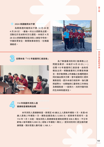 %u7b2c%u4e09%u7ae0%u65bd%u653f%u8a08%u756b%u91cd%u9ede%u8207%u6210%u679c112%u53ec%u958b%u672c%u5c40%u300c113 %u5e74%u57fa%u5c64%u540c%u4ec1%u5ea7%u8ac7%u6703%u300d2024 %u6843%u5712%u9f8d%u5ca1%u7c73%u5e72%u7bc0%u70ba%u671f%u5169%u9031%u7684%u9f8d%u5ca1%u7c73%u5e72%u7bc0%uff084 %u6708 20 %u81f34 %u6708 28 %u65e5%uff09%uff0c%u6700%u5f8c%u4e00%u5929%u4ee5%u706b%u628a%u7bc0%u70ba%u4e3b%u984c%uff0c%u6d3b%u52d5%u4f4d%u65bc%u5fe0%u8c9e%u65b0%u6751%u6587%u5316%u5712%u5340%u3002%u672c%u5c40%u65bc 4 %u670828 %u65e5%u706b%u628a%u7bc0%u671f%u9593%u6d3e%u99d0%u6d88%u9632%u4eba%u8eca%u99d0%u5b88%u5f85%u547d%uff0c%u5b88%u8b77%u6c11%u773e%u5b89%u5168%uff0c%u671f%u9593%u7121%u4e8b%u6545%u767c%u751f%uff0c%u4efb%u52d9%u5713%u6eff%u9054%u6210%u300234%u70ba%u4e86%u89e3%u57fa%u5c64%u6d88%u9632%u540c%u4ec1%u52e4%u696d%u52d9%u4e0a%u4e4b%u554f%u984c%u53ca%u9700%u6c42%uff0c%u672c%u5c40%u65bc 9 %u6708 23 %u65e5 ( %u4e00 )%u53ec %u958b 113 %u5e74%u57fa%u5c64%u540c%u4ec1%u5ea7%u8ac7%u6703%uff0c%u7531%u5c40%u9577%u89aa%u81ea%u4e3b%u6301%uff0c%u50be%u807d%u57fa%u5c64%u540c%u4ec1%u7684%u8072%u97f3%u8207%u5efa%u8a00%uff0c%u5c0d%u65bc%u52e4%u696d%u52d9%u4e0a%u6240%u9762%u81e8%u4e4b%u5404%u7a2e%u554f%u984c%u5171%u540c%u8a0e%u8ad6%u51fa%u89e3%u6c7a%u65b9%u6848%u3002%u6703%u4e2d%u611f%u8b1d%u540c%u4ec1%u63d0%u4f9b%u5bf6%u8cb4%u610f%u898b%uff0c%u63d0%u5347%u672c%u5c40%u884c%u653f%u6548%u7387%uff0c%u5f37%u5316%u5718%u968a%u51dd%u805a%u529b%uff0c%u4e5f%u671f%u52c9%u540c%u4ec1%u8981%u4fdd%u6709%u5de5%u4f5c%u71b1%u5ff1%u53ca%u7a4d%u6975%u614b%u5ea6%uff0c%u4e00%u8d77%u52aa%u529b%uff0c%u5171%u540c%u5b88%u8b77%u5e02%u6c11%u7684%u751f%u547d%u8207%u8ca1%u7522%u5b89%u5168%u3002114 %u5e74%u6843%u5712%u5e02%u6d88%u9632%u4eba%u54e1%u5065%u5eb7%u6aa2%u67e5%u88dc%u52a9%u518d%u52a0%u78bc%u672c%u5e02%u6d88%u9632%u4eba%u54e1%u5065%u5eb7%u6aa2%u67e5%uff0c%u539f%u898f%u5b9a 40 %u6b72%u4ee5%u4e0a%u4eba%u54e1%u6bcf%u5e74%u88dc%u52a9 1 %u6b21%uff0c%u672a%u6eff 40%u6b72%u4eba%u54e1%u6bcf 2 %u5e74%u88dc%u52a9 1 %u6b21%uff0c%u88dc%u52a9%u91d1%u984d%u70ba%u6bcf%u4eba 5,000 %u5143%u3002%u7d93%u7c3d%u5949%u5e02%u9577%u6838%u53ef%uff0c%u81ea114 %u5e74 1 %u6708 1 %u65e5%u8d77%uff0c%u589e%u52a0%u6d88%u9632%u4eba%u54e1%u5065%u5eb7%u6aa2%u67e5%u88dc%u52a9%u7d93%u8cbb%u81f3 836.5 %u842c%u5143%uff0c%u4e0d%u5206%u5e74%u9f61%u6bcf%u4eba%u6bcf%u5e74%u88dc%u52a9 5,000 %u5143 ( %u6216%u6bcf 2 %u5e74%u88dc%u52a9 1 %u842c%u5143 )%uff0c%u63d0%u4f9b%u6d88%u9632%u540c%u4ec1%u66f4%u5168%u9762%u7684%u5065%u5eb7%u7167%u8b77%uff0c%u9810%u8a08%u53d7%u60e0%u4eba%u6578%u53ef%u9054 1,168 %u4eba%u3002
