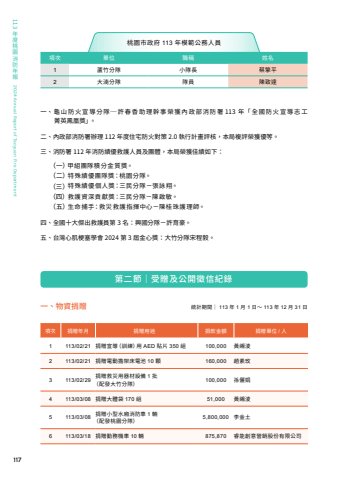 117 113%u5e74%u5ea6%u6843%u5712%u6d88%u9632%u5e74%u58312024 Annual Report of Taoyuan Fire Department%u7b2c%u4e8c%u7bc0%uff5c%u53d7%u8d08%u53ca%u516c%u958b%u5fb5%u4fe1%u7d00%u9304%u4e00%u3001%u7269%u8cc7%u6350%u8d08%u4e00%u3001 %u9f9c %u5c71 %u9632 %u706b %u5ba3 %u5c0e %u5206 %u968a %u2500 %u8a31 %u6625 %u9999 %u52a9 %u7406 %u5e79 %u4e8b %u69ae %u7372 %u5167 %u653f %u90e8 %u6d88 %u9632 %u7f72 113 %u5e74%u300c %u5168 %u570b %u9632 %u706b %u5ba3 %u5c0e %u5fd7 %u5de5%u83c1%u82f1%u9cf3%u51f0%u734e%u300d%u3002%u4e8c%u3001%u5167%u653f%u90e8%u6d88%u9632%u7f72%u8fa6%u7406 112 %u5e74%u5ea6%u4f4f%u5b85%u9632%u706b%u5c0d%u7b56 2.0 %u57f7%u884c%u8a08%u756b%u8a55%u6838%uff0c%u672c%u5c40%u8907%u8a55%u69ae%u7372%u512a%u7b49%u3002%u4e09%u3001%u6d88%u9632%u7f72 112 %u5e74%u6d88%u9632%u7e3e%u512a%u6551%u8b77%u4eba%u54e1%u53ca%u5718%u9ad4%uff0c%u672c%u5c40%u69ae%u7372%u4f73%u7e3e%u5982%u4e0b%uff1a%uff08%u4e00%uff09%u7532%u7d44%u5718%u968a%u7a4d%u5206%u91d1%u8cea%u734e%u3002%uff08%u4e8c%uff09%u7279%u6b8a%u7e3e%u512a%u5718%u968a%u734e%uff1a%u6843%u5712%u5206%u968a%u3002%uff08%u4e09%uff09%u7279%u6b8a%u7e3e%u512a%u500b%u4eba%u734e%uff1a%u4e09%u6c11%u5206%u968a%uff0d%u5f35%u8a60%u7fd4%u3002%uff08%u56db%uff09%u6551%u8b77%u8cc7%u6df1%u8ca2%u737b%u734e%uff1a%u4e09%u6c11%u5206%u968a%uff0d%u9673%u555f%u654f%u3002%uff08%u4e94%uff09%u751f%u547d%u6355%u624b%uff1a%u6551%u707d%u6551%u8b77%u6307%u63ee%u4e2d%u5fc3%uff0d%u9673%u6842%u73e0%u8b77%u7406%u5e2b%u3002%u56db%u3001%u5168%u570b%u5341%u5927%u5091%u51fa%u6551%u8b77%u54e1%u7b2c 3 %u540d%uff1a%u8208%u570b%u5206%u968a%uff0d%u8a31%u80b2%u8c6a%u3002%u4e94%u3001%u53f0%u7063%u5fc3%u808c%u6897%u585e%u5b78%u6703 2024 %u7b2c 3 %u5c46%u91d1%u5fc3%u734e%uff1a%u5927%u7af9%u5206%u968a%u5b8b%u7a0b%u6bc5%u3002%u7d71%u8a08%u671f%u9593%uff5c 113 %u5e74 1 %u6708 1 %u65e5%uff5e 113 %u5e74 12 %u6708 31 %u65e5%u9805%u6b21 %u6350%u8d08%u5e74%u6708 %u6350%u8d08%u7528%u9014 %u6350%u6b3e%u91d1%u984d %u6350%u8d08%u55ae%u4f4d / %u4eba1 113/02/21 %u6350%u8d08%u5ba3%u5c0e%uff08%u8a13%u7df4%uff09%u7528 AED %u8cbc%u7247 350 %u7d44 100,000 %u9ec3%u7dd7%u6de92 113/02/21 %u6350%u8d08%u96fb%u52d5%u64d4%u67b6%u5e8a%u96fb%u6c60 10 %u9846 160,000 %u8d99%u7d20%u73ab3 113/02/29 %u6350%u8d08%u6551%u707d%u7528%u5668%u6750%u8a2d%u5099 1 %u6279%uff08%u914d%u767c%u5927%u7af9%u5206%u968a%uff09 100,000 %u5b6b%u5137%u5a1f4 113/03/08 %u6350%u8d08%u5927%u9ad4%u888b 170 %u7d44 51,000 %u9ec3%u7dd7%u6de95 113/03/08 %u6350%u8d08%u5c0f%u578b%u6c34%u5ec2%u6d88%u9632%u8eca 1 %u8f1b%uff08%u914d%u767c%u6843%u5712%u5206%u968a%uff09 5,800,000 %u674e%u91d1%u571f6 113/03/18 %u6350%u8d08%u52e4%u52d9%u6a5f%u8eca 10 %u8f1b 875,870 %u777f%u80fd%u5275%u610f%u71df%u92b7%u80a1%u4efd%u6709%u9650%u516c%u53f8%u6843%u5712%u5e02%u653f%u5e9c 113 %u5e74%u6a21%u7bc4%u516c%u52d9%u4eba%u54e1%u9805%u6b21 %u55ae%u4f4d %u8077%u7a31 %u59d3%u540d1 %u8606%u7af9%u5206%u968a %u5c0f%u968a%u9577 %u8521%u64ce%u5e732 %u5927%u6e73%u5206%u968a %u968a%u54e1 %u9673%u81f4%u9054