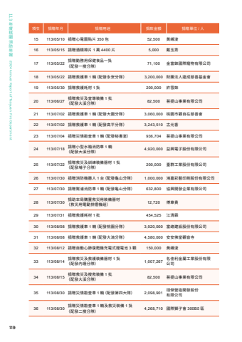 119113%u5e74%u5ea6%u6843%u5712%u6d88%u9632%u5e74%u58312024 Annual Report of Taoyuan Fire Department%u9805%u6b21 %u6350%u8d08%u5e74%u6708 %u6350%u8d08%u7528%u9014 %u6350%u6b3e%u91d1%u984d %u6350%u8d08%u55ae%u4f4d / %u4eba15 113/05/10 %u6350%u8d08%u5fc3%u96fb%u5716%u8cbc%u7247 350 %u5305 52,500 %u9ec3%u7dd7%u6de916 113/05/15 %u6350%u8d08%u9152%u7cbe%u68c9%u7247 1 %u842c 4400 %u7247 5,000 %u6234%u7389%u79c017 113/05/22 %u6350%u8d08%u52e4%u52d9%u7528%u4fdd%u5065%u98df%u54c1%u4e00%u6279%uff08%u914d%u767c%u4e00%u641c%u5206%u968a%uff09 71,100 %u91d1%u5bcc%u9338%u570b%u969b%u5bf5%u7269%u6709%u9650%u516c%u53f818 113/05/22 %u6350%u8d08%u6551%u8b77%u8eca 1 %u8f1b%uff08%u914d%u767c%u6c38%u5b89%u5206%u968a%uff09 3,200,000 %u8ca1%u5718%u6cd5%u4eba%u9054%u6210%u6148%u5584%u57fa%u91d1%u670319 113/05/30 %u6350%u8d08%u6551%u8b77%u8017%u6750 1 %u6279 200,000 %u8a31%u96ea%u59b920 113/06/27 %u6350%u8d08%u6551%u707d%u53ca%u5ba3%u5c0e%u88dd%u5099 1 %u6279%uff08%u914d%u767c%u5927%u6eaa%u5206%u968a%uff09 82,500 %u83e9%u63d0%u5c71%u4e8b%u696d%u6709%u9650%u516c%u53f821 113/07/02 %u6350%u8d08%u6551%u8b77%u8eca 1 %u8f1b%uff08%u914d%u767c%u5927%u5712%u5206%u968a%uff09 3,060,000 %u6843%u5712%u5e02%u89c0%u81ea%u5728%u6148%u5584%u670322 113/07/02 %u6350%u8d08%u6551%u8b77%u8eca 1 %u8f1b%uff08%u914d%u767c%u9ad8%u5e73%u5206%u968a%uff09 3,243,510 %u53e4%u5143%u999923 113/07/04 %u6350%u8d08%u707d%u60c5%u52d8%u67e5%u8eca 1 %u8f1b%uff08%u914d%u767c%u79d8%u66f8%u5ba4%uff09 936,704 %u83e9%u63d0%u5c71%u4e8b%u696d%u6709%u9650%u516c%u53f824 113/07/18 %u6350%u8d08%u5c0f%u578b%u6c34%u7bb1%u6d88%u9632%u8eca 1 %u8f1b%uff08%u914d%u767c%u5927%u6eaa%u5206%u968a%uff09 4,920,000 %u76ca%u8208%u96fb%u5b50%u80a1%u4efd%u6709%u9650%u516c%u53f825 113/07/22 %u6350%u8d08%u6551%u707d%u53ca%u8a13%u7df4%u88dd%u5099%u5668%u6750 1 %u6279%uff08%u914d%u767c%u57d4%u5b50%u5206%u968a%uff09 200,000 %u81fa%u7fa4%u5de5%u696d%u80a1%u4efd%u6709%u9650%u516c%u53f826 113/07/30 %u6350%u8d08%u6d88%u9632%u6a5f%u5668%u4eba 1 %u53f0%uff08%u914d%u767c%u9f9c%u5c71%u5206%u968a%uff09 1,000,000 %u9d3b%u5609%u5f69%u85dd%u5370%u5237%u80a1%u4efd%u6709%u9650%u516c%u53f827 113/07/30 %u6350%u8d08%u5e6b%u6d66%u6d88%u9632%u8eca 1 %u8f1b%uff08%u914d%u767c%u9f9c%u5c71%u5206%u968a%uff09 632,800 %u5354%u8208%u958b%u767c%u4f01%u696d%u6709%u9650%u516c%u53f828 113/07/30 %u6350%u52a9%u672c%u5c40%u8cfc%u7f6e%u6551%u707d%u7528%u88dd%u5099%u5668%u6750%uff08%u6551%u707d%u7528%u96fb%u52d5%u6392%u7159%u6a5f%u7d44%uff09 12,720 %u5085%u7ae0%u8cb429 113/07/31 %u6350%u8d08%u6551%u8b77%u8017%u6750 1 %u6279 454,525 %u6c5f%u6e05%u971630 113/08/08 %u6350%u8d08%u6551%u8b77%u8eca 1 %u8f1b%uff08%u914d%u767c%u6843%u5712%u5206%u968a%uff09 3,920,000 %u5bcc%u7e3d%u5efa%u8a2d%u80a1%u4efd%u6709%u9650%u516c%u53f831 113/08/08 %u6350%u8d08%u6551%u8b77%u8eca 1 %u8f1b%uff08%u914d%u767c%u5927%u6e73%u5206%u968a%uff09 4,580,000 %u5b89%u5b89%u4f5b%u5802%u89c0%u97f3%u5bfa32 113/08/12 %u6350%u8d08%u81ea%u52d5%u5fc3%u80ba%u5fa9%u7526%u6a5f%u5145%u96fb%u5f0f%u92f0%u96fb%u6c60 3 %u9846 150,000 %u9ec3%u7dd7%u6de933 113/08/14 %u6350%u8d08%u6551%u707d%u53ca%u6551%u8b77%u88dd%u5099%u5668%u6750 1 %u6279%uff08%u914d%u767c%u5167%u58e2%u5206%u968a%uff09 1,007,267 %u540d%u4f73%u5229%u91d1%u5c6c%u5de5%u696d%u80a1%u4efd%u6709%u9650%u516c%u53f834 113/08/15 %u6350%u8d08%u6551%u707d%u53ca%u641c%u6551%u88dd%u5099 1 %u6279%uff08%u914d%u767c%u5927%u6eaa%u5206%u968a%uff09 82,500 %u83e9%u63d0%u5c71%u4e8b%u696d%u6709%u9650%u516c%u53f835 113/08/30 %u6350%u8d08%u707d%u60c5%u52d8%u67e5%u8eca 1 %u8f1b%uff08%u914d%u767c%u7b2c%u56db%u5927%u968a%uff09 2,098,901 %u7fca%u5091%u71df%u9020%u958b%u767c%u80a1%u4efd%u6709%u9650%u516c%u53f836 113/08/30 %u6350%u8d08%u707d%u60c5%u52d8%u67e5%u8eca 1 %u8f1b%u53ca%u6551%u707d%u88dd%u5099 1 %u6279%uff08%u914d%u767c%u4e8c%u641c%u5206%u968a%uff09 4,268,710 %u570b%u969b%u7345%u5b50%u6703 300B5 %u5340