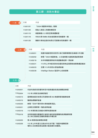 %u7b2c%u4e94%u7ae0%u9644%u9304124%u7b2c%u4e09%u7bc0%uff5c%u6d88%u9632%u5927%u4e8b%u8a18%u65e5%u671f %u5167%u5bb9113/01/01 %u300c2024 %u6843%u5712%u8de8%u5e74%u665a%u6703%u300d%u52e4%u52d9113/01/04 %u65b0%u9032%u4eba%u54e1%u500b%u4eba%u9632%u8b77%u88dd%u5099%u914d%u767c113/01/15 %u6843%u5712%u63a8%u52d5%u5c0f%u5c0f%u6d88%u9632%u5ba3%u5c0e%u54e1%u9ad4%u9a57%u71df113/01/16 %u4e2d%u592e%u5927%u5b78 EMBA %u6821%u53cb%u6703%u6350%u8d08%u672c%u5c40%u6551%u8b77%u8eca 1 %u8f1b113/01/25 %u96c5%u52dd%u51b7%u51cd%u98df%u54c1%u80a1%u4efd%u6709%u9650%u516c%u53f8%u6350%u8d08%u672c%u5c40%u6551%u8b77%u8eca 1 %u8f1b%u65e5%u671f %u5167%u5bb9113/02/01 %u6843%u5712%u5e02%u8b70%u6703%u6170%u52de%u6d88%u9632%u540c%u4ec1%u57f7%u884c%u6625%u7bc0%u671f%u9593%u5b89%u5168%u7dad%u8b77%u5de5%u4f5c%u6d3b%u52d5113/02/02 %u8fa6%u7406%u300c2024 %u6843%u5712%u71c8%u6703%u300d%u706b%u707d%u6436%u6551%u66a8%u5927%u91cf%u50b7%u75c5%u60a3%u8655%u7406%u6f14%u7df4113/02/19 %u672c%u5e02%u7279%u7a2e%u641c%u6551%u968a%u57ce%u5e02%u6551%u63f4%u91ab%u7642%u7d44%u7b2c%u4e00%u5b63%u8a13%u7df4113/02/21 113 %u5e74%u4e0a%u534a%u5e74%u5ea6%u6d88%u9632%u5b89%u5168%u66a8%u5371%u96aa%u7269%u54c1%u7ba1%u7406%u6aa2%u67e5%u5be6%u52d9%u8b1b%u7fd2%u8907%u8a13113/02/23 %u53ec%u958b 113 %u5e74%u6d88%u9632%u6c34%u6e90%u5354%u8abf%u6703%u8b70113/02/29 VitalSign Station %u76e3%u63a7%u4e2d%u5fc3%u7cfb%u7d71%u6350%u8d08%u4e00%u6708%u4e8c%u6708%u65e5%u671f %u5167%u5bb9113/03/01 %u4ee3%u8a13%u5167%u653f%u90e8%u6d88%u9632%u7f72%u7279%u8003%u73ed%u4e2d%u7d1a%u6551%u8b77%u6280%u8853%u54e1%u8a13%u7df4%u958b%u8a13%u5178%u79ae113/03/04 113 %u5e74%u706b%u5834%u5b89%u5168%u8a13%u7df4%u521d%u968e%u73ed113/03/13 %u9060%u50b3%u96fb%u4fe1%u80a1%u4efd%u6709%u9650%u516c%u53f8%u6350%u8d08%u672c%u5c40 5G %u6551%u8b77%u8eca%u7dca%u6025%u91ab%u7642%u8a2d%u5099113/03/15 %u91ab%u7642%u6307%u5c0e%u91ab%u5e2b%u6703%u8b70113/03/20 %u8fa6%u7406%u300c%u65e5%u672c%u5343%u8449%u79d1%u5b78%u5927%u5b78%u6551%u8b77%u8eca%u898b%u7fd2%u300d113/03/21 %u4f01%u696d%u9632%u707d%u5c08%u6848%u7b2c%u4e00%u968e%u6bb5%u6210%u679c%u6703%u8b70113/03/19 113 %u5e74%u7b2c%u56db%u6551%u707d%u6551%u8b77%u5927%u968a%u91ce%u5730%u641c%u6551%u8a13%u7df4113/03/18 %u672c%u5c40%u8207%u6843%u5712%u5e02%u7378%u91ab%u5e2b%u516c%u6703%u885b%u751f%u798f%u5229%u90e8%u6843%u5712%u91ab%u9662%u9577%u5e9a%u91ab%u7642%u8ca1%u5718%u6cd5%u4eba%u6797%u53e3%u9577%u5e9a%u7d00%u5ff5%u91ab%u9662%u7c3d%u7f72%u5408%u4f5c%u5099%u5fd8%u9304113/03/25 %u7b2c 26 %u671f%u6551%u52a9%u8a13%u7df4%u958b%u8a13%u5178%u79ae113/03/26 113 %u5e74%u4e0a%u534a%u5e74%u57fa%u5317%u5317%u6843%u5408%u4f5c%u4ea4%u6d41%u5e73%u81fa%u300c%u6843%u5712%u5e02%u907f%u96e3%u5f31%u52e2%u5834%u6240%u706b%u707d%u521d%u671f%u81ea%u6551%u53ca%u758f%u6563%u793a%u7bc4%u6f14%u7df4%u4ea4%u6d41%u89c0%u6469%u300d%u4e09%u6708