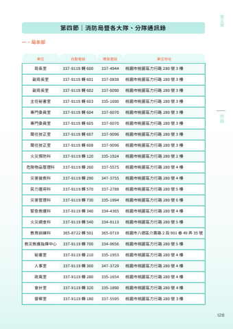 %u7b2c%u4e94%u7ae0%u9644%u9304128 %u7b2c%u56db%u7bc0%uff5c%u6d88%u9632%u5c40%u66a8%u5404%u5927%u968a%u3001%u5206%u968a%u901a%u8a0a%u9304%u4e00%u3001%u5c40%u672c%u90e8%u55ae%u4f4d %u81ea%u52d5%u96fb%u8a71 %u50b3%u771f%u96fb%u8a71 %u55ae%u4f4d%u5730%u5740%u5c40%u9577%u5ba4 337-9119 %u8f49 600 337-4944 %u6843%u5712%u5e02%u6843%u5712%u5340%u529b%u884c%u8def 280 %u865f 3 %u6a13%u526f%u5c40%u9577%u5ba4 337-9119 %u8f49 601 337-0838 %u6843%u5712%u5e02%u6843%u5712%u5340%u529b%u884c%u8def 280 %u865f 3 %u6a13%u526f%u5c40%u9577%u5ba4 337-9119 %u8f49 602 337-6090 %u6843%u5712%u5e02%u6843%u5712%u5340%u529b%u884c%u8def 280 %u865f 3 %u6a13%u4e3b%u4efb%u79d8%u66f8%u5ba4 337-9119 %u8f49 603 335-1690 %u6843%u5712%u5e02%u6843%u5712%u5340%u529b%u884c%u8def 280 %u865f 3 %u6a13%u5c08%u9580%u59d4%u54e1%u5ba4 337-9119 %u8f49 604 337-6070 %u6843%u5712%u5e02%u6843%u5712%u5340%u529b%u884c%u8def 280 %u865f 3 %u6a13%u5c08%u9580%u59d4%u54e1%u5ba4 337-9119 %u8f49 605 337-6070 %u6843%u5712%u5e02%u6843%u5712%u5340%u529b%u884c%u8def 280 %u865f 3 %u6a13%u7c21%u4efb%u6280%u6b63%u5ba4 337-9119 %u8f49 607 337-9096 %u6843%u5712%u5e02%u6843%u5712%u5340%u529b%u884c%u8def 280 %u865f 3 %u6a13%u7c21%u4efb%u6280%u6b63%u5ba4 337-9119 %u8f49 608 337-9096 %u6843%u5712%u5e02%u6843%u5712%u5340%u529b%u884c%u8def 280 %u865f 3 %u6a13%u706b%u707d%u9810%u9632%u79d1 337-9119 %u8f49 120 335-1924 %u6843%u5712%u5e02%u6843%u5712%u5340%u529b%u884c%u8def 280 %u865f 2 %u6a13%u5371%u96aa%u7269%u54c1%u7ba1%u7406%u79d1 337-9119 %u8f49 260 337-5575 %u6843%u5712%u5e02%u6843%u5712%u5340%u529b%u884c%u8def 280 %u865f 4 %u6a13%u707d%u5bb3%u6436%u6551%u79d1 337-9119 %u8f49 290 347-3755 %u6843%u5712%u5e02%u6843%u5712%u5340%u529b%u884c%u8def 280 %u865f 4 %u6a13%u6c11%u529b%u904b%u7528%u79d1 337-9119 %u8f49 570 337-2788 %u6843%u5712%u5e02%u6843%u5712%u5340%u529b%u884c%u8def 280 %u865f 5 %u6a13%u707d%u5bb3%u7ba1%u7406%u79d1 337-9119 %u8f49 730 335-1994 %u6843%u5712%u5e02%u6843%u5712%u5340%u529b%u884c%u8def 280 %u865f 6 %u6a13%u7dca%u6025%u6551%u8b77%u79d1 337-9119 %u8f49 340 334-4365 %u6843%u5712%u5e02%u6843%u5712%u5340%u529b%u884c%u8def 280 %u865f 4 %u6a13%u706b%u707d%u8abf%u67e5%u79d1 337-9119 %u8f49 540 334-9113 %u6843%u5712%u5e02%u6843%u5712%u5340%u529b%u884c%u8def 280 %u865f 5 %u6a13%u6559%u80b2%u8a13%u7df4%u79d1 365-8722 %u8f49 501 365-0719 %u6843%u5712%u5e02%u516b%u5fb7%u5340%u4ecb%u58fd%u8def 2 %u6bb5 901 %u5df7 49 %u5f04 35 %u865f%u6551%u707d%u6551%u8b77%u6307%u63ee%u4e2d%u5fc3 337-9119 %u8f49 700 334-9656 %u6843%u5712%u5e02%u6843%u5712%u5340%u529b%u884c%u8def 280 %u865f 5 %u6a13%u79d8%u66f8%u5ba4 337-9119 %u8f49 210 335-1953 %u6843%u5712%u5e02%u6843%u5712%u5340%u529b%u884c%u8def 280 %u865f 4 %u6a13%u4eba%u4e8b%u5ba4 337-9119 %u8f49 360 347-3729 %u6843%u5712%u5e02%u6843%u5712%u5340%u529b%u884c%u8def 280 %u865f 4 %u6a13%u653f%u98a8%u5ba4 337-9119 %u8f49 280 335-1654 %u6843%u5712%u5e02%u6843%u5712%u5340%u529b%u884c%u8def 280 %u865f 4 %u6a13%u6703%u8a08%u5ba4 337-9119 %u8f49 320 335-1890 %u6843%u5712%u5e02%u6843%u5712%u5340%u529b%u884c%u8def 280 %u865f 4 %u6a13%u7763%u5bdf%u5ba4 337-9119 %u8f49 180 337-5595 %u6843%u5712%u5e02%u6843%u5712%u5340%u529b%u884c%u8def 280 %u865f 3 %u6a13