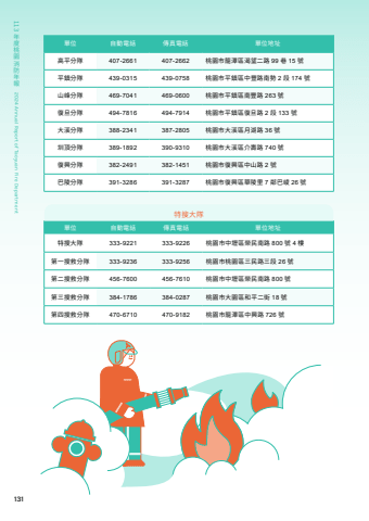 113%u5e74%u5ea6%u6843%u5712%u6d88%u9632%u5e74%u58312024 Annual Report of Taoyuan Fire Department131%u7279%u641c%u5927%u968a%u55ae%u4f4d %u81ea%u52d5%u96fb%u8a71 %u50b3%u771f%u96fb%u8a71 %u55ae%u4f4d%u5730%u5740%u7279%u641c%u5927%u968a 333-9221 333-9226 %u6843%u5712%u5e02%u4e2d%u58e2%u5340%u69ae%u6c11%u5357%u8def 800 %u865f 4 %u6a13%u7b2c%u4e00%u641c%u6551%u5206%u968a 333-9236 333-9256 %u6843%u5712%u5e02%u6843%u5712%u5340%u4e09%u6c11%u8def%u4e09%u6bb5 26 %u865f%u7b2c%u4e8c%u641c%u6551%u5206%u968a 456-7600 456-7610 %u6843%u5712%u5e02%u4e2d%u58e2%u5340%u69ae%u6c11%u5357%u8def 800 %u865f%u7b2c%u4e09%u641c%u6551%u5206%u968a 384-1786 384-0287 %u6843%u5712%u5e02%u5927%u5712%u5340%u548c%u5e73%u4e8c%u8857 18 %u865f%u7b2c%u56db%u641c%u6551%u5206%u968a 470-6710 470-9182 %u6843%u5712%u5e02%u9f8d%u6f6d%u5340%u4e2d%u8208%u8def 726 %u865f%u55ae%u4f4d %u81ea%u52d5%u96fb%u8a71 %u50b3%u771f%u96fb%u8a71 %u55ae%u4f4d%u5730%u5740%u9ad8%u5e73%u5206%u968a 407-2661 407-2662 %u6843%u5712%u5e02%u9f8d%u6f6d%u5340%u6e34%u671b%u4e8c%u8def 99 %u5df7 15 %u865f%u5e73%u93ae%u5206%u968a 439-0315 439-0758 %u6843%u5712%u5e02%u5e73%u93ae%u5340%u4e2d%u8c50%u8def%u5357%u52e2 2 %u6bb5 174 %u865f%u5c71%u5cf0%u5206%u968a 469-7041 469-0600 %u6843%u5712%u5e02%u5e73%u93ae%u5340%u5357%u8c50%u8def 263 %u865f%u5fa9%u65e6%u5206%u968a 494-7816 494-7914 %u6843%u5712%u5e02%u5e73%u93ae%u5340%u5fa9%u65e6%u8def 2 %u6bb5 133 %u865f%u5927%u6eaa%u5206%u968a 388-2341 387-2805 %u6843%u5712%u5e02%u5927%u6eaa%u5340%u6708%u6e56%u8def 36 %u865f%u5733%u9802%u5206%u968a 389-1892 390-9310 %u6843%u5712%u5e02%u5927%u6eaa%u5340%u4ecb%u58fd%u8def 740 %u865f%u5fa9%u8208%u5206%u968a 382-2491 382-1451 %u6843%u5712%u5e02%u5fa9%u8208%u5340%u4e2d%u5c71%u8def 2 %u865f%u5df4%u9675%u5206%u968a 391-3286 391-3287 %u6843%u5712%u5e02%u5fa9%u8208%u5340%u83ef%u9675%u91cc 7 %u9130%u5df4%u5d1a 26 %u865f