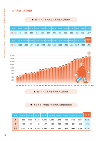 9113%u5e74%u5ea6%u6843%u5712%u6d88%u9632%u5e74%u58312024 Annual Report of Taoyuan Fire Department%u25b6 %u8868 2-1-2 %uff5c%u672c%u5c40%u8fd1 10 %u5e74%u6d88%u9632%u4eba%u54e1%u6027%u5225%u7d71%u8a08%u8868%u25b6 %u8868 2-1-1 %uff5c%u672c%u5c40%u6210%u7acb%u4ee5%u4f86%u6d88%u9632%u4eba%u529b%u7d71%u8a08%u8868%u25b6 %u5716 2-1-2 %uff5c%u672c%u5c40%u6b77%u5e74%u6d88%u9632%u4eba%u529b%u6210%u9577%u5716%u4e09%u3001%u54e1%u984d%u3001%u4eba%u529b%u7d71%u8a08%u5e74%u5ea6 104 %u5e74 105 %u5e74 106 %u5e74 107 %u5e74 108 %u5e74 109 %u5e74 110 %u5e74 111 %u5e74 112 %u5e74 113 %u5e74%u7537 990 1,059 1,134 1,223 1,340 1,375 1,407 1,443 1,504 1,538%u5973 135 137 149 167 182 188 193 204 202 213%u7e3d%u8a08 1,125 1,196 1,283 1,390 1,522 1,563 1,600 1,647 1,706 1,751%u5e74%u5ea6 88 %u5e74 89 %u5e74 90 %u5e74 91 %u5e74 92 %u5e74 93 %u5e74 94 %u5e74 95 %u5e74 96 %u5e74 97 %u5e74 98 %u5e74 99 %u5e74 100 %u5e74%u6d88%u9632%u4eba%u529b 413 460 582 618 635 671 678 768 859 865 922 965 1,017%u5e74%u5ea6 101%u5e74 102%u5e74 103%u5e74 104 %u5e74 105 %u5e74 106%u5e74 107%u5e74 108%u5e74 109%u5e74 110%u5e74 111%u5e74 112 %u5e74 113%u5e74%u6d88%u9632%u4eba%u529b 1,023 1,028 1,071 1,125 1,196 1,283 1,390 1,522 1,563 1,600 1,647 1,706 1,7511,7511,7061,647 1,600 1,563 1,5221,3901,2831,1961,125 1,0711,017 1,023 1,028965 922859 865768671 678 635 618 582460 41388 89 90 91 92 93 94 95 96 97 98 99 100 101 102 103 104 105 106 107 108 109 110 111 112 113 %u5e74%u5ea62004006008001,0001,2001,4001,6001,700