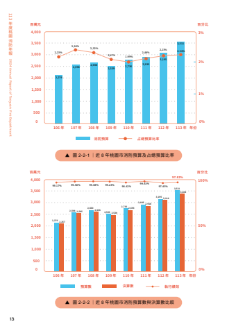 13113%u5e74%u5ea6%u6843%u5712%u6d88%u9632%u5e74%u58312024 Annual Report of Taoyuan Fire Department0 0%1%2%3%%u767e%u5206%u6bd45001,0001,5002,0002,5003,0003,5004,000106 %u5e74 107 %u5e74 108 %u5e74 109 %u5e74 110 %u5e74 111 %u5e74 112 %u5e74%u6d88%u9632%u9810%u7b97 %u5360%u7e3d%u9810%u7b97%u6bd4%u7387113 %u5e74 %u5e74%u4efd%u767e%u842c%u51432,2762,23%2,36% 2,32%2,07%2,08%2,23%1.99%2,598 2,6602,539 2,736 2,9353,1953,5112.24%%u25b6 %u5716 2-2-2 %uff5c%u8fd1 8 %u5e74%u6843%u5712%u5e02%u6d88%u9632%u9810%u7b97%u6578%u8207%u6c7a%u7b97%u6578%u6bd4%u8f03%u25b6 %u5716 2-2-1 %uff5c%u8fd1 8 %u5e74%u6843%u5712%u5e02%u6d88%u9632%u9810%u7b97%u53ca%u5360%u7e3d%u9810%u7b97%u6bd4%u73870 0%50%100%%u767e%u5206%u6bd45001,0001,5002,0002,5003,0003,5004,000106 %u5e74 107 %u5e74 108 %u5e74 109 %u5e74 110 %u5e74 111 %u5e74 112 %u5e74%u9810%u7b97%u6578 %u6c7a%u7b97%u6578 %u57f7%u884c%u7e3e%u6548113 %u5e74 %u5e74%u4efd%u767e%u842c%u51432,276 2,25799.17% 99.50% 99.08% 99.23% 98.42%99.43%97.45%97.82%2,598 2,5852,660 2,636 2,539 2,5202,736 2,6932,935 2,9183,195 3,1143,5113,434