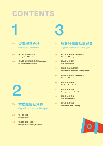 02 %u7b2c%u4e00%u7bc0 %u706b%u707d%u6982%u6cc1%u5206%u6790Analysis of Fire Hazard04 %u7b2c%u4e8c%u7bc0 %u98b1%u6d2a%u707d%u5bb3%u6982%u6cc1%u5206%u6790 Analysis of Typhoon and Flood06 %u7b2c%u4e00%u7bc0 %u7d44%u7e54Organization12 %u7b2c%u4e8c%u7bc0 %u9810%u7b97%u3001%u6c7a%u7b97Budget and Closing Account16 %u7b2c%u4e00%u7bc0 %u707d%u5bb3%u7ba1%u7406%uff08%u542b%u707d%u5bb3%u9632%u6551%uff09Disaster Management21 %u7b2c%u4e8c%u7bc0 %u706b%u707d%u9810%u9632Fire Prevention26 %u7b2c%u4e09%u7bc0 %u5371%u96aa%u7269%u54c1%u7ba1%u7406Hazardous Materials Management31 %u7b2c%u56db%u7bc0 %u707d%u5bb3%u6436%u6551%uff08%u542b%u7279%u7a2e%u641c%u6551%uff09Disaster Rescue59 %u7b2c%u4e94%u7bc0 %u6c11%u529b%u904b%u7528Civilian Coordination65 %u7b2c%u516d%u7bc0 %u7dca%u6025%u6551%u8b77Emergency Medical Service71 %u7b2c%u4e03%u7bc0 %u706b%u707d%u8abf%u67e5Fire Investigation81 %u7b2c%u516b%u7bc0 %u6559%u80b2%u8a13%u7df4Education and Training%u707d%u5bb3%u6982%u6cc1%u5206%u6790Disaster Overview02 1606 %u672c%u5c40%u7d44%u7e54%u53ca%u9810%u7b97Organization and Budget%u65bd%u653f%u8a08%u756b%u91cd%u9ede%u8207%u6210%u679cOrganization and Budget123CONTENTS