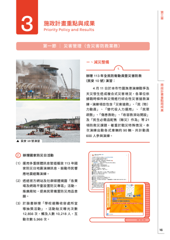 %u7b2c%u4e09%u7ae0%u65bd%u653f%u8a08%u756b%u91cd%u9ede%u8207%u6210%u679c16%u7b2c%u4e00%u7bc0 %uff5c %u707d%u5bb3%u7ba1%u7406%uff08%u542b%u707d%u5bb3%u9632%u6551%u696d%u52d9%uff09%u3127%u3001%u6e1b%u707d%u6574%u5099%u8fa6%u7406 113 %u5e74%u5168%u6c11%u9632%u885b%u52d5%u54e1%u66a8%u707d%u5bb3%u9632%u6551%uff08%u6c11%u5b89 10 %u865f%uff09%u6f14%u7fd2%uff1a4 %u6708 11 %u65e5%u65bc%u672c%u5e02%u7af9%u570d%u6f01%u6e2f%u6f14%u7df4%u6230%u722d%u53ca%u5929%u707d%u767c%u751f%u9020%u6210%u8907%u5408%u5f0f%u707d%u5bb3%u5883%u6cc1%uff0c%u5404%u55ae%u4f4d%u4f9d%u64da%u6230%u6642%u689d%u4ef6%u8207%u707d%u60c5%u9032%u884c%u7d9c%u5408%u6027%u707d%u5bb3%u6436%u6551%u6f14%u7df4%u3002%u6f14%u7df4%u9805%u76ee%u5305%u542b%u300c%u707d%u5bb3%u6436%u6551%u300d%u3001%u300c%u6c11%uff08%u7269%uff09%u529b%u52d5%u54e1%u300d%u3001%u300c%u66ff%u4ee3%u5f79%u4eba%u529b%u904b%u7528%u300d%u3001%u300c%u6c11%u773e%u758f%u6563%u300d%u3001%u300c%u50b7%u60a3%u6551%u52a9%u300d%u3001%u300c%u6536%u5bb9%u6551%u6fdf%u7ad9%u958b%u8a2d%u300d%u53ca%u300c%u6c11%u751f%u5fc5%u9700%u54c1%u914d%u552e%uff08%u8cd1%u707d%uff09%u4f5c%u70ba%u300d%u7b49 21%u9805%u9632%u6551%u707d%u8ab2%u984c%uff0c%u8457%u91cd%u65bc%u6230%u707d%u7279%u6b8a%u60c5%u6cc1%uff0c%u672c%u6b21%u6f14%u7df4%u51fa%u52d5%u5404%u5f0f%u8eca%u8f1b%u7d04 90 %u8f1b%u3001%u5171%u8a08%u52d5%u54e1600 %u4eba%u53c3%u8207%u6f14%u7df4%u3002%u8fa6%u7406%u570b%u5bb6%u9632%u707d%u65e5%u6d3b%u52d5%uff081%uff09%u904b%u7528%u591a%u91cd%u5a92%u9ad4%u8a0a%u606f%u7ba1%u9053%u64ad%u653e 113 %u5e74%u570b%u5bb6%u9632%u707d%u65e5%u5730%u9707%u6f14%u7df4%u8a0a%u606f%uff0c%u9f13%u52f5%u5e02%u6c11%u97ff%u61c9%u5730%u9707%u907f%u96e3%u6f14%u7df4%u3002%uff082%uff09%u900f%u904e%u5b98%u65b9%u7db2%u7ad9%u53ca%u793e%u7fa4%u5a92%u9ad4%u63ed%u9732%u300c%u5404%u8ce3%u5834%u53ca%u7db2%u8def%u5e73%u81fa%u8a2d%u7f6e%u9632%u707d%u5c08%u5340%u300d%u6d3b%u52d5%uff0c%u63a8%u5ee3%u5468%u77e5%uff0c%u63d0%u9ad8%u6c11%u773e%u5099%u7f6e%u9632%u707d%u7528%u54c1%u610f%u9858%u3002%uff083%uff09%u65bc%u81c9%u66f8%u8fa6%u7406%u300c%u5b78%u6821%u907f%u96e3%u6536%u5bb9%u8655%u6240%u5ba3%u5c0e%u62bd%u734e%u6d3b%u52d5%u300d%uff0c%u6d3b%u52d5%u8cbc%u6587%u66dd%u5149%u6b21%u657812,856 %u6b21%uff0c%u89f8%u53ca%u4eba%u6578 10,218 %u4eba%uff0c%u4e92%u52d5%u6b21%u6578 5,966 %u6b21%u30021.2.%u25bc %u6c11%u5b89 10 %u865f%u6f14%u7fd2%u65bd%u653f%u8a08%u756b%u91cd%u9ede%u8207%u6210%u679c 3 Priority Policy and Results