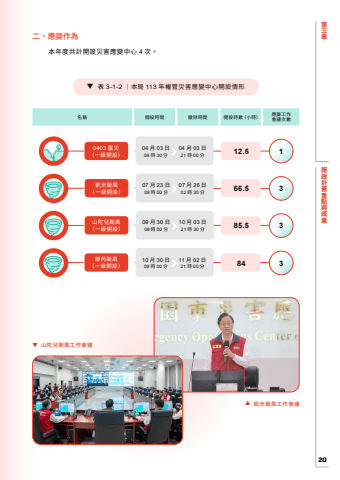 %u7b2c%u4e09%u7ae0%u65bd%u653f%u8a08%u756b%u91cd%u9ede%u8207%u6210%u679c20%u7b2c%u4e09%u7ae0%u65bd%u653f%u8a08%u756b%u91cd%u9ede%u8207%u6210%u679c%u25b6 %u8868 3-1-2 %uff5c%u672c%u5c40 113 %u5e74%u6b0a%u7ba1%u707d%u5bb3%u61c9%u8b8a%u4e2d%u5fc3%u958b%u8a2d%u60c5%u5f62%u4e8c%u3001%u61c9%u8b8a%u4f5c%u70ba%u672c%u5e74%u5ea6%u5171%u8a08%u958b%u8a2d%u707d%u5bb3%u61c9%u8b8a%u4e2d%u5fc3 4 %u6b21%u3002%u540d%u7a31 %u958b%u8a2d%u6642%u9593 %u64a4%u9664%u6642%u9593 %u958b%u8a2d%u6642%u6578%uff08%u5c0f%u6642%uff09 %u61c9%u8b8a%u5de5%u4f5c%u6703%u8b70%u6b21%u65780403 %u9707%u707d%uff08%u4e00%u7d1a%u958b%u8a2d%uff09%u51f1%u7c73%u98b1%u98a8%uff08%u4e00%u7d1a%u958b%u8a2d%uff09%u5c71%u9640%u5152%u98b1%u98a8%uff08%u4e00%u7d1a%u958b%u8a2d%uff09%u5eb7%u82ae%u98b1%u98a8%uff08%u4e00%u7d1a%u958b%u8a2d%uff0904 %u6708 03 %u65e508 %u6642 30 %u520604 %u6708 03 %u65e521 %u6642 00 %u520607 %u6708 23 %u65e508 %u6642 00 %u520607 %u6708 26 %u65e502 %u6642 30 %u520609 %u6708 30 %u65e508 %u6642 00 %u520610 %u6708 03 %u65e521 %u6642 30 %u520610 %u6708 30 %u65e509 %u6642 00 %u520611 %u6708 02 %u65e521 %u6642 00 %u520612.5 166.5 385.5 384 3%u25bc %u5c71%u9640%u5152%u98b1%u98a8%u5de5%u4f5c%u6703%u8b70%u25bc %u51f1%u7c73%u98b1%u98a8%u5de5%u4f5c%u6703%u8b70