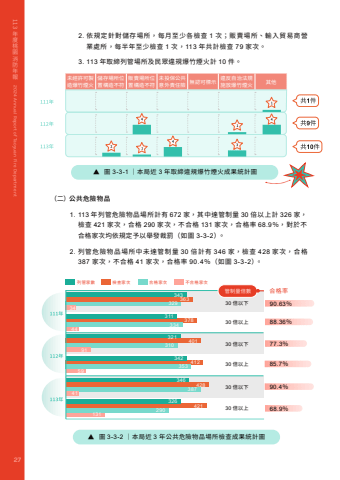 27 113%u5e74%u5ea6%u6843%u5712%u6d88%u9632%u5e74%u58312024 Annual Report of Taoyuan Fire Department%u25b6 %u5716 3-3-1 %uff5c%u672c%u5c40%u8fd1 3 %u5e74%u53d6%u7de0%u9055%u898f%u7206%u7af9%u7159%u706b%u6210%u679c%u7d71%u8a08%u5716%u25b6 %u5716 3-3-2 %uff5c%u672c%u5c40%u8fd1 3 %u5e74%u516c%u5171%u5371%u96aa%u7269%u54c1%u5834%u6240%u6aa2%u67e5%u6210%u679c%u7d71%u8a08%u5716%u672a%u7d93%u8a31%u53ef%u88fd%u9020%u7206%u7af9%u7159%u706b%u5132%u5b58%u5834%u6240%u4f4d%u7f6e%u69cb%u9020%u4e0d%u7b26%u8ca9%u8ce3%u5834%u6240%u4f4d%u7f6e%u69cb%u9020%u4e0d%u7b26%u672a%u6295%u4fdd%u516c%u5171%u610f%u5916%u8cac%u4efb%u96aa %u7121%u8a8d%u53ef%u6a19%u793a %u9055%u53cd%u81ea%u6cbb%u6cd5%u898f%u65bd%u653e%u7206%u7af9%u7159%u706b %u5176%u4ed6%uff08%u4e8c%uff09%u516c%u5171%u5371%u96aa%u7269%u54c11. 113 %u5e74%u5217%u7ba1%u5371%u96aa%u7269%u54c1%u5834%u6240%u8a08%u6709 672 %u5bb6%uff0c%u5176%u4e2d%u9054%u7ba1%u5236%u91cf 30 %u500d%u4ee5%u4e0a%u8a08 326 %u5bb6%uff0c%u6aa2%u67e5 421 %u5bb6%u6b21%uff0c%u5408%u683c 290 %u5bb6%u6b21%uff0c%u4e0d%u5408%u683c 131 %u5bb6%u6b21%uff0c%u5408%u683c%u7387 68.9%uff05%uff0c%u5c0d%u65bc%u4e0d%u5408%u683c%u5bb6%u6b21%u5747%u4f9d%u898f%u5b9a%u4e88%u4ee5%u8209%u767c%u88c1%u7f70%uff08%u5982%u5716 3-3-2%uff09%u30022. %u5217%u7ba1%u5371%u96aa%u7269%u54c1%u5834%u6240%u4e2d%u672a%u9054%u7ba1%u5236%u91cf 30 %u500d%u8a08%u6709 346 %u5bb6%uff0c%u6aa2%u67e5 428 %u5bb6%u6b21%uff0c%u5408%u683c387 %u5bb6%u6b21%uff0c%u4e0d%u5408%u683c 41 %u5bb6%u6b21%uff0c%u5408%u683c%u7387 90.4%uff05%uff08%u5982%u5716 3-3-2%uff09%u30022. %u4f9d%u898f%u5b9a%u91dd%u5c0d%u5132%u5b58%u5834%u6240%uff0c%u6bcf%u6708%u81f3%u5c11%u5404%u6aa2%u67e5 1 %u6b21%uff1b%u8ca9%u8ce3%u5834%u6240%u3001%u8f38%u5165%u8cbf%u6613%u5546%u71df%u696d%u8655%u6240%uff0c%u6bcf%u534a%u5e74%u81f3%u5c11%u6aa2%u67e5 1 %u6b21%uff0c113 %u5e74%u5171%u8a08%u6aa2%u67e5 79 %u5bb6%u6b21%u30023. 113 %u5e74%u53d6%u7de0%u5217%u7ba1%u5834%u6240%u53ca%u6c11%u773e%u9055%u898f%u7206%u7af9%u7159%u706b%u8a08 10 %u4ef6%u300230 %u500d%u4ee5%u4e0b30 %u500d%u4ee5%u4e0b30 %u500d%u4ee5%u4e0b30 %u500d%u4ee5%u4e0a30 %u500d%u4ee5%u4e0a30 %u500d%u4ee5%u4e0a%u7ba1%u5236%u91cf%u500d%u65783463213433113783344436332934342412353401310913264212901314159428387%u5408%u683c%u738790.63%uff0588.36%uff0577.3%uff0585.7%uff0590.4%uff0568.9%uff05%u5217%u7ba1%u5bb6%u6578 %u6aa2%u67e5%u5bb6%u6b21 %u5408%u683c%u5bb6%u6b21 %u4e0d%u5408%u683c%u5bb6%u6b21
