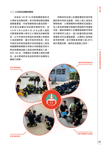 %u7b2c%u4e09%u7ae0%u65bd%u653f%u8a08%u756b%u91cd%u9ede%u8207%u6210%u679c32%uff08%u4e8c%uff09%u706b%u707d%u5b89%u5168%u8a13%u7df4%u521d%u968e%u73ed%u672c%u5c40%u81ea 107 %u5e74 10 %u6708%u8d77%u9678%u7e8c%u8fa6%u7406%u5404%u5f0f%u706b%u5834%u5b89%u5168%u8a13%u7df4%u73ed%u671f%uff0c%u5176%u4e2d%u8fa6%u7406%u521d%u968e%u73ed%u8ab2%u7a0b%u7d93%u9a57%u6700%u8c50%u5bcc%u3001%u5167%u5bb9%u767c%u5c55%u7a0b%u5ea6%u4e5f%u6700%u70ba%u6210%u719f%u3002%u672c%u5e74%u5ea6%u4ea6%u5ef6%u7e8c%u5f80%u5e74%u8a13%u7df4%u76ee%u6a19%u8207%u5b97%u65e8%uff0c%u81ea113 %u5e74 3 %u6708 4 %u65e5 %u5230 4 %u6708 12 %u65e5%u6b62%u5047%u516b%u5fb7%u9632%u707d%u6559%u80b2%u9928%u8fa6%u7406 6 %u68af%u6b21%u4e4b%u706b%u5834%u5b89%u5168%u8a13%u7df4%u521d%u968e%u73ed%uff0c%u4ee5%u4eca%u5e74%u5ea6%u5c1a%u672a%u53d7%u904e%u672c%u9805%u8a13%u7df4%u4e4b%u65b0%u9032%u540c%u4ec1%u70ba%u8a13%u7df4%u5c0d%u8c61%u3001%u81fa%u5317%u5e02%u653f%u5e9c%u6d88%u9632%u5c40%u3001%u65b0%u5317%u5e02%u653f%u5e9c%u6d88%u9632%u5c40%u53ca%u57fa%u9686%u5e02%u6d88%u9632%u5c40%u9074%u6d3e%u4eba%u54e1%u53ca%u6843%u5712%u570b%u969b%u6a5f%u5834%u80a1%u4efd%u6709%u9650%u516c%u53f8%u822a%u52d9%u8655%u6d88%u9632%u5927%u968a%u53ca%u6843%u5712%u7149%u6cb9%u5ee0%u5de5%u5b89%u7d44%u6d88%u9632%u968a%u9074%u6d3e%u4eba%u54e1%uff0c%u5171%u8a08 163 %u540d%uff0c%u6301%u7e8c%u5f37%u5316%u53ca%u63a8%u5ee3%u706b%u5834%u5b89%u5168%u89c0%u5ff5%uff0c%u4e26%u4ee5%u74b0%u5883%u8a55%u4f30%u53ca%u5ef6%u9577%u5f85%u6551%u4f5c%u70ba%u8ab2%u7a0b%u4e3b%u8ef8%u9032%u884c%u8a13%u7df4%u3002%u5f92%u624b%u6551%u63f4%u7df4%u7fd2%u5b89%u5168%u7ba1%u5236%u5be6%u4f5c%u4fb7%u9650%u7a7a%u9593%u7a7f%u8d8a%u8aaa%u660e%u706b%u5834%u975e%u9810%u671f%u72c0%u6cc1%u8655%u7f6e%u521d%u968e%u73ed%u5305%u542b%u500b%u4eba%u9632%u8b77%u88dd%u5099%u8207%u7a7a%u6c23%u547c%u5438%u5668%u7684%u64cd%u4f5c%u548c%u72c0%u6cc1%u8655%u7f6e%u3001%u6d88%u9632%u4eba%u54e1%u5165%u5ba4%u5b89%u5168%u7ba1%u5236%u5236%u5ea6%u3001%u706b%u5834%u9810%u671f%u8207%u975e%u9810%u671f%u72c0%u6cc1%u8655%u7f6e%u4ee5%u53ca%u4eba%u54e1%u81ea%u6551%u8207%u5925%u4f34%u6551%u63f4%u7684%u60c5%u5883%u64cd%u4f5c%u7b49%u8ab2%u7a0b%u5167%u5bb9%uff0c%u85c9%u7531%u8a13%u7df4%u540c%u4ec1%u5728%u906d%u9047%u6975%u7aef%u4e8b%u4ef6%u6642%u4fdd%u6301%u51b7%u975c%u601d%u8003%u4e4b%u80fd%u529b%uff0c%u6e1b%u5c11%u6c23%u91cf%u6d88%u8017%u4e26%u5224%u65b7%u73fe%u5834%u72c0%u6cc1%u4f5c%u51fa%u9069%u7576%u8655%u7f6e%uff0c%u4ee5%u671f%u540c%u4ec1%u80fd%u5920%u5ef6%u9577%u5f85%u6551%u6642%u9593%uff0c%u4e26%u5f15%u5c0e%u7dca%u6025%u6551%u63f4%u5c0f%u7d44 (RIT)%u57f7%u884c%u6551%u63f4%u4efb%u52d9%uff0c%u9054%u5230%u5b89%u5168%u812b%u56f0%u4e4b%u76ee%u7684%u3002