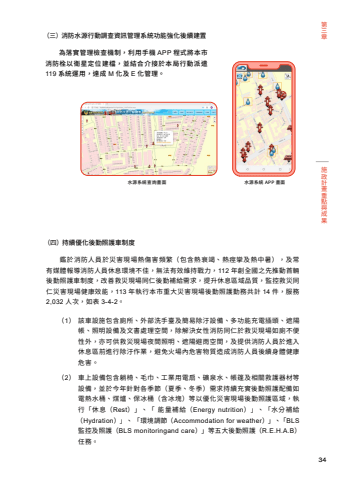 34%u65bd%u653f%u8a08%u756b%u91cd%u9ede%u8207%u6210%u679c%u7b2c%u4e09%u7ae0%uff08%u4e09%uff09%u6d88%u9632%u6c34%u6e90%u884c%u52d5%u8abf%u67e5%u8cc7%u8a0a%u7ba1%u7406%u7cfb%u7d71%u529f%u80fd%u5f37%u5316%u5f8c%u7e8c%u5efa%u7f6e%u70ba%u843d%u5be6%u7ba1%u7406%u6aa2%u67e5%u6a5f%u5236%uff0c%u5229%u7528%u624b%u6a5f APP %u7a0b%u5f0f%u5c07%u672c%u5e02%u6d88%u9632%u6813%u4ee5%u885b%u661f%u5b9a%u4f4d%u5efa%u6a94%uff0c%u4e26%u7d50%u5408%u4ecb%u63a5%u65bc%u672c%u5c40%u884c%u52d5%u6d3e%u9063119 %u7cfb%u7d71%u904b%u7528%uff0c%u9054%u6210 M %u5316%u53ca E %u5316%u7ba1%u7406%u3002%uff08%u56db%uff09%u6301%u7e8c%u512a%u5316%u5f8c%u52e4%u7167%u8b77%u8eca%u5236%u5ea6%u9451%u65bc%u6d88%u9632%u4eba%u54e1%u65bc%u707d%u5bb3%u73fe%u5834%u71b1%u50b7%u5bb3%u983b%u7e41%uff08%u5305%u542b%u71b1%u8870%u7aed%u3001%u71b1%u75d9%u6523%u53ca%u71b1%u4e2d%u6691%uff09%uff0c%u53ca%u5e38%u6709%u5a92%u9ad4%u5831%u5c0e%u6d88%u9632%u4eba%u54e1%u4f11%u606f%u74b0%u5883%u4e0d%u4f73%uff0c%u7121%u6cd5%u6709%u6548%u7dad%u6301%u6230%u529b%uff0c112 %u5e74%u5275%u5168%u570b%u4e4b%u5148%u63a8%u52d5%u9996%u8f1b%u5f8c%u52e4%u7167%u8b77%u8eca%u5236%u5ea6%uff0c%u6539%u5584%u6551%u707d%u73fe%u5834%u540c%u4ec1%u5f8c%u52e4%u88dc%u7d66%u9700%u6c42%uff0c%u63d0%u5347%u4f11%u606f%u5340%u57df%u54c1%u8cea%uff0c%u76e3%u63a7%u6551%u707d%u540c%u4ec1%u707d%u5bb3%u73fe%u5834%u5065%u5eb7%u6548%u80fd%uff0c113 %u5e74%u57f7%u884c%u672c%u5e02%u91cd%u5927%u707d%u5bb3%u73fe%u5834%u5f8c%u52e4%u7167%u8b77%u52e4%u52d9%u5171%u8a08 14 %u4ef6%uff0c%u670d%u52d92,032 %u4eba%u6b21%uff0c%u5982%u8868 3-4-2%u3002%uff081%uff09 %u8a72%u8eca%u8a2d%u65bd%u5305%u542b%u5ec1%u6240%u3001%u5916%u90e8%u6d17%u624b%u81fa%u53ca%u7c21%u6613%u9664%u6c59%u8a2d%u5099%u3001%u591a%u529f%u80fd%u5145%u96fb%u63d2%u982d%u3001%u906e%u967d%u5e33%u3001%u7167%u660e%u8a2d%u5099%u53ca%u6587%u66f8%u8655%u7406%u7a7a%u9593%uff0c%u9664%u89e3%u6c7a%u5973%u6027%u6d88%u9632%u540c%u4ec1%u65bc%u6551%u707d%u73fe%u5834%u5982%u5ec1%u4e0d%u4fbf%u6027%u5916%uff0c%u4ea6%u53ef%u4f9b%u6551%u707d%u73fe%u5834%u591c%u9593%u7167%u660e%u3001%u906e%u967d%u907f%u96e8%u7a7a%u9593%uff0c%u53ca%u63d0%u4f9b%u6d88%u9632%u4eba%u54e1%u65bc%u9032%u5165%u4f11%u606f%u5340%u524d%u9032%u884c%u9664%u6c59%u4f5c%u696d%uff0c%u907f%u514d%u706b%u5834%u5167%u5371%u5bb3%u7269%u8cea%u9020%u6210%u6d88%u9632%u4eba%u54e1%u5f8c%u7e8c%u8eab%u9ad4%u5065%u5eb7%u5371%u5bb3%u3002%uff082%uff09 %u8eca%u4e0a%u8a2d%u5099%u5305%u542b%u8eba%u6905%u3001%u6bdb%u5dfe%u3001%u5de5%u696d%u7528%u96fb%u6247%u3001%u7926%u6cc9%u6c34%u3001%u5e33%u7bf7%u53ca%u76f8%u95dc%u6551%u8b77%u5668%u6750%u7b49%u8a2d%u5099%uff0c%u4e26%u65bc%u4eca%u5e74%u91dd%u5c0d%u5404%u5b63%u7bc0%uff08%u590f%u5b63%u3001%u51ac%u5b63%uff09%u9700%u6c42%u6301%u7e8c%u5145%u5be6%u5f8c%u52e4%u7167%u8b77%u914d%u5099%u5982%u96fb%u71b1%u6c34%u6876%u3001%u7164%u7210%u3001%u4fdd%u51b0%u6876%uff08%u542b%u51b0%u584a%uff09%u7b49%u4ee5%u512a%u5316%u707d%u5bb3%u73fe%u5834%u5f8c%u52e4%u7167%u8b77%u5340%u57df%uff0c%u57f7%u884c%u300c%u4f11%u606f%uff08Rest%uff09%u300d%u3001%u300c %u80fd%u91cf%u88dc%u7d66%uff08Energy nutrition%uff09%u300d%u3001%u300c%u6c34%u5206%u88dc%u7d66%uff08Hydration%uff09%u300d%u3001%u300c%u74b0%u5883%u8abf%u7bc0%uff08Accommodation for weather%uff09%u300d%u3001%u300cBLS%u76e3%u63a7%u53ca%u7167%u8b77%uff08BLS monitoringand care%uff09%u300d%u7b49%u4e94%u5927%u5f8c%u52e4%u7167%u8b77%uff08R.E.H.A.B%uff09%u4efb%u52d9%u3002%u6c34%u6e90%u7cfb%u7d71%u67e5%u8a62%u756b%u9762 %u6c34%u6e90%u7cfb%u7d71 APP %u756b%u9762
