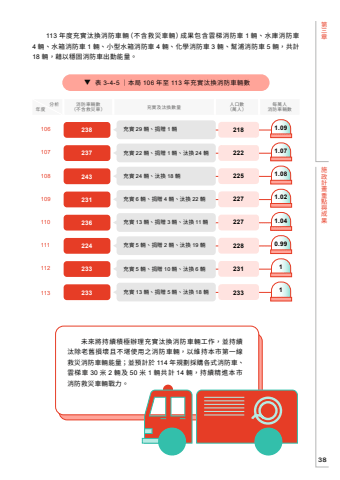 %u7b2c%u4e09%u7ae0%u65bd%u653f%u8a08%u756b%u91cd%u9ede%u8207%u6210%u679c38%u25b6 %u8868 3-4-5 %uff5c%u672c%u5c40 106 %u5e74%u81f3 113 %u5e74%u5145%u5be6%u6c70%u63db%u6d88%u9632%u8eca%u8f1b%u6578%u5206%u6790%u5e74%u5ea6%u6d88%u9632%u8eca%u8f1b%u6578%uff08%u4e0d%u542b%u6551%u707d%u8eca%uff09 %u5145%u5be6%u53ca%u6c70%u63db%u6578%u91cf %u4eba%u53e3%u6578%uff08%u842c%u4eba%uff09%u6bcf%u842c%u4eba%u6d88%u9632%u8eca%u8f1b%u6578238237243231236224233233%u5145%u5be6 29 %u8f1b%u3001%u6350%u8d08 1 %u8f1b%u5145%u5be6 22 %u8f1b%u3001%u6350%u8d08 1 %u8f1b%u3001%u6c70%u63db 24 %u8f1b%u5145%u5be6 24 %u8f1b%u3001%u6c70%u63db 18 %u8f1b%u5145%u5be6 6 %u8f1b%u3001%u6350%u8d08 4 %u8f1b%u3001%u6c70%u63db 22 %u8f1b%u5145%u5be6 13 %u8f1b%u3001%u6350%u8d08 3 %u8f1b%u3001%u6c70%u63db 11 %u8f1b%u5145%u5be6 5 %u8f1b%u3001%u6350%u8d08 2 %u8f1b%u3001%u6c70%u63db 19 %u8f1b%u5145%u5be6 5 %u8f1b%u3001%u6350%u8d08 10 %u8f1b%u3001%u6c70%u63db 6 %u8f1b%u5145%u5be6 13 %u8f1b%u3001%u6350%u8d08 5 %u8f1b%u3001%u6c70%u63db 18 %u8f1b2182222252272272282312331.091.071.081.021.040.9911106107108109110111112113%u672a%u4f86%u5c07%u6301%u7e8c%u7a4d%u6975%u8fa6%u7406%u5145%u5be6%u6c70%u63db%u6d88%u9632%u8eca%u8f1b%u5de5%u4f5c%uff0c%u4e26%u6301%u7e8c%u6c70%u9664%u8001%u820a%u640d%u58de%u4e14%u4e0d%u582a%u4f7f%u7528%u4e4b%u6d88%u9632%u8eca%u8f1b%uff0c%u4ee5%u7dad%u6301%u672c%u5e02%u7b2c%u4e00%u7dda%u6551%u707d%u6d88%u9632%u8eca%u8f1b%u80fd%u91cf%uff1b%u4e26%u9810%u8a08%u65bc 114 %u5e74%u898f%u5283%u63a1%u8cfc%u5404%u5f0f%u6d88%u9632%u8eca%u3001%u96f2%u68af%u8eca 30 %u7c73 2 %u8f1b%u53ca 50 %u7c73 1 %u8f1b%u5171%u8a08 14 %u8f1b%uff0c%u6301%u7e8c%u7cbe%u9032%u672c%u5e02%u6d88%u9632%u6551%u707d%u8eca%u8f1b%u6230%u529b%u3002113 %u5e74%u5ea6%u5145%u5be6%u6c70%u63db%u6d88%u9632%u8eca%u8f1b%uff08%u4e0d%u542b%u6551%u707d%u8eca%u8f1b%uff09%u6210%u679c%u5305%u542b%u96f2%u68af%u6d88%u9632%u8eca 1 %u8f1b%u3001%u6c34%u5eab%u6d88%u9632%u8eca4 %u8f1b%u3001%u6c34%u7bb1%u6d88%u9632%u8eca 1 %u8f1b%u3001%u5c0f%u578b%u6c34%u7bb1%u6d88%u9632%u8eca 4 %u8f1b%u3001%u5316%u5b78%u6d88%u9632%u8eca 3 %u8f1b%u3001%u5e6b%u6d66%u6d88%u9632%u8eca 5 %u8f1b%uff0c%u5171%u8a0818 %u8f1b%uff0c%u85c9%u4ee5%u7a69%u56fa%u6d88%u9632%u8eca%u51fa%u52e4%u80fd%u91cf%u3002