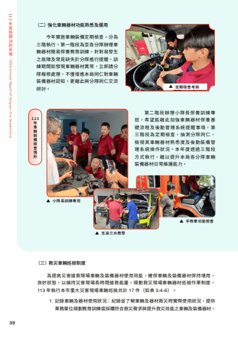 39113%u5e74%u5ea6%u6843%u5712%u6d88%u9632%u5e74%u58312024 Annual Report of Taoyuan Fire Department%u25bc %u4e94%u6cb9%u4e09%u6c34%u6559%u5b78%u25bc %u624b%u715e%u8eca%u529f%u80fd%u6aa2%u67e5%uff08%u4e09%uff09%u6551%u707d%u8eca%u8f1b%u5de1%u6aa2%u5236%u5ea6%u70ba%u63d0%u9ad8%u707d%u5bb3%u6436%u6551%u73fe%u5834%u8eca%u8f1b%u53ca%u88dd%u5099%u5668%u6750%u4f7f%u7528%u6548%u80fd%uff0c%u78ba%u4fdd%u8eca%u8f1b%u53ca%u88dd%u5099%u5668%u6750%u4fdd%u6301%u582a%u7528%u3001%u826f%u597d%u72c0%u614b%uff0c%u4ee5%u7dad%u6301%u707d%u5bb3%u73fe%u5834%u9577%u6642%u9593%u6436%u6551%u80fd%u91cf%uff0c%u898f%u5283%u6551%u707d%u73fe%u5834%u8eca%u8f1b%u5668%u6750%u5de1%u6aa2%u4f5c%u696d%u5236%u5ea6%uff0c113 %u5e74%u57f7%u884c%u672c%u5e02%u91cd%u5927%u707d%u5bb3%u73fe%u5834%u8eca%u8f1b%u5de1%u6aa2%u5171%u8a08 17 %u4ef6%uff08%u5982%u8868 3-4-6%uff09%u30021. %u8a18%u9304%u8eca%u8f1b%u53ca%u5668%u6750%u4f7f%u7528%u72c0%u6cc1%uff1a%u7d00%u9304%u4e26%u4e86%u89e3%u8eca%u8f1b%u53ca%u5668%u6750%u6551%u707d%u6642%u5be6%u969b%u4f7f%u7528%u72c0%u6cc1%uff0c%u63d0%u4f9b%u696d%u52d9%u55ae%u4f4d%u898f%u5283%u6559%u80b2%u8a13%u7df4%u6216%u63a1%u8cfc%u7b26%u5408%u6551%u707d%u9700%u6c42%u8207%u63d0%u5347%u6551%u707d%u6548%u80fd%u4e4b%u8eca%u8f1b%u53ca%u88dd%u5099%u5668%u6750%u3002113%u5e74%u8eca%u8f1b%u88dd%u5099%u6aa2%u67e5%u60c5%u5f62%u7b2c%u4e8c%u968e%u6bb5%u8fa6%u7406%u5c0f%u968a%u9577%u4fdd%u990a%u8a13%u7df4%u5c08%u73ed%uff0c%u5e0c%u671b%u80fd%u85c9%u6b64%u52a0%u5f37%u8eca%u8f1b%u5668%u6750%u4fdd%u990a%u57fa%u790e%u6d41%u7a0b%u53ca%u5f8c%u52e4%u7ba1%u7406%u7cfb%u7d71%u63d0%u9192%u4e8b%u9805%u3002%u7b2c%u4e09%u968e%u6bb5%u70ba%u5b9a%u671f%u6aa2%u67e5%uff0c%u62bd%u6e2c%u5206%u968a%u540c%u4ec1%uff0c%u6aa2%u8996%u5176%u8eca%u8f1b%u5668%u6750%u719f%u6089%u5ea6%u53ca%u5f8c%u52e4%u88dd%u5099%u7ba1%u7406%u7cfb%u7d71%u64cd%u4f5c%u72c0%u6cc1%u3002%u672c%u5e74%u5ea6%u900f%u904e%u4e09%u968e%u6bb5%u65b9%u5f0f%u57f7%u884c%uff0c%u85c9%u4ee5%u63d0%u5347%u672c%u5c40%u5404%u5206%u968a%u8eca%u8f1b%u88dd%u5099%u5668%u6750%u65e5%u5e38%u7dad%u8b77%u80fd%u529b%u3002%u25bc %u5c0f%u968a%u9577%u8a13%u7df4%u5c08%u73ed%uff08%u4e8c%uff09%u5f37%u5316%u8eca%u8f1b%u5668%u6750%u529f%u80fd%u719f%u6089%u53ca%u904b%u7528%u4eca%u5e74%u5be6%u65bd%u8eca%u8f1b%u88dd%u5099%u5b9a%u671f%u6aa2%u67e5%uff0c%u5206%u70ba%u4e09%u968e%u57f7%u884c%u3002%u7b2c%u4e00%u968e%u6bb5%u70ba%u81f3%u5404%u5206%u968a%u8fa6%u7406%u8eca%u8f1b%u5668%u6750%u7c21%u6613%u4fdd%u990a%u6559%u80b2%u8a13%u7df4%uff0c%u91dd%u5c0d%u6613%u767c%u751f%u4e4b%u6545%u969c%u53ca%u5e38%u898b%u7f3a%u5931%u65bc%u5206%u968a%u9032%u884c%u63d0%u9192%uff0c%u8a13%u7df4%u671f%u9593%u5982%u767c%u73fe%u8eca%u8f1b%u5668%u6750%u7570%u5e38%uff0c%u7acb%u5373%u8acb%u5206%u968a%u5831%u4fee%u8655%u7406%uff0c%u4e0d%u50c5%u589e%u9032%u672c%u5c40%u540c%u4ec1%u5c0d%u8eca%u8f1b%u88dd%u5099%u5668%u6750%u8a8d%u77e5%uff0c%u66f4%u85c9%u6b64%u8207%u5206%u968a%u540c%u4ec1%u4ea4%u6d41%u7814%u8a0e%u3002%u25bc %u5b9a%u671f%u6aa2%u67e5%u8003%u8a62