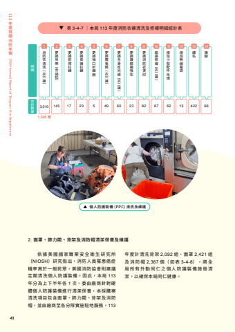 113%u5e74%u5ea6%u6843%u5712%u6d88%u9632%u5e74%u58312024 Annual Report of Taoyuan Fire Department41%u4f9d%u64da%u7f8e%u570b%u570b%u5bb6%u8077%u696d%u5b89%u5168%u885b%u751f%u7814%u7a76%u6240%uff08NIOSH%uff09%u7814%u7a76%u6307%u51fa%uff0c%u6d88%u9632%u4eba%u54e1%u7f79%u60a3%u764c%u75c7%u6a5f%u7387%u9ad8%u65bc%u4e00%u822c%u6c11%u773e%uff0c%u7f8e%u570b%u6d88%u9632%u5354%u6703%u5247%u5efa%u8b70%u5b9a%u671f%u6e05%u6d17%u500b%u4eba%u9632%u8b77%u88dd%u5099%u3002%u56e0%u6b64%uff0c%u672c%u5c40 113%u5e74%u5206%u70ba%u4e0a%u4e0b%u534a%u5e74%u5404 1 %u6b21%uff0c%u59d4%u7531%u5ee0%u5546%u91dd%u5c0d%u786c%u9ad4%u500b%u4eba%u9632%u8b77%u88dd%u5099%u9032%u884c%u6e05%u6f54%u4fdd%u990a%uff0c%u672c%u63a1%u8cfc%u6848%u6e05%u6d17%u9805%u76ee%u5305%u542b%u9762%u7f69%u3001%u80ba%u529b%u95a5%u3001%u80cc%u67b6%u53ca%u6d88%u9632%u5e3d%uff0c%u4e26%u7531%u5ee0%u5546%u81f3%u5404%u5206%u968a%u5be6%u65bd%u99d0%u5730%u670d%u52d9%uff0c1132. %u9762%u7f69%u3001%u80ba%u529b%u95a5%u3001%u80cc%u67b6%u53ca%u6d88%u9632%u5e3d%u6e05%u6f54%u4fdd%u990a%u53ca%u7dad%u8b77%u25bc %u500b%u4eba%u9632%u8b77%u88dd%u5099 (PPC) %u6e05%u6d17%u53ca%u7dad%u8b77%u25b6 %u8868 3-4-7 %uff5c%u672c%u5c40 113 %u5e74%u5ea6%u6d88%u9632%u8863%u8932%u6e05%u6d17%u53ca%u4fee%u88dc%u660e%u7d30%u7d71%u8a08%u8868%u6d88%u9632%u8863%u6e05%u6d17 %ufe35%u8863%ufe36 %ufe35%u8932%ufe36 %u660e%u7d30%u5408%u8a08%u6578%u91cf1%u66f4%u63db%u540a%u5e36 %ufe35%u542b%u63d2%u6263%ufe362%u66f4%u63db%u524d%u895f%u62c9%u934a3%u66f4%u63db%u9577%u8932%u62c9%u934a4%u66f4%u63db%u8896%u53e3%u91dd%u7e54%u81555%u66f4%u63db%u9b54%u9b3c%u6c08 %ufe35%u8863%ufe36 %ufe35%u8932%ufe366%u66f4%u63db%u5168%u8eab%u53cd%u5149%u689d %ufe35%u8863%ufe36 %ufe35%u8932%ufe367%u66f4%u63db%u8b77%u819d%u88dc%u5f37%u5e038%u66f4%u63db%u6d88%u9632%u8863%u71d9%u53709%u7834%u640d%u4fee%u88dc %ufe35%u8863%ufe36 %ufe35%u8932%ufe3610%u589e%u52a0%u5c0f%u578b%u914d%u4ef6%u540a%u74b011%u589e%u52a0%u7121%u7dda%u96fb%u888b12%u7e61%u540d13%u8932%u8173143,010 145 17 23 5 49 60 23 82 87 62 13 422 961,505 %u5957%u5e74%u5ea6%u8a08%u6e05%u6d17%u80cc%u67b6 2,092 %u7d44%u3001%u9762%u7f69 2,421 %u7d44%u53ca%u6d88%u9632%u5e3d 2,387 %u500b%uff08 %u5982 %u8868 3-4-8%uff09%uff0c %u5c07 %u5168%u5c40%u6240%u6709%u5916%u52e4%u540c%u4ec1%u4e4b%u500b%u4eba%u9632%u8b77%u88dd%u5099%u65bd%u505a%u6e05%u6f54%uff0c%u4ee5%u78ba%u4fdd%u672c%u5c40%u540c%u4ec1%u5065%u5eb7%u3002