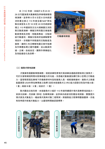45113%u5e74%u5ea6%u6843%u5712%u6d88%u9632%u5e74%u58312024 Annual Report of Taoyuan Fire Department%u9818%u72ac%u54e1%u53ca%u72ac%u96bb%u8a13%u7df4%u72ac%u96bb%u6aa2%u6e2c%u8a8d%u8b49%u901a%u904e%uff08%u4e09%uff09%u641c%u6551%u72ac%u79fb%u5730%u8a13%u7df4%u72ac%u96bb%u64c1%u6709%u6975%u9748%u654f%u55c5%u89ba%u7d30%u80de%uff0c%u82e5%u7d93%u8a13%u7df4%u6709%u7d20%u9818%u72ac%u54e1%u8a13%u7df4%u4e26%u901a%u904e%u8a8d%u8b49%u6aa2%u6e2c%u4e4b%u641c%u6551%u72ac%uff0c%u53ef%u65bc%u707d%u5bb3%u73fe%u5834%u77ed%u6642%u9593%u5167%u767c%u63ee%u76f8%u7576%u5927%u7684%u529f%u80fd%uff0c%u53e6%u6191%u85c9%u72ac%u96bb%u654f%u6377%u53ca%u947d%u884c%u72f9%u5c0f%u7a7a%u9593%u4e4b%u884c%u52d5%u80fd%u529b%uff0c%u7576%u767c%u73fe%u53d7%u56f0%u74e6%u792b%u5806%u4e0b%u7684%u50b7%u60a3%u5373%u5420%u53eb%u544a%u77e5%u641c%u6551%u4eba%u54e1%uff0c%u76f8%u8f03%u641c%u7d22%u5668%u6750%uff0c%u641c%u6551%u72ac%u4e4b%u6551%u63f4%u80fd%u91cf%u66f4%u662f USAR %u968a%u4f0d%u5c08%u696d%u5ea6%u4e4b%u6307%u6a19%uff08%u76ee%u524d%u672c%u5c40%u641c%u6551%u72ac%u4e4b IRO %u80fd%u529b%u8a8d%u8b49%u5206%u5225%u70ba%u4e2d%u7d1a A %u7d1a%uff1a1 %u96bb%uff1b%u9ad8%u7d1a B %u7d1a%uff1a3 %u96bb%uff1b%u57f9%u8a13%u72ac%uff1a1 %u96bb%uff09%u3002%u99b4%u72ac%u89c0%u5ff5%u65e5%u5c31%u6708%u5c07%uff0c%u672c%u5c40%u641c%u6551%u72ac%u5c0f%u7d44%u65bc 113 %u5e74%u5ea6%u6301%u7e8c%u63d0%u5347%u9818%u72ac%u54e1%u5c08%u696d%u57f9%u8a13%u80fd%u529b%uff0c%u5b89%u6392%u65e5%u8a13%u7df4%u3001%u6708%u8a13%u7df4%uff08%u79fb%u5730%uff09%u53ca%u5c08%u696d%u8a13%u7df4%uff0c%u4e26%u53c3%u8207%u5167%u653f%u90e8%u6d88%u9632%u7f72%u5404%u9805%u6e2c%u9a57%uff0c%u96d9%u96d9%u63d0%u5347%u9818%u72ac%u54e1%u53ca%u72ac%u96bb%u80fd%u529b%uff0c%u85c9%u7531%u9818%u72ac%u54e1%u8207%u72ac%u96bb%u4e8c%u8005%u9ed8%u5951%uff0c%u5c07%u641c%u6551%u80fd%u529b%u767c%u63ee%u5f97%u76e1%u5584%u76e1%u7f8e%uff0c%u4ea6%u80fd%u6709%u6548%u7387%u63d0%u5347%u65b0%u9032%u72ac%u96bb%u80fd%u529b%uff0c%u4ee5%u6700%u77ed%u6642%u9593%u9054%u8a8d%u8b49%u6a19%u6e96%u3002%u884c%u52d5%u57fa%u5730%u67b6%u8a2d%u652f%u6490%u4f5c%u696d%u672c%uff08113%uff09%u5e74%u5ea6%uff0c%u672c%u5c40%u65bc 6 %u6708 25 %u65e5%u300126 %u65e5%u7af9%u570d%u6f01%u6e2f%u5929%u5e55%u5ee3%u5834%u53ca%u505c%u8eca%u5834%u8fa6%u7406%u60c5%u5883%u6f14%u7df4%uff0c%u4e26%u53c3%u8207 9 %u6708 6 %u65e5%u81f3 8 %u65e5%u5167%u653f%u90e8%u6d88%u9632%u7f72%u4e3b%u8fa6%u4e4b 113 %u5e74%u5ea6%u5168%u570b NAP %u968a%u4f0d%u806f%u5408%u6f14%u7fd2%u53ca 9 %u6708 18 %u65e5%u81f3 20 %u65e5%u5167%u653f%u90e8%u8fa6%u7406%u4e4b 113 %u5e74%u570b%u5bb6%u9632%u707d%u65e5%u5927%u898f%u6a21%u9707%u707d%u6d88%u9632%u6551%u707d%u52d5%u54e1%u6f14%u7df4%uff0c%u6a21%u64ec%u707d%u6642%u5b8c%u6574%u707d%u5bb3%u6436%u6551%u52d5%u54e1%u60c5%u5883%u53ca%u6d41%u7a0b%uff0c%u9664%u52d5%u54e1%u96c6%u7d50%u3001%u707d%u9ede%u67b6%u8a2d%u884c%u52d5%u57fa%u5730%u3001%u6a21%u64ec%u707d%u5340%u653f%u5e9c%u5354%u8abf%u806f%u7e6b%u7b49%u9805%u76ee%u5916%uff0c%u4ea6%u898f%u5283%u4e0d%u540c%u7a0b%u5ea6%u7684%u707d%u9ede%u52d8%u67e5%u53ca%u641c%u6551%uff0c%u8b93%u540c%u4ec1%u5145%u5206%u77ad%u89e3%u5730%u9707%u707d%u5bb3%u4e2d%u6307%u63ee%u53ca%u4f5c%u696d%u9ad4%u7cfb%u9593%u4e4b%u904b%u4f5c%u908f%u8f2f%uff0c%u4e26%u4ee5%u52d5%u54e1%u5feb%u901f%u3001%u6b63%u78ba%u3001%u81ea%u7d66%u81ea%u8db3%u3001%u5718%u968a%u4f5c%u696d%u6a21%u7d44%u5316%u53ca%u6548%u80fd%u6700%u4f73%u5316%u70ba%u76ee%u6a19%u3002