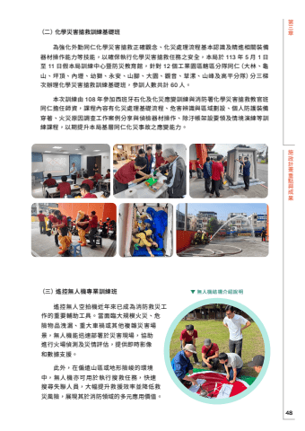 %u7b2c%u4e09%u7ae0%u65bd%u653f%u8a08%u756b%u91cd%u9ede%u8207%u6210%u679c48%uff08%u4e8c%uff09%u5316%u5b78%u707d%u5bb3%u6436%u6551%u8a13%u7df4%u57fa%u790e%u73ed%u70ba%u5f37%u5316%u5916%u52e4%u540c%u4ec1%u5316%u5b78%u707d%u5bb3%u6436%u6551%u6b63%u78ba%u89c0%u5ff5%u3001%u5316%u707d%u8655%u7406%u6d41%u7a0b%u57fa%u672c%u8a8d%u8b58%u53ca%u7cbe%u9032%u76f8%u95dc%u88dd%u5099%u5668%u6750%u64cd%u4f5c%u80fd%u529b%u7b49%u6280%u80fd%uff0c%u4ee5%u78ba%u4fdd%u57f7%u884c%u5316%u5b78%u707d%u5bb3%u6436%u6551%u4efb%u52d9%u4e4b%u5b89%u5168%uff0c%u672c%u5c40%u65bc 113 %u5e74 5 %u6708 1 %u65e5%u81f3 11 %u65e5%u5047%u672c%u5c40%u8a13%u7df4%u4e2d%u5fc3%u66a8%u9632%u707d%u6559%u80b2%u9928%uff0c%u91dd%u5c0d 12 %u500b%u5de5%u696d%u5712%u5340%u8f44%u5340%u5206%u968a%u540c%u4ec1%uff08%u5927%u6797%u3001%u9f9c%u5c71%u3001%u576a%u9802%u3001%u5167%u58e2%u3001%u5e7c%u7345%u3001%u6c38%u5b89%u3001%u5c71%u8173%u3001%u5927%u5712%u3001%u89c0%u97f3%u3001%u8349%u6f2f%u3001%u5c71%u5cf0%u53ca%u9ad8%u5e73%u5206%u968a%uff09%u5206%u4e09%u68af%u6b21%u8fa6%u7406%u5316%u5b78%u707d%u5bb3%u6436%u6551%u8a13%u7df4%u57fa%u790e%u73ed%uff0c%u53c3%u8a13%u4eba%u6578%u5171%u8a08 60 %u4eba%u3002%u672c%u6b21%u8a13%u7df4%u7531 108 %u5e74%u53c3%u52a0%u897f%u73ed%u7259%u77f3%u5316%u53ca%u5316%u707d%u61c9%u8b8a%u8a13%u7df4%u8207%u6d88%u9632%u7f72%u5316%u5b78%u707d%u5bb3%u6436%u6551%u6559%u5b98%u73ed%u540c%u4ec1%u64d4%u4efb%u5e2b%u8cc7%uff0c%u8ab2%u7a0b%u5167%u5bb9%u6709%u5316%u707d%u8655%u7406%u57fa%u790e%u6d41%u7a0b%u3001%u5371%u5bb3%u8fa8%u8b58%u8207%u5340%u57df%u5283%u8a2d%u3001%u500b%u4eba%u9632%u8b77%u88dd%u5099%u7a7f%u8457%u3001%u706b%u707d%u539f%u56e0%u8abf%u67e5%u5de5%u4f5c%u6848%u4f8b%u5206%u4eab%u8207%u5075%u6aa2%u5668%u6750%u64cd%u4f5c%u3001%u9664%u6c59%u5e33%u67b6%u8a2d%u8981%u9818%u53ca%u60c5%u5883%u6f14%u7df4%u7b49%u8a13%u7df4%u8ab2%u7a0b%uff0c%u4ee5%u671f%u63d0%u5347%u672c%u5c40%u57fa%u5c64%u540c%u4ec1%u5316%u707d%u4e8b%u6545%u4e4b%u61c9%u8b8a%u80fd%u529b%u3002%uff08%u4e09%uff09%u9059%u63a7%u7121%u4eba%u6a5f%u5c08%u696d%u8a13%u7df4%u73ed%u9059%u63a7%u7121%u4eba%u7a7a%u62cd%u6a5f%u8fd1%u5e74%u4f86%u5df2%u6210%u70ba%u6d88%u9632%u6551%u707d%u5de5%u4f5c%u7684%u91cd%u8981%u8f14%u52a9%u5de5%u5177%u3002%u7576%u9762%u81e8%u5927%u898f%u6a21%u706b%u707d%u3001%u5371%u96aa%u7269%u54c1%u6d29%u6f0f%u3001%u91cd%u5927%u8eca%u798d%u6216%u5176%u4ed6%u8907%u96dc%u707d%u5bb3%u5834%u666f%uff0c%u7121%u4eba%u6a5f%u80fd%u8fc5%u901f%u90e8%u7f72%u65bc%u707d%u5bb3%u73fe%u5834%uff0c%u5354%u52a9%u9032%u884c%u706b%u5834%u5075%u6e2c%u53ca%u707d%u60c5%u8a55%u4f30%uff0c%u63d0%u4f9b%u5373%u6642%u5f71%u50cf%u548c%u6578%u64da%u652f%u63f4%u3002%u6b64%u5916%uff0c%u5728%u504f%u9060%u5c71%u5340%u6216%u5730%u5f62%u96aa%u5cfb%u7684%u74b0%u5883%u4e2d%uff0c%u7121%u4eba%u6a5f%u4ea6%u53ef%u7528%u65bc%u57f7%u884c%u641c%u6551%u4efb%u52d9%uff0c%u5feb%u901f%u641c%u5c0b%u5931%u806f%u4eba%u54e1%uff0c%u5927%u5e45%u63d0%u5347%u6551%u63f4%u6548%u7387%u4e26%u964d%u4f4e%u6551%u707d%u98a8%u96aa%uff0c%u5c55%u73fe%u5176%u65bc%u6d88%u9632%u9818%u57df%u7684%u591a%u5143%u61c9%u7528%u50f9%u503c%u3002%u25bc %u7121%u4eba%u6a5f%u7d50%u69cb%u4ecb%u7d39%u8aaa%u660e