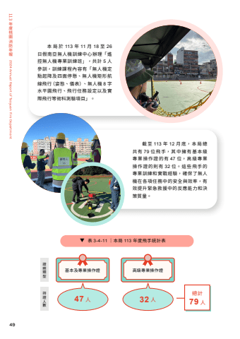 49113%u5e74%u5ea6%u6843%u5712%u6d88%u9632%u5e74%u58312024 Annual Report of Taoyuan Fire Department%u25b6 %u8868 3-4-11 %uff5c%u672c%u5c40 113 %u5e74%u5ea6%u98db%u624b%u7d71%u8a08%u8868%u672c%u5c40%u65bc 113 %u5e74 11 %u6708 18 %u81f3 26%u65e5%u5047%u5357%u4e9e%u7121%u4eba%u6a5f%u8a13%u7df4%u4e2d%u5fc3%u8fa6%u7406%u300c%u9059%u63a7%u7121%u4eba%u6a5f%u5c08%u696d%u8a13%u7df4%u73ed%u300d%uff0c%u5171%u8a08 5 %u4eba%u53c3%u8a13%uff0c%u8a13%u7df4%u8ab2%u7a0b%u5167%u5bb9%u6709%u300c%u7121%u4eba%u6a5f%u5b9a%u9ede%u8d77%u964d%u53ca%u56db%u9762%u505c%u61f8%u3001%u7121%u4eba%u6a5f%u77e9%u5f62%u822a%u7dda%u98db%u884c%uff08%u59ff%u614b%u3001%u5100%u8868%uff09%u3001%u7121%u4eba%u6a5f 8 %u5b57%u6c34%u5e73%u5713%u98db%u884c%u3001%u98db%u884c%u4efb%u52d9%u8a2d%u5b9a%u4ee5%u53ca%u5be6%u969b%u98db%u884c%u7b49%u8853%u79d1%u6e2c%u9a57%u9805%u76ee%u300d%u3002%u622a %u81f3 113 %u5e74 12 %u6708 %u5e95%uff0c %u672c %u5c40 %u7e3d%u5171 %u6709 79 %u4f4d%u98db%u624b%uff0c%u5176%u4e2d%u64c1%u6709%u57fa%u672c%u7d1a%u5c08%u696d%u64cd%u4f5c%u8b49%u7684%u6709 47 %u4f4d%uff0c%u9ad8%u7d1a%u5c08%u696d%u64cd%u4f5c%u8b49%u7684%u5247%u6709 32 %u4f4d%u3002%u9019%u4e9b%u98db%u624b%u7684%u5c08%u696d%u8a13%u7df4%u548c%u5be6%u6230%u7d93%u9a57%uff0c%u78ba%u4fdd%u4e86%u7121%u4eba%u6a5f%u5728%u5404%u9805%u4efb%u52d9%u4e2d%u7684%u5b89%u5168%u8207%u6548%u7387%uff0c%u6709%u6548%u63d0%u5347%u7dca%u6025%u6551%u63f4%u4e2d%u7684%u53cd%u61c9%u80fd%u529b%u548c%u6c7a%u7b56%u8cea%u91cf%u3002%u57fa%u672c%u53ca%u5c08%u696d%u64cd%u4f5c%u8b4947 %u4eba%u9ad8%u7d1a%u5c08%u696d%u64cd%u4f5c%u8b4932 %u4eba%u8b49%u7167%u985e%u578b%u6301%u8b49%u4eba%u657879 %u4eba%u7e3d%u8a08