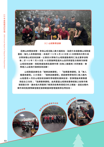 53113%u5e74%u5ea6%u6843%u5712%u6d88%u9632%u5e74%u58312024 Annual Report of Taoyuan Fire Department%u56e0%u61c9%u5c71%u6797%u958b%u653e%u653f%u7b56%uff0c%u53c3%u8207%u5c71%u57df%u6d3b%u52d5%u4eba%u6578%u5927%u5e45%u589e%u52a0%uff0c%u70ba%u63d0%u5347%u672c%u5c40%u6574%u5099%u5c71%u57df%u6551%u63f4%u91cf%u80fd%uff0c%u5f37%u5316%u4eba%u547d%u6551%u63f4%u6548%u80fd%uff0c%u672c%u5c40%u65bc 113 %u5e74 4 %u6708 22 %u65e5%u81f3 23 %u65e5%u5047%u7b2c%u56db%u5927%u968a%u5927%u6eaa%u5206%u968a%u8fa6%u7406%u5c71%u57df%u6280%u8853%u8a13%u7df4%uff0c%u4ee5%u7b2c%u56db%u5927%u968a%u57f7%u884c%u5c71%u57df%u6551%u63f4%u52e4%u52d9%u540c%u4ec1%u70ba%u4e3b%u8981%u53c3%u8a13%u5c0d%u8c61%uff1b%u65bc 113 %u5e74 7 %u6708 9 %u65e5%u81f3 19 %u65e5%u5047%u5fa9%u8208%u5340%u63d2%u5929%u5c71%u81ea%u7136%u4fdd%u7559%u5340%u5206%u5169%u68af%u6b21%u8fa6%u7406%u5c71%u57df%u6280%u8853%u8a13%u7df4%uff0c%u642d%u914d%u6551%u63f4%u6307%u63ee%u53ca%u5e55%u50da%u4f5c%u696d%uff08%u542b%u7121%u4eba%u6a5f%u904b%u7528%uff09%u5171%u540c%u5be6%u65bd%uff0c%u5be6%u969b%u9032%u5165%u5c71%u5340%u57f7%u884c%u641c%u7d22%u6280%u8853%u8a13%u7df4%u3002%u5c71%u57df%u6551%u63f4%u8a13%u7df4%u5305%u542b%u300c%u641c%u7d22%u8a13%u7df4%u8ab2%u7a0b%u300d%u3001%u300c%u6307%u63ee%u5e55%u50da%u8ab2%u7a0b%u300d%u53ca%u300c%u7121%u4eba%u6a5f%u904b%u7528%u8ab2%u7a0b%u300d%u4e09%u5927%u9805%u76ee%uff0c%u300c%u641c%u7d22%u8a13%u7df4%u8ab2%u7a0b%u300d%u900f%u904e%u5be6%u969b%u5e36%u9818%u540c%u4ec1%u9032%u5165%u8f44%u5167%u5c71%u5340%u61c9%u7528 4 %u6708%u4efd%u5c71%u57df%u6280%u8853%u8a13%u7df4%u6240%u5b78%u76f8%u95dc%u77e5%u8b58%u8207%u6280%u8853%uff0c%u767c%u63ee%u7406%u8ad6%u8207%u5be6%u52d9%u904b%u7528%u7d50%u5408%u4e4b%u529f%u6548%uff1b%u300c%u6307%u63ee%u5e55%u50da%u8ab2%u7a0b%u300d%u7531%u5177%u8c50%u5bcc%u5c71%u57df%u4e8b%u6545%u5e55%u50da%u7d93%u9a57%u4e4b%u5404%u7e23%u5e02%u6559%u5b98%u7d93%u9a57%u5206%u4eab%uff0c%u8b93%u672c%u5c40%u5927%u968a%u5e55%u50da%u4e86%u89e3%u8cc7%u8a0a%u6536%u96c6%u8207%u8996%u57df%u5206%u6790%u4e4b%u7406%u8ad6%uff0c%u4e26%u7d50%u5408%u8f44%u5167%u6848%u4ef6%u8207%u5730%u9ede%u5be6%u969b%u7df4%u7fd2%u5283%u5b9a%u641c%u7d22%u7bc4%u570d%u8207%u7ba1%u7406%u641c%u6551%u968a%u4f0d%u7b49%u6280%u8853%u3002%uff08%u4e03%uff09%u5c71%u57df%u5c08%u696d%u8a13%u7df4%u641c%u7d22%u8a13%u7df4%u8ab2%u7a0b%u5404%u68af%u6b21%u5408%u5f71 %u6307%u63ee%u5e55%u50da%u8ab2%u7a0b%u5c71%u57df%u6280%u8853%u8a13%u7df4