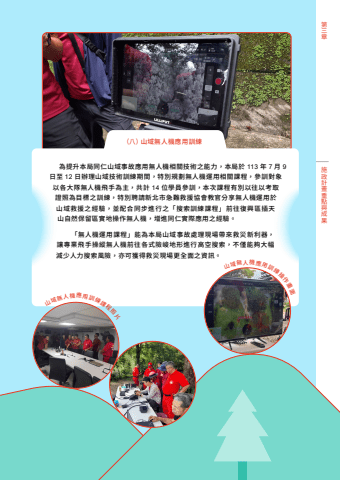 %u7b2c%u4e09%u7ae0%u65bd%u653f%u8a08%u756b%u91cd%u9ede%u8207%u6210%u679c54%u70ba%u63d0%u5347%u672c%u5c40%u540c%u4ec1%u5c71%u57df%u4e8b%u6545%u61c9%u7528%u7121%u4eba%u6a5f%u76f8%u95dc%u6280%u8853%u4e4b%u80fd%u529b%uff0c%u672c%u5c40%u65bc 113 %u5e74 7 %u6708 9%u65e5%u81f3 12 %u65e5%u8fa6%u7406%u5c71%u57df%u6280%u8853%u8a13%u7df4%u671f%u9593%uff0c%u7279%u5225%u898f%u5283%u7121%u4eba%u6a5f%u904b%u7528%u76f8%u95dc%u8ab2%u7a0b%uff0c%u53c3%u8a13%u5c0d%u8c61%u4ee5%u5404%u5927%u968a%u7121%u4eba%u6a5f%u98db%u624b%u70ba%u4e3b%uff0c%u5171%u8a08 14 %u4f4d%u5b78%u54e1%u53c3%u8a13%uff0c%u672c%u6b21%u8ab2%u7a0b%u6709%u5225%u4ee5%u5f80%u4ee5%u8003%u53d6%u8b49%u7167%u70ba%u76ee%u6a19%u4e4b%u8a13%u7df4%uff0c%u7279%u5225%u8058%u8acb%u65b0%u5317%u5e02%u6025%u96e3%u6551%u63f4%u5354%u6703%u6559%u5b98%u5206%u4eab%u7121%u4eba%u6a5f%u904b%u7528%u65bc%u5c71%u57df%u6551%u63f4%u4e4b%u7d93%u9a57%uff0c%u4e26%u914d%u5408%u540c%u6b65%u9032%u884c%u4e4b%u300c%u641c%u7d22%u8a13%u7df4%u8ab2%u7a0b%u300d%u524d%u5f80%u5fa9%u8208%u5340%u63d2%u5929%u5c71%u81ea%u7136%u4fdd%u7559%u5340%u5be6%u5730%u64cd%u4f5c%u7121%u4eba%u6a5f%uff0c%u589e%u9032%u540c%u4ec1%u5be6%u969b%u61c9%u7528%u4e4b%u7d93%u9a57%u3002%u300c%u7121%u4eba%u6a5f%u904b%u7528%u8ab2%u7a0b%u300d%u80fd%u70ba%u672c%u5c40%u5c71%u57df%u4e8b%u6545%u8655%u7406%u73fe%u5834%u5e36%u4f86%u6551%u707d%u65b0%u5229%u5668%uff0c%u8b93%u5c08%u696d%u98db%u624b%u64cd%u7e31%u7121%u4eba%u6a5f%u524d%u5f80%u5404%u5f0f%u96aa%u5cfb%u5730%u5f62%u9032%u884c%u9ad8%u7a7a%u641c%u7d22%uff0c%u4e0d%u50c5%u80fd%u5920%u5927%u5e45%u6e1b%u5c11%u4eba%u529b%u641c%u7d22%u98a8%u96aa%uff0c%u4ea6%u53ef%u7372%u5f97%u6551%u707d%u73fe%u5834%u66f4%u5168%u9762%u4e4b%u8cc7%u8a0a%u3002%uff08%u516b%uff09%u5c71%u57df%u7121%u4eba%u6a5f%u61c9%u7528%u8a13%u7df4%u5c71%u57df%u7121%u4eba%u6a5f%u61c9%u7528%u8a13%u7df4%u8ab2%u7a0b%u7167%u7247%u5c71%u57df%u7121%u4eba%u6a5f%u61c9%u7528%u8a13%u7df4%u64cd%u4f5c%u756b%u9762