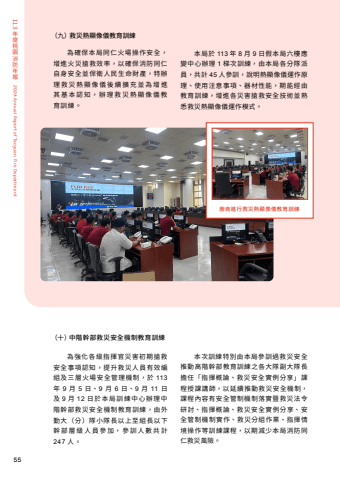 55113%u5e74%u5ea6%u6843%u5712%u6d88%u9632%u5e74%u58312024 Annual Report of Taoyuan Fire Department%uff08%u5341%uff09%u4e2d%u968e%u5e79%u90e8%u6551%u707d%u5b89%u5168%u6a5f%u5236%u6559%u80b2%u8a13%u7df4%uff08%u4e5d%uff09%u6551%u707d%u71b1%u986f%u50cf%u5100%u6559%u80b2%u8a13%u7df4%u70ba%u78ba%u4fdd%u672c%u5c40%u540c%u4ec1%u706b%u5834%u64cd%u4f5c%u5b89%u5168%uff0c%u589e%u9032%u706b%u707d%u6436%u6551%u6548%u7387%uff0c%u4ee5%u78ba%u4fdd%u6d88%u9632%u540c%u4ec1%u81ea%u8eab%u5b89%u5168%u4e26%u4fdd%u885b%u4eba%u6c11%u751f%u547d%u8ca1%u7522%uff0c%u7279%u8fa6%u7406%u6551%u707d%u71b1%u986f%u50cf%u5100%u5f8c%u7e8c%u64f4%u5145%u4e26%u70ba%u589e%u9032%u5176%u57fa%u672c%u8a8d%u77e5%uff0c%u8fa6%u7406%u6551%u707d%u71b1%u986f%u50cf%u5100%u6559%u80b2%u8a13%u7df4%u3002%u70ba%u5f37%u5316%u5404%u7d1a%u6307%u63ee%u5b98%u707d%u5bb3%u521d%u671f%u6436%u6551%u5b89%u5168%u4e8b%u9805%u8a8d%u77e5%uff0c%u63d0%u5347%u6551%u707d%u4eba%u54e1%u6709%u6548%u7de8%u7d44%u53ca%u4e09%u5c64%u706b%u5834%u5b89%u5168%u7ba1%u7406%u6a5f%u5236%uff0c%u65bc 113%u5e74 9 %u6708 5 %u65e5%u30019 %u6708 6 %u65e5%u30019 %u6708 11 %u65e5%u53ca 9 %u6708 12 %u65e5%u65bc%u672c%u5c40%u8a13%u7df4%u4e2d%u5fc3%u8fa6%u7406%u4e2d%u968e%u5e79%u90e8%u6551%u707d%u5b89%u5168%u6a5f%u5236%u6559%u80b2%u8a13%u7df4%uff0c%u7531%u5916%u52e4%u5927%uff08%u5206%uff09%u968a%u5c0f%u968a%u9577%u4ee5%u4e0a%u81f3%u7d44%u9577%u4ee5%u4e0b%u5e79%u90e8%u5c64%u7d1a%u4eba%u54e1%u53c3%u52a0%uff0c%u53c3%u8a13%u4eba%u6578%u5171%u8a08247 %u4eba%u3002%u672c%u6b21%u8a13%u7df4%u7279%u5225%u7531%u672c%u5c40%u53c3%u8a13%u904e%u6551%u707d%u5b89%u5168%u63a8%u52d5%u9ad8%u968e%u5e79%u90e8%u6559%u80b2%u8a13%u7df4%u4e4b%u5404%u5927%u968a%u526f%u5927%u968a%u9577%u64d4%u4efb%u300c%u6307%u63ee%u6982%u8ad6%u3001%u6551%u707d%u5b89%u5168%u5be6%u4f8b%u5206%u4eab%u300d%u8ab2%u7a0b%u6388%u8ab2%u8b1b%u5e2b%uff0c%u4ee5%u5ef6%u7e8c%u63a8%u52d5%u6551%u707d%u5b89%u5168%u6a5f%u5236%uff0c%u8ab2%u7a0b%u5167%u5bb9%u6709%u5b89%u5168%u7ba1%u5236%u6a5f%u5236%u843d%u5be6%u66a8%u6551%u707d%u6cd5%u4ee4%u7814%u8a0e%u3001%u6307%u63ee%u6982%u8ad6%u3001%u6551%u707d%u5b89%u5168%u5be6%u4f8b%u5206%u4eab%u3001%u5b89%u5168%u7ba1%u5236%u6a5f%u5236%u5be6%u4f5c%u3001%u6551%u707d%u5206%u7d44%u4f5c%u696d%u3001%u6307%u63ee%u60c5%u5883%u64cd%u4f5c%u7b49%u8a13%u7df4%u8ab2%u7a0b%uff0c%u4ee5%u671f%u6e1b%u5c11%u672c%u5c40%u6d88%u9632%u540c%u4ec1%u6551%u707d%u98a8%u96aa%u3002%u672c%u5c40%u65bc 113 %u5e74 8 %u6708 9 %u65e5%u5047%u672c%u5c40%u516d%u6a13%u61c9%u8b8a%u4e2d%u5fc3%u8fa6%u7406 1 %u68af%u6b21%u8a13%u7df4%uff0c%u7531%u672c%u5c40%u5404%u5206%u968a%u6d3e%u54e1%uff0c%u5171%u8a08 45 %u4eba%u53c3%u8a13%uff0c%u8aaa%u660e%u71b1%u986f%u50cf%u5100%u904b%u4f5c%u539f%u7406%u3001%u4f7f%u7528%u6ce8%u610f%u4e8b%u9805%u3001%u5668%u6750%u6027%u80fd%uff0c%u671f%u80fd%u7d93%u7531%u6559%u80b2%u8a13%u7df4%uff0c%u589e%u9032%u5404%u707d%u5bb3%u6436%u6551%u5b89%u5168%u6280%u8853%u4e26%u719f%u6089%u6551%u707d%u71b1%u986f%u50cf%u5100%u904b%u4f5c%u6a21%u5f0f%u3002%u5ee0%u5546%u9032%u884c%u6551%u707d%u71b1%u986f%u50cf%u5100%u6559%u80b2%u8a13%u7df4