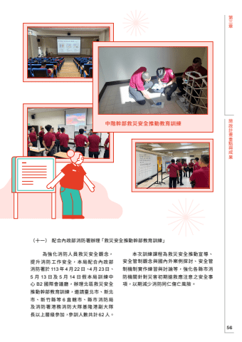 %u7b2c%u4e09%u7ae0%u65bd%u653f%u8a08%u756b%u91cd%u9ede%u8207%u6210%u679c56%uff08%u5341%u4e00%uff09 %u914d%u5408%u5167%u653f%u90e8%u6d88%u9632%u7f72%u8fa6%u7406%u300c%u6551%u707d%u5b89%u5168%u63a8%u52d5%u5e79%u90e8%u6559%u80b2%u8a13%u7df4%u300d%u70ba%u5f37%u5316%u6d88%u9632%u4eba%u54e1%u6551%u707d%u5b89%u5168%u89c0%u5ff5%uff0c%u63d0%u5347%u6d88%u9632%u5de5%u4f5c%u5b89%u5168%uff0c%u672c%u5c40%u914d%u5408%u5167%u653f%u90e8%u6d88%u9632%u7f72%u65bc 113 %u5e74 4 %u6708 22 %u65e5%u30014 %u6708 23 %u65e5%u30015 %u6708 13 %u65e5 %u53ca 5 %u6708 14 %u65e5%u5047%u672c%u5c40%u8a13%u7df4%u4e2d%u5fc3 B2 %u570b%u969b%u6703%u8b70%u5ef3%uff0c%u8fa6%u7406%u5317%u5340%u6551%u707d%u5b89%u5168%u63a8%u52d5%u5e79%u90e8%u6559%u80b2%u8a13%u7df4%uff0c%u9080%u8acb%u81fa%u5317%u5e02%u3001%u65b0%u5317%u5e02%u3001%u65b0%u7af9%u7e23%u7b49 6 %u76f4%u8f44%u5e02%u3001%u7e23%u5e02%u6d88%u9632%u5c40%u53ca%u6d88%u9632%u7f72%u6e2f%u52d9%u6d88%u9632%u5927%u968a%u57fa%u9686%u6e2f%u526f%u5927%u968a%u9577%u4ee5%u4e0a%u5c64%u7d1a%u53c3%u52a0%uff0c%u53c3%u8a13%u4eba%u6578%u5171%u8a08 62 %u4eba%u3002%u672c%u6b21%u8a13%u7df4%u8ab2%u7a0b%u70ba%u6551%u707d%u5b89%u5168%u63a8%u52d5%u5ba3%u5c0e%u3001%u5b89%u5168%u7ba1%u5236%u89c0%u5ff5%u8207%u570b%u5167%u5916%u6848%u4f8b%u63a2%u8a0e%u3001%u5b89%u5168%u7ba1%u5236%u6a5f%u5236%u5be6%u4f5c%u7df4%u7fd2%u8207%u8a0e%u8ad6%u7b49%uff0c%u5f37%u5316%u5404%u7e23%u5e02%u6d88%u9632%u6a5f%u95dc%u91dd%u5c0d%u707d%u5bb3%u521d%u671f%u6436%u6551%u61c9%u6ce8%u610f%u4e4b%u5b89%u5168%u4e8b%u9805%uff0c%u4ee5%u671f%u6e1b%u5c11%u6d88%u9632%u540c%u4ec1%u50b7%u4ea1%u98a8%u96aa%u3002%u4e2d%u968e%u5e79%u90e8%u6551%u707d%u5b89%u5168%u63a8%u52d5%u6559%u80b2%u8a13%u7df4