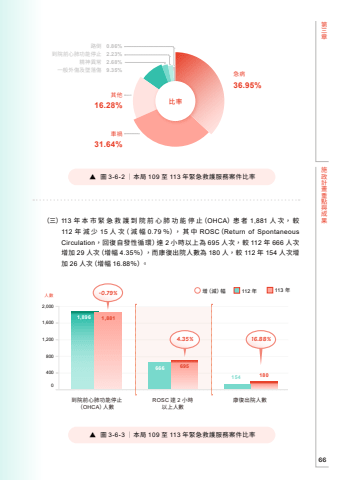 %u7b2c%u4e09%u7ae0%u65bd%u653f%u8a08%u756b%u91cd%u9ede%u8207%u6210%u679c66113 %u5e74180%u25b6 %u5716 3-6-2 %uff5c%u672c%u5c40 109 %u81f3 113 %u5e74%u7dca%u6025%u6551%u8b77%u670d%u52d9%u6848%u4ef6%u6bd4%u7387%u25b6 %u5716 3-6-3 %uff5c%u672c%u5c40 109 %u81f3 113 %u5e74%u7dca%u6025%u6551%u8b77%u670d%u52d9%u6848%u4ef6%u6bd4%u7387%uff08%u4e09%uff09 113 %u5e74 %u672c %u5e02 %u7dca %u6025 %u6551 %u8b77 %u5230 %u9662 %u524d %u5fc3 %u80ba %u529f %u80fd %u505c %u6b62%uff08OHCA%uff09%u60a3 %u8005 1,881 %u4eba %u6b21%uff0c %u8f03112 %u5e74%u6e1b%u5c11 15 %u4eba %u6b21%uff08 %u6e1b %u5e45 0.79 %uff05%uff09%uff0c %u5176 %u4e2d ROSC%uff08Return of Spontaneous Circulation%uff0c%u56de%u5fa9%u81ea%u767c%u6027%u5faa%u74b0%uff09%u9054 2 %u5c0f%u6642%u4ee5%u4e0a%u70ba 695 %u4eba%u6b21%uff0c%u8f03 112 %u5e74 666 %u4eba%u6b21%u589e%u52a0 29 %u4eba%u6b21%uff08%u589e%u5e45 4.35%uff05%uff09%uff0c%u800c%u5eb7%u5fa9%u51fa%u9662%u4eba%u6578%u70ba 180 %u4eba%uff0c%u8f03 112 %u5e74 154 %u4eba%u6b21%u589e%u52a0 26 %u4eba%u6b21%uff08%u589e%u5e45 16.88%uff05%uff09%u30022,0001,6001,2008004000%u589e%uff08%u6e1b%uff09%u5e45 112 %u5e74666154%u6bd4%u7387%u6025%u75c5 36.95%%u5176%u4ed616.28%%u8eca%u798d31.64%%u8def%u5012 0.86%%u5230%u9662%u524d%u5fc3%u80ba%u529f%u80fd%u505c%u6b62 2.23%%u7cbe%u795e%u7570%u5e38 2.68%%u4e00%u822c%u5916%u50b7%u53ca%u589c%u843d%u50b7 9.35%%u5230%u9662%u524d%u5fc3%u80ba%u529f%u80fd%u505c%u6b62%uff08OHCA%uff09%u4eba%u6578ROSC %u9054 2 %u5c0f%u6642%u4ee5%u4e0a%u4eba%u6578%u5eb7%u5fa9%u51fa%u9662%u4eba%u6578%u4eba%u65781,881 1,8966954.35%-0.79%16.88%