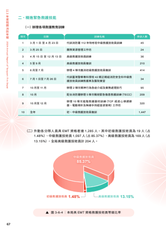 67 113%u5e74%u5ea6%u6843%u5712%u6d88%u9632%u5e74%u58312024 Annual Report of Taoyuan Fire Department%uff08%u4e8c%uff09%u5916%u52e4%u5404%u5206%u968a%u4eba%u54e1%u5177 EMT %u8cc7%u683c%u8005%u9054 1,285 %u4eba%uff0c%u5176%u4e2d%u521d%u7d1a%u6551%u8b77%u6280%u8853%u54e1%u70ba 19 %u4eba%uff08%u53601.48%%uff09%u3001%u4e2d%u7d1a%u6551%u8b77%u6280%u8853%u54e1 1,097 %u4eba%uff08%u5360 85.37%%uff09%u3001%u9ad8%u7d1a%u6551%u8b77%u6280%u8853%u54e1%u70ba 169 %u4eba%uff08%u536013.15%%uff09%uff0c%u5168%u5c40%u9ad8%u7d1a%u6551%u8b77%u6280%u8853%u54e1%u8a08 204 %u4eba%u3002%u4e8c%u3001%u7cbe%u9032%u7dca%u6025%u6551%u8b77%u6280%u80fd%uff08%u4e00%uff09%u8fa6%u7406%u5404%u9805%u6551%u8b77%u6559%u80b2%u8a13%u7df4%u9805%u6b21 %u65e5%u671f %u8a13%u7df4%u540d%u7a31 %u53c3%u8a13%u4eba%u65781 3 %u6708 1 %u65e5 %u81f3 4 %u6708 23 %u65e5 %u4ee3%u8a13%u6d88%u9632%u7f72 112 %u5e74%u7279%u8003%u73ed%u4e2d%u7d1a%u6551%u8b77%u6280%u8853%u54e1%u8a13%u7df4 452 3 %u6708 25 %u65e5 %u5718%u968a%u8cc7%u6e90%u7ba1%u7406%u5de5%u4f5c%u574a 243 4 %u6708 15 %u65e5 %u81f3 12 %u6708 13 %u65e5 %u9ad8%u7d1a%u6551%u8b77%u6280%u8853%u54e1%u8a13%u7df4 364 5 %u81f3 9 %u6708 %u9ad8%u7d1a%u6551%u8b77%u6280%u8853%u54e1%u8907%u8a13 2105 6 %u6708%u81f3 7 %u6708 %u8fa6%u7406 4 %u68af%u6b21%u7fa9%u6d88%u521d%u7d1a%u6551%u8b77%u6280%u8853%u54e1%u8907%u8a13 4146 7 %u6708 1 %u65e5%u81f3 7 %u6708 26 %u65e5 %u4ee3%u8a13%u81fa%u7063%u8b66%u5bdf%u5c08%u79d1%u5b78%u6821 42 %u671f%u6b63%u671f%u7d44%u6d88%u9632%u5b89%u5168%u79d1%u4e2d%u7d1a%u6551%u8b77%u6280%u8853%u54e1%u8a13%u7df4%u6551%u8b77%u8eca%u53ca%u91ab%u9662%u5be6%u7fd2 347 10 %u6708%u81f3 11 %u6708 %u8fa6%u7406 2 %u68af%u6b21%u7cbe%u795e%u884c%u70ba%u6025%u75c7%u4ecb%u7d39%u53ca%u5be6%u52d9%u8655%u7406%u6280%u5de7 958 10 %u6708 %u914d%u5408%u6d88%u9632%u7f72%u8fa6%u7406 5 %u68af%u6b21%u6230%u8853%u7dca%u6025%u50b7%u60a3%u6551%u8b77%u8a13%u7df4%uff08TECC%uff09 2099 10 %u6708%u81f3 12 %u6708 %u8fa6%u7406 10 %u5834%u6b21%u9032%u968e%u6551%u8b77%u5668%u6750%u8a13%u7df4%uff08TCP %u7d93%u76ae%u5fc3%u5f8b%u8abf%u7bc0%u5668%u3001%u96fb%u52d5%u9aa8%u91dd%u53ca%u7121%u7dda%u624b%u6301%u8d85%u97f3%u6ce2%u4f7f%u7528%uff09%u5de5%u4f5c%u574a 32010 %u5168%u5e74 %u521d%u3001%u4e2d%u7d1a%u6551%u8b77%u6280%u8853%u54e1%u8907%u8a13 1,447%u25b6 %u5716 3-6-4 %uff5c%u672c%u5c40%u5177 EMT %u8cc7%u683c%u6551%u8b77%u6280%u8853%u54e1%u7b49%u7d1a%u6bd4%u7387%u521d%u7d1a%u6551%u8b77%u6280%u8853%u54e1 1.48% %u9ad8%u7d1a%u6551%u8b77%u6280%u8853%u54e1 13.15%%u4e2d%u7d1a%u6551%u8b77%u6280%u8853%u54e185.37%