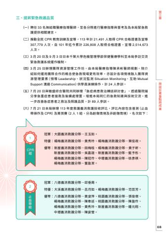 %u7b2c%u4e09%u7ae0%u65bd%u653f%u8a08%u756b%u91cd%u9ede%u8207%u6210%u679c68%uff08%u4e00%uff09%u8058%u4efb 33 %u540d%u7121%u7d66%u8077%u91ab%u7642%u6307%u5c0e%u91ab%u5e2b%uff0c%u81f3%u5404%u5206%u968a%u9032%u884c%u91ab%u7642%u6307%u5c0e%u8207%u7763%u8003%u53ca%u70ba%u672c%u5c40%u7dca%u6025%u6551%u8b77%u63d0%u4f9b%u76f8%u95dc%u5efa%u8a00%u3002%uff08%u4e8c%uff09%u63a8%u52d5%u5168%u6c11 CPR %u6559%u80b2%u8a13%u7df4%u53ca%u5ba3%u5c0e%uff0c113 %u5e74%u8a08 21,491 %u4eba%u53d6%u5f97 CPR %u5408%u683c%u8b49%u66f8%u53ca%u5ba3%u5c0e307,779 %u4eba%u6b21%uff0c%u81ea 101 %u5e74%u8fc4%u4eca%u7d2f%u8a08 226,808 %u4eba%u53d6%u5f97%u5408%u683c%u8b49%u66f8%uff0c%u5ba3%u5c0e 2,514,673%u4eba%u6b21%u3002%uff08%u4e09%uff093 %u6708 20 %u65e5%u53ca 9 %u6708 3 %u65e5%u65e5%u672c%u5343%u8449%u5927%u5b78%u5371%u6a5f%u7ba1%u7406%u5b78%u90e8%u4fdd%u5065%u91ab%u7642%u5b78%u79d1%u81f3%u672c%u5c40%u53c3%u8a2a%u4ea4%u6d41%u7dca%u6025%u6551%u8b77%u7cfb%u7d71%u904b%u4f5c%u6a5f%u5236%u3002%uff08%u56db%uff093 %u6708 25 %u65e5%u8fa6%u7406%u5718%u968a%u8cc7%u6e90%u7ba1%u7406%u5de5%u4f5c%u574a%uff0c%u7531%u672c%u5c40%u91ab%u7642%u6307%u5c0e%u9673%u627f%u5f6c%u91ab%u5e2b%u898f%u5283%uff0c%u9664%u4ecb%u7d39%u5982%u4f55%u904b%u7528%u5718%u968a%u5408%u4f5c%u7684%u6982%u5ff5%u4f7f%u6025%u6551%u73fe%u5834%u66f4%u6709%u6548%u7387%uff0c%u4ea6%u8a2d%u8a08%u5404%u9805%u60c5%u5883%u878d%u5165%u5718%u968a%u8cc7%u6e90 %u7ba1 %u7406 %u8981 %u7d20%uff08%u9818 %u5c0e Leadership%u3001%u72c0%u6cc1%u76e3%u6e2c Situation Monitoring%u3001%u4e92%u52a9 Mutual Support %u6e9d%u901a Communication%uff09%u4f9b%u5b78%u54e1%u6f14%u7df4%u64cd%u4f5c%uff0c%u8a08 24 %u4eba%u53c3%u8a13%u3002%uff08%u4e94%uff097 %u6708 20 %u65e5%u8207%u654f%u76db%u7d9c%u5408%u91ab%u9662%u5171%u540c%u8fa6%u7406%u300c%u6025%u75c7%u75c5%u60a3%u6551%u6cbb%u8f49%u9001%u7814%u8a0e%u6703%u300d%uff0c%u900f%u904e%u91ab%u9662%u7aef%u5206%u4eab%u6025%u91cd%u75c7%u60a3%u8005%u6436%u6551%u53ca%u5f8c%u7e8c%u8655%u7406%u7f6e%uff0c%u589e%u9032%u672c%u5c40%u540c%u4ec1%u7684%u6025%u6551%u77e5%u8b58%u8207%u6280%u8853%u4ea4%u6d41%uff0c%u9032%u4e00%u6b65%u6539%u5584%u6025%u75c7%u60a3%u8005%u4e4b%u6551%u6cbb%u53ca%u7167%u8b77%u54c1%u8cea%uff0c%u8a08 89 %u4eba%u53c3%u8a13%u3002%uff08%u516d%uff097 %u6708 21 %u65e5%u672c%u5c40%u8fa6%u7406 113 %u5e74%u5ea6%u6551%u8b77%u7fa9%u6d88%u6551%u8b77%u6280%u8853%u8a55%u6bd4%uff0c%u8a55%u6bd4%u5167%u5bb9%u5305%u542b%u666e%u6e2c%uff08%u6b62%u8840%u5e36%u64cd%u4f5c%u53ca CPR%uff09%u53ca%u83c1%u82f1%u8cfd%uff082 %u4eba 1 %u7d44%uff0c%u5206%u70ba%u5275%u50b7%u60c5%u5883%u53ca%u975e%u5275%u50b7%u60c5%u5883%uff09%uff0c%u540d%u6b21%u5982%u4e0b%uff1a%u4e09%u3001%u63d0%u6607%u7dca%u6025%u6551%u8b77%u54c1%u8cea%u51a0%u8ecd%uff1a%u5927%u5712%u7fa9%u6d88%u6551%u8b77%u5206%u968a%u2015%u738b%u7389%u5982%u3002%u7279%u512a%uff1a%u694a%u6885%u7fa9%u6d88%u6551%u8b77%u5206%u968a%u2015%u9ec3%u79c0%u73b2%u3001%u694a%u6885%u7fa9%u6d88%u6551%u8b77%u5206%u968a%u2015%u8449%u4f73%u653f%u3002%u512a%u7b49%uff1a%u65b0%u5c4b%u7fa9%u6d88%u6551%u8b77%u5206%u968a%u2015%u7530%u6885%u6842%u3001%u694a%u6885%u7fa9%u6d88%u6551%u8b77%u5206%u968a%u2015%u9ec3%u5b50%u8ed2%u3001%u65b0%u5c4b%u7fa9%u6d88%u6551%u8b77%u5206%u968a%u2015%u5433%u5609%u8abc%u3001%u65b0%u5c4b%u7fa9%u6d88%u6551%u8b77%u5206%u968a%u2015%u85cd%u4e88%u5f64%u3001%u694a%u6885%u7fa9%u6d88%u6551%u8b77%u5206%u968a%u2015%u9673%u51a0%u4f36%u3001%u4e2d%u58e2%u7fa9%u6d88%u6551%u8b77%u5206%u968a%u2015%u5f90%u5f65%u797a%u3001%u694a%u6885%u7fa9%u6d88%u6551%u8b77%u5206%u968a%u2015%u8463%u76c8%u6f54%u3002%u51a0%u8ecd%uff1a%u516b%u5fb7%u7fa9%u6d88%u6551%u8b77%u5206%u968a%u2015%u90b1%u5782%u5468%u3002%u7279%u512a%uff1a%u5927%u6eaa%u7fa9%u6d88%u6551%u8b77%u5206%u968a%u2015%u5442%u6708%u5982%u3001%u694a%u6885%u7fa9%u6d88%u6551%u8b77%u5206%u968a%u2015%u8303%u82b8%u82b3%u3002%u512a%u7b49%uff1a%u516b%u5fb7%u7fa9%u6d88%u6551%u8b77%u5206%u968a%u2015%u9ec3%u59ff%u840d%u3001%u6843%u5712%u7fa9%u6d88%u6551%u8b77%u5206%u968a%u2015%u5f35%u4fca%u5091%u3001%u694a%u6885%u7fa9%u6d88%u6551%u8b77%u5206%u968a%u2015%u9673%u97cb%u5ef7%u3001%u6843%u5712%u7fa9%u6d88%u6551%u8b77%u5206%u968a%u2015%u9673%u76c8%u4f36%u3001%u694a%u6885%u7fa9%u6d88%u6551%u8b77%u5206%u968a%u2015%u9ec3%u79c0%u73b2%u3001%u65b0%u5c4b%u7fa9%u6d88%u6551%u8b77%u5206%u968a%u2015%u937e%u5143%u7fd4%u3001%u4e2d%u58e2%u7fa9%u6d88%u6551%u8b77%u5206%u968a%u2015%u9673%u59ff%u7469%u3002CPR%u7d44%u6b62%u8840%u5e36%u7d4412