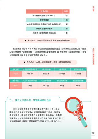 %u7b2c%u4e09%u7ae0%u65bd%u653f%u8a08%u756b%u91cd%u9ede%u8207%u6210%u679c72%u7d71%u8a08%u5e74%u5ea6 %u706b%u707d%u539f%u56e0%u8abf%u67e5%u9451%u5b9a%u66f8 %u706b%u707d%u539f%u56e0%u7d00%u9304 %u706b%u707d%u8b49%u660e%u66f8 %u706b%u707d%u8abf%u67e5%u8cc7%u6599113 %u5e74 165 %u4ef6 1206 %u4ef6 509 %u4ef6 304 %u4ef6%u7d71%u8a08%u5e74%u5ea6 %u706b%u707d%u5316%u5b78%u8b49%u7269%u6848%u4ef6%u6578 %u706b%u707d%u5316%u5b78%u8b49%u7269%u6578 %u96fb%u6c23%u8b49%u7269%u6848%u4ef6%u6578 %u96fb%u6c23%u8b49%u7269%u8b49%u7269%u6578113 %u5e74 73 %u4ef6 102 %u500b 32 %u4ef6 56 %u500b%u25b6 %u8868 3-7-2 %uff5c%u672c%u5c40%u706b%u707d%u539f%u56e0%u8abf%u67e5%u3001%u8b49%u660e%u3001%u8abf%u67e5%u76f8%u95dc%u8cc7%u6599%u25b6 %u8868 3-7-1 %uff5c%u672c%u5c40%u706b%u707d%u8b49%u7269%u9451%u5b9a%u5be6%u9a57%u5ba4%u914d%u7f6e%u8a2d%u5099%u6e05%u55ae%u4e8c%u3001 %u5efa%u7acb%u706b%u707d%u8cc7%u6599%u5eab%uff0c%u843d%u5be6%u6578%u64da%u7d71%u8a08%u5206%u6790%u91dd%u5c0d%u706b%u707d%u6848%u4ef6%u5efa%u7acb%u706b%u707d%u8cc7%u6599%u5eab%u4e26%u9032%u884c%u7d71%u8a08%u5206%u6790%uff0c%u85c9%u4ee5%u77ad%u89e3%u8f44%u5167%u4e4b%u706b%u707d%u72c0%u6cc1%u4ee5%u70ba%u706b%u707d%u9810%u9632%u53ca%u6436%u6551%u4e4b%u53c3%u8003%uff0c%u540c%u6642%u88fd%u4f5c%u706b%u707d%u6848%u4f8b%uff0c%u63d0%u4f9b%u9632%u706b%u5ba3%u5c0e%u4eba%u54e1%u904b%u7528%u6216%u65bc%u672c%u5c40%u7db2%u7ad9%u3001%u7c89%u5c08%u7b49%u5ba3%u5c0e%u7d20%u6750%uff0c%u4ee5%u6e1b%u4f4e%u540c%u985e%u578b%u706b%u707d%u767c%u751f%u3002%u8fd1 5 %u5e74%uff08109 %u81f3 113 %u5e74%uff09%u4e4b%u706b%u707d%u6b21%u6578%u8207%u8d77%u706b%u539f%u56e0%u4e4b%u7d71%u8a08%u8868%u5982%u4e0b%uff08%u5982%u8868 3-7-3%u3001%u5716 3-7-1%uff09%u3002%u8a2d%u5099%u540d%u7a31 %u6578%u91cf%u6c23%u76f8%u5c64%u6790%u8cea%u8b5c%u5100%uff08GC/MSD%uff09 2 %u53f0%u5be6%u9ad4%u986f%u5fae%u93e1 1 %u7d44%u91d1%u76f8%u9451%u5b9a%u8a2d%u5099%uff08%u542b%u7814%u78e8%u62cb%u5149%u6a5f%u53ca%u91d1%u76f8%u986f%u5fae%u93e1%uff09 1 %u5957%u79fb%u52d5%u5f0f%u7a7f%u900f%u5f71%u50cf%u8a2d%u5099 1 %u5957%u5730%u9762%u5f0f 3D %u96f7%u5c04%u74b0%u666f%u6383%u7784%u7cfb%u7d71 1 %u5957%u7d71%u8a08%u672c%u5c40 113 %u5e74%u5171%u88fd%u4f5c 165 %u4ef6%u706b%u707d%u539f%u56e0%u8abf%u67e5%u9451%u5b9a%u66f8%u53ca 1,206 %u4ef6%u706b%u707d%u539f%u56e0%u7d00%u9304%uff0c%u9451%u5b9a%u706b%u707d%u5316%u5b78%u8b49%u7269 73 %u4ef6%u6848%u4ef6%u6578%uff08102 %u500b%u8b49%u7269%u6578%uff09%u53ca%u96fb%u6c23%u8b49%u7269 32 %u4ef6%u6848%u4ef6%u6578%uff0856 %u500b%u8b49%u7269%u6578%uff09%uff0c%u6838%u767c%u706b%u707d%u8b49%u660e%u66f8 509 %u4ef6%u53ca%u706b%u707d%u8abf%u67e5%u8cc7%u6599 304 %u4ef6%u3002