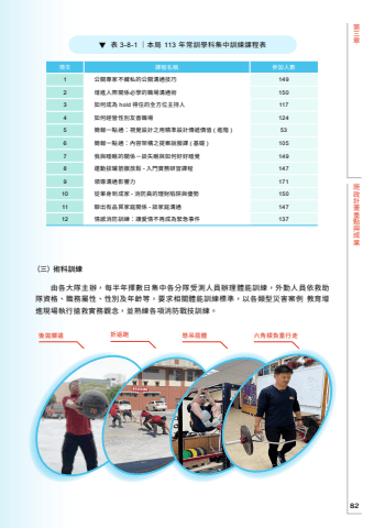 %u7b2c%u4e09%u7ae0%u65bd%u653f%u8a08%u756b%u91cd%u9ede%u8207%u6210%u679c82%u25b6 %u8868 3-8-1 %uff5c%u672c%u5c40 113 %u5e74%u5e38%u8a13%u5b78%u79d1%u96c6%u4e2d%u8a13%u7df4%u8ab2%u7a0b%u8868%u9805%u6b21 %u8ab2%u7a0b%u540d%u7a31 %u53c3%u52a0%u4eba%u65781 %u516c%u95dc%u5c08%u5bb6%u4e0d%u85cf%u79c1%u7684%u516c%u95dc%u6e9d%u901a%u6280%u5de7 1492 %u589e%u9032%u4eba%u969b%u95dc%u4fc2%u5fc5%u5b78%u7684%u8077%u5834%u6e9d%u901a%u8853 1503 %u5982%u4f55%u6210%u70ba hold %u5f97%u4f4f%u7684%u5168%u65b9%u4f4d%u4e3b%u6301%u4eba 1174 %u5982%u4f55%u7d93%u71df%u6027%u5225%u53cb%u5584%u8077%u5834 1245 %u7c21%u5831%u4e00%u9ede%u901a%uff1a%u8996%u89ba%u8a2d%u8a08%u4e4b%u7528%u7cbe%u6e96%u8a2d%u8a08%u50b3%u905e%u50f9%u503c ( %u9032%u968e ) 536 %u7c21%u5831%u4e00%u9ede%u901a%uff1a%u5167%u5bb9%u67b6%u69cb%u4e4b%u63d0%u6848%u8aaa%u670d%u8ab2 ( %u57fa%u790e ) 1057 %u6211%u8207%u7761%u7720%u7684%u95dc%u4fc2%uff0d%u8ac7%u5931%u7720%u8207%u5982%u4f55%u597d%u597d%u7761%u89ba 1498 %u904b%u52d5%u62d4%u7f50%u7b4b%u819c%u653e%u9b06 - %u5165%u9580%u5be6%u52d9%u7814%u7fd2%u8ab2%u7a0b 1479 %u9818%u5c0e%u6e9d%u901a%u5f71%u97ff%u529b 17110 %u5f9e%u55ae%u8eab%u5230%u6210%u5bb6 - %u6d88%u9632%u54e1%u7684%u7406%u8ca1%u9677%u9631%u8207%u512a%u52e2 15011 %u804a%u51fa%u6709%u54c1%u8cea%u5bb6%u5ead%u95dc%u4fc2 - %u8ac7%u5bb6%u5ead%u6e9d%u901a 14712 %u60c5%u611f%u6d88%u9632%u8a13%u7df4%uff1a%u8b93%u611b%u60c5%u4e0d%u518d%u6210%u70ba%u7dca%u6025%u4e8b%u4ef6 137%uff08%u4e09%uff09%u8853%u79d1%u8a13%u7df4%u7531%u5404%u5927%u968a%u4e3b%u8fa6%uff0c%u6bcf%u534a%u5e74%u64c7%u6578%u65e5%u96c6%u4e2d%u5404%u5206%u968a%u53d7%u6e2c%u4eba%u54e1%u8fa6%u7406%u9ad4%u80fd%u8a13%u7df4%uff0c%u5916%u52e4%u4eba%u54e1%u4f9d%u6551%u52a9%u968a%u8cc7%u683c%u3001%u8077%u52d9%u5c6c%u6027%u3001%u6027%u5225%u53ca%u5e74%u9f61%u7b49%uff0c%u8981%u6c42%u76f8%u95dc%u9ad4%u80fd%u8a13%u7df4%u6a19%u6e96%uff0c%u4ee5%u5404%u985e%u578b%u707d%u5bb3%u6848%u4f8b %u6559%u80b2%u589e%u9032%u73fe%u5834%u57f7%u884c%u6436%u6551%u5be6%u52d9%u89c0%u5ff5%uff0c%u4e26%u719f%u7df4%u5404%u9805%u6d88%u9632%u6230%u6280%u8a13%u7df4%u3002%u5f8c%u62cb%u64f2%u9060 %u6298%u8fd4%u8dd1 %u61f8%u540a%u5c48%u9ad4 %u516d%u89d2%u69d3%u8ca0%u91cd%u884c%u8d70
