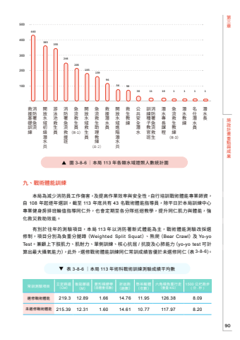 %u7b2c%u4e09%u7ae0%u65bd%u653f%u8a08%u756b%u91cd%u9ede%u8207%u6210%u679c90%u6025%u6d41%u6551%u751f%u6559%u7df4 %u6f5b%u6c34%u6559%u7df4 %u540d%u4ed5%u6f5b%u6c34%u54e1 %u6f5b%u6c34%u9577%uff08R-3%uff09 %u6025%u6d41%u6551%u751f%u52a9%u7406%u6559%u7df4 %u6551%u63f4%u6f5b%u6c34%u54e1 %u958b%u653e%u6c34%u57df%u9032%u968e%u6f5b%u6c34%u54e1 %u6551%u751f%u6559%u7df4 %u516c%u5171%u5b89%u5168%u6f5b%u6c34 %u8a13%u7df4%u7a2e%u5b50%u6559%u5b98%u73ed %u6d88%u9632%u7f72%u6025%u6d41%u6551%u751f %u6f5b%u6c34%u5c08%u9577%u8ab2%u7a0b%uff08R-2%uff09%u6025%u6d41%u6551%u751f%u54e1 %u958b%u653e%u6c34%u57df%u6551%u751f%u54e1%uff08R-1%uff09 %u6551%u63f4%u57fa%u790e%u8a13%u7df4 %u6d88%u9632%u7f72%u6025%u6d41 %u958b%u653e%u6c34%u57df%u521d%u7d1a%u6f5b%u6c34%u54e1 %u6e38%u6cf3%u6c60%u6551%u751f%u54e1 %u6d88%u9632%u7f72%u6025%u6d41%u6551%u63f4%u73ed1002003004005004403853552442051851599656 5030 11 10 1 1 1 1%u25b6 %u5716 3-8-6 %uff5c%u672c%u5c40 113 %u5e74%u5404%u985e%u6c34%u57df%u8b49%u7167%u4eba%u6578%u7d71%u8a08%u5716%u4e5d%u3001%u6230%u8853%u9ad4%u80fd%u8a13%u7df4%u672c%u5c40%u70ba%u6e1b%u5c11%u6d88%u9632%u54e1%u5de5%u4f5c%u50b7%u5bb3%uff0c%u53ca%u63d0%u9ad8%u4f5c%u696d%u6548%u7387%u8207%u5b89%u5168%u6027%uff0c%u81ea%u884c%u57f9%u8a13%u6230%u8853%u9ad4%u80fd%u5c08%u696d%u5e2b%u8cc7%uff0c%u81ea 108 %u5e74%u8d77%u9010%u5e74%u9078%u8a13%uff0c%u622a%u81f3 113 %u5e74%u5e95%u5171%u6709 43 %u540d%u6230%u8853%u9ad4%u80fd%u6307%u5c0e%u54e1%uff0c%u9664%u5e73%u65e5%u65bc%u672c%u5c40%u8a13%u7df4%u4e2d%u5fc3%u5c08%u696d%u5065%u8eab%u623f%u6392%u73ed%u8f2a%u503c%u6307%u5c0e%u540c%u4ec1%u5916%uff0c%u4e5f%u6703%u5b9a%u671f%u81f3%u5404%u5206%u968a%u5de1%u8ff4%u6559%u5b78%uff0c%u63d0%u5347%u540c%u4ec1%u808c%u529b%u8207%u9ad4%u80fd%uff0c%u5f37%u5316%u6551%u707d%u6551%u52a9%u6548%u80fd%u3002%u6709%u5225%u65bc%u5f80%u5e74%u7684%u6e2c%u9a57%u9805%u76ee%uff0c%u672c%u5c40 113 %u5e74%u4ee5%u6d88%u9632%u7f72%u65b0%u5f0f%u9ad4%u80fd%u70ba%u4e3b%uff0c%u6230%u8853%u9ad4%u80fd%u6e2c%u9a57%u6539%u63a1%u9078%u4fee%u5236%uff0c%u9805%u76ee%u5206%u5225%u70ba%u8ca0%u91cd%u5206%u817f%u8e72%uff08Weighted Split Squat%uff09%u3001%u718a%u722c%uff08Bear Crawl%uff09%u53ca Yo-yo Test%u3002%u517c%u9867%u4e0a%u4e0b%u80a2%u808c%u529b%u3001%u808c%u8010%u529b%u3001%u55ae%u5074%u8a13%u7df4%u3001%u6838%u5fc3%u6297%u5c48 / %u6297%u65cb%u53ca%u5fc3%u80ba%u80fd%u529b%uff08yo-yo test %u53ef%u8a08%u7b97%u51fa%u6700%u5927%u651d%u6c27%u80fd%u529b%uff09%uff0c%u6b64%u5916%uff0c%u9078%u4fee%u6230%u8853%u9ad4%u80fd%u8a13%u7df4%u540c%u4ec1%u5e38%u8a13%u6210%u7e3e%u7686%u512a%u65bc%u672a%u9078%u4fee%u540c%u4ec1%uff08%u8868 3-8-6%uff09%u3002%u5e38%u8a13%u6e2c%u9a57%u9805%u76ee %u7acb%u5b9a%u8df3%u9060%uff08CM%uff09%u5f8c%u62cb%u64f2%u9060%uff08M%uff09%u83f1%u5f62%u69d3%u786c%u8209%uff08%u81ea%u9ad4%u91cd%u500d%u6578%uff09%u6298%u8fd4%u8dd1%uff08%u8d9f%u6578%uff09%u61f8%u540a%u8ec0%u9ad4%uff08%u6b21%u6578%uff09%u516d%u89d2%u69d3%u8ca0%u91cd%u884c%u8d70%uff08%u91cd%u91cf KG%uff091500 %u516c%u5c3a%u8dd1%u6b65( %u5206 . %u79d2 )%u9078%u4fee%u6230%u8853%u9ad4%u80fd 219.3 12.89 1.66 14.76 11.95 126.38 8.09%u672a%u9078%u4fee%u6230%u8853%u9ad4%u80fd 215.39 12.31 1.60 14.61 10.77 117.97 8.20%u25b6 %u8868 3-8-6 %uff5c%u672c%u5c40 113 %u5e74%u8853%u79d1%u6230%u8853%u8a13%u7df4%u6e2c%u9a57%u6210%u7e3e%u5e73%u5747%u6578