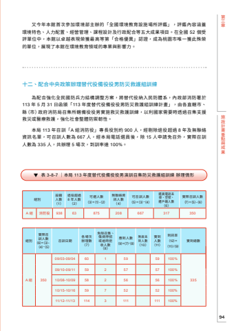 %u7b2c%u4e09%u7ae0%u65bd%u653f%u8a08%u756b%u91cd%u9ede%u8207%u6210%u679c94%u53c8%u4eca%u5e74%u672c%u9928%u9996%u6b21%u53c3%u52a0%u74b0%u5883%u90e8%u4e3b%u8fa6%u7684%u300c%u5168%u570b%u74b0%u5883%u6559%u80b2%u8a2d%u65bd%u5834%u6240%u8a55%u9451%u300d%uff0c%u8a55%u9451%u5167%u5bb9%u6db5%u84cb%u74b0%u5883%u7279%u8272%u3001%u4eba%u529b%u914d%u7f6e%u3001%u7d93%u71df%u7ba1%u7406%u3001%u8ab2%u7a0b%u8a2d%u8a08%u53ca%u884c%u653f%u914d%u5408%u7b49%u4e94%u5927%u6210%u679c%u9805%u76ee%u3002%u5728%u5168%u570b 52 %u500b%u53d7%u8a55%u55ae%u4f4d%u4e2d%uff0c%u672c%u9928%u4ee5%u5353%u8d8a%u8868%u73fe%u69ae%u7372%u6700%u9ad8%u7b49%u7b2c%u300c%u5408%u683c%u512a%u7570%u300d%u8a8d%u8b49%uff0c%u6210%u70ba%u6843%u5712%u5e02%u552f%u4e00%u7372%u6b64%u6b8a%u69ae%u7684%u55ae%u4f4d%uff0c%u5c55%u73fe%u4e86%u672c%u9928%u5728%u74b0%u5883%u6559%u80b2%u9818%u57df%u7684%u5c08%u696d%u8207%u5f71%u97ff%u529b%u3002%u5341%u4e8c%u3001%u914d%u5408%u4e2d%u592e%u653f%u7b56%u8fa6%u7406%u66ff%u4ee3%u5f79%u5099%u5f79%u5f79%u7537%u9632%u707d%u6551%u8b77%u7d44%u8a13%u7df4%u70ba%u914d%u5408%u5f37%u5316%u5168%u6c11%u570b%u9632%u5175%u529b%u7d50%u69cb%u8abf%u6574%u65b9%u6848%uff0c%u5c07%u66ff%u4ee3%u5f79%u7d0d%u5165%u6c11%u9632%u9ad4%u7cfb%uff0c%u5167%u653f%u90e8%u6d88%u9632%u7f72%u65bc113 %u5e74 5 %u6708 31 %u65e5%u51fd%u9812%u300c113 %u5e74%u5ea6%u66ff%u4ee3%u5f79%u5099%u5f79%u5f79%u7537%u9632%u707d%u6551%u8b77%u7d44%u8a13%u7df4%u8a08%u756b%u300d%uff0c%u7531%u5404%u76f4%u8f44%u5e02%u3001%u7e23%uff08%u5e02%uff09%u653f%u5e9c%u6d88%u9632%u5c40%u53ec%u96c6%u6240%u8f44%u5099%u5f79%u5f79%u7537%u5be6%u65bd%u6551%u707d%u6551%u8b77%u8a13%u7df4%uff0c%u4ee5%u5229%u570b%u5bb6%u9700%u8981%u6642%u900f%u904e%u53ec%u96c6%u652f%u63f4%u6551%u707d%u6216%u91ab%u7642%u6551%u8b77%uff0c%u5f37%u5316%u793e%u6703%u6574%u9ad4%u9632%u79a6%u97cc%u6027%u3002%u672c%u5c40 113 %u5e74%u53ec%u8a13%u300cA %u7d44%u6d88%u9632%u5f79%u300d%u5c08%u9577%u5f79%u5225%u7d04 900 %u4eba%uff0c%u7d93%u5254%u9664%u9000%u5f79%u8d85%u904e 8 %u5e74%u53ca%u7121%u806f%u7d61%u8cc7%u8a0a%u540d%u55ae%uff0c%u53ef%u53ec%u8a13%u4eba%u6578%u70ba 667 %u4eba%uff0c%u7d93%u672c%u5c40%u96fb%u8a71%u9078%u54e1%u5f8c%uff0c%u9664 15 %u4eba%u7533%u8acb%u514d%u53ec%u5916%uff0c%u5be6%u969b%u53ec%u8a13%u4eba%u6578%u70ba 335 %u4eba%uff0c%u5171%u8fa6%u7406 5 %u5834%u6b21%uff0c%u5230%u8a13%u7387%u9054 100%%u3002%u7d44%u5225%u8a2d%u7c4d%u4eba%u6578%uff081%uff09%u9000%u5f79%u8d85%u904e8 %u5e74%u4eba%u6578%uff082%uff09%u53ef%u9078%u4eba%u6578%uff083%uff09=%uff081%uff09%uff08- 2%uff09%u7121%u806f%u7d61%u8cc7%u8a0a%u4eba%u6578%uff084%uff09%u53ef%u53ec%u8a13%u4eba%u6578%uff085%uff09=%uff083%uff09%uff08- 4%uff09%u9078%u54e1%u96fb%u8a71%u672a%u63a5%u3001%u7a7a%u865f%u3001%u9077%u6236%u7c4d%u4eba%u6578 %uff086%uff09%u5be6%u969b%u53ec%u8a13%u4eba%u6578%uff087%uff09=%uff085%uff09%uff08- 6%uff09A %u7d44 %u6d88%u9632%u5f79 938 63 875 208 667 317 350%u7d44%u5225%u5be6%u969b%u53ec%u8a13%u4eba%u6578%uff086%uff09=%uff083%uff09- %uff084%uff09%uff08- 5%uff09%u53ec%u8a13%u65e5%u671f%u5404%u5834%u6b21%u8fa6%u7406%u6578%uff087%uff09%u514d%u9664%u53ec%u96c6%u3001%u50b7%u75c5%u505c%u62db%u6216%u903e%u6642%u62d2%u6536%u4eba%u6578%uff088%uff09%u61c9%u5230%u4eba%u6578%uff089%uff09=%uff087%uff09%uff08- 8%uff09%u7121%u6545%u672a%u5230%u4eba%u6578%uff0810%uff09%u5be6%u5230%u4eba%u6578%uff0811%uff09%u5230%u8a0a%u7387%uff0812%uff09=%uff0811%uff09%uff08/ 9%uff09%u5be6%u5230%u7e3d%u6578A %u7d44 35009/03-09/04 60 1 59 59 100%33509/10-09/11 59 2 57 57 100%10/08-10/09 58 2 56 56 100%10/15-10/16 59 7 52 52 100%11/12-11/13 114 3 111 111 100%%u25b6 %u8868 3-8-7 %uff5c%u672c%u5c40 113 %u5e74%u5ea6%u66ff%u4ee3%u5f79%u5099%u5f79%u5f79%u7537%u6f14%u8a13%u53ec%u96c6%u9632%u707d%u6551%u8b77%u7d44%u8a13%u7df4 %u8fa6%u7406%u60c5%u5f62