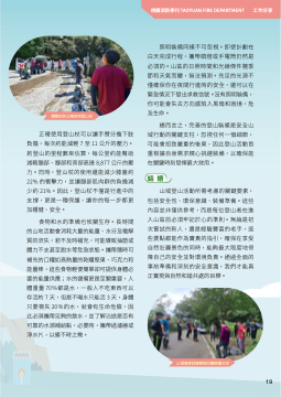 桃園消防季刊 TAOYUAN FIRE DEPARTMENT 工作分享 講解如何正確使用登山杖 正確使用登山杖可以讓手臂分擔下肢 負擔,每次約能減輕 7 至 11 公斤的壓力。 若登山的里程數來估算,每公里約能幫助 減輕腿部、腳部和背部高達 8,877 公斤的壓 力。同時,登山杖的使用還能減少膝蓋約 22% 的衝擊力,並讓腿部肌肉群的負擔減 少約 21%。因此,登山杖不僅是行進中的 支撐,更是一種保護,讓你的每一步都更 加穩健、安全。 食物和水的準備也攸關生存。長時間 的山地活動會消耗大量的能量、水分及電解 質的流失,若不及時補充,可能導致抽筋或 體力不支甚至脫水等危急狀態。攜帶隨時可 補充的口糧如高熱量的乾糧堅果、巧克力和 能量棒,這些食物輕便簡單卻可提供身體必 要的能量供應;水的儲備更是至關重要,人 體重量 70%都是水,一般人不吃東西可以 存活約 7 天,但是不喝水只能活 3 天,身體 只要喪失 20%的水,就會有生命危險,因 此必須攜帶足夠的飲水,並了解沿途是否有 可靠的水源補給點,必要時,攜帶過濾器或 淨水片,以備不時之需。 照明裝備同樣不可忽視。即使計劃在 白天完成行程,攜帶頭燈或手電筒仍然是 必須的。山區的日照時間和光線條件隨季 節和天氣而變,無法預測。充足的光源不 僅確保你在夜間行進時的安全,還可以在 緊急情況下發出求救信號。沒有照明裝備, 你可能會失去方向感陷入黑暗和困境,危 及生命。 總而言之,完善的登山裝備是安全山 域行動的關鍵支柱,忽視任何一個細節, 可能會招致嚴重的後果,因此登山活動首 重根據自身需求精心挑選裝備,以確保能 在關鍵時刻發揮最大效用。 結 語 山域登山活動所需考慮的關鍵要素, 包括安全性、環保意識、裝備準備。這些 內容並非僅供參考,而是每位登山者在進 入山區前必須牢記於心的準則。無論是初 次嘗試的新人,還是經驗豐富的老手,這 些要點都能作為寶貴的指引,確保在享受 自然壯麗景色的同時,能夠最大限度地保 障自己的安全並對環境負責。通過全面的 事前準備和深刻的安全意識,我們才能真 正實現與自然和諧共處的目標。 山域搜索訓練歸詢回饋經驗交流 19