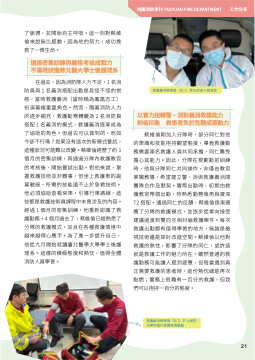 桃園消防季刊 TAOYUAN FIRE DEPARTMENT 工作分享 了脈搏,並開始自主呼吸。這一刻對蔡維 倫來說無比感動,因為他的努力,成功挽 救了一條生命。 通過密集訓練與嚴格考核成戰力 不滿現狀進修北醫大學士後護理系 在過去,因為消防隊人力不足,1 名消 防員與 1 名義消搭配出勤是見怪不怪的常 態,當時救護義消(當時稱為鳳凰志工) 扮演著極重要角色。然而,隨著消防人力 的逐步補充,救護勤務轉變為 2 名消防員 搭配 1 名義消的模式,救護義消逐漸成為 了協助的角色。但過去可以做到的,而如 今卻不行嗎?如果沒有這次的新模式嘗試, 這種狀況可能難以改變。蔡維倫經歷了約 1 個月的密集訓練,再通過分隊內救護教官 的考核後,開始嘗試出勤。對他來說,掌 握救護技術並非難事,但坐上救護車的副 駕駛座,所需的技能遠不止於急救技術。 他必須協助查看來車,引導行車路線,這 些都是救護技術員課程中未曾涉及的內容。 經過 1 個月的密集訓練,他重新認識了救 護勤務。4 個月過去了,蔡維倫已經熟悉了 分隊的救護模式,並且在各種救護情境中 越來越得心應手。為了進一步提升自己, 他從九月開始就讀臺北醫學大學學士後護 理系。這樣的積極態度和熱忱,值得全體 消防人員學習。 救護義消蔡維倫(右 1)參加民安十號演習 以實力扭轉警、消對義消救護能力 刻板印象 救患者免於危難成原動力 蔡維倫剛加入分隊時,部分同仁對他 的學識和技能抱持觀望態度,畢竟救護勤 務需要兩名救護人員共同承擔,同仁難免 擔心其能力。因此,分隊在規劃勤前訓練 時,他與分隊同仁共同操作,非僅由教官 單獨教導,希望建立警、消與救護義消間 團隊合作及默契。實際出勤時,初期由救 護教官帶領出勤,待熟悉勤務後再與資深 T2 搭配。通過同仁的反饋,蔡維倫逐漸適 應了分隊的救護模式,並逐步從單向接受 建議過渡到雙向互相討論救護案件。每次 救護出勤都有值得學習的地方,無論是檢 視技術還是探討改進空間。蔡維倫以他對 救護的熱忱,影響了分隊的同仁,或許這 就是救護工作的魅力所在,雖然普通的救 護勤務可能讓人感到疲憊,但每當遇到真 正需要救護的患者時,這份熱忱總能再次 點燃;實務上很難有一百分的救護,但我 們可以抱持一百分的態度。 救護義消蔡維倫(右 1)於上線前, 分隊內進行救護情境模擬 21