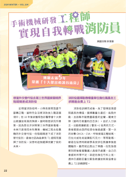 2024 WINTER — VOL.104 興國分隊 許育豪 想當外交替代役去第三世界國家開眼界 陰錯陽差成消防役 記得當消防役時,小隊長曾問我要不 要轉正職,當時完全沒將消防放入職涯選 項中;但 10 年後卻獲得急診醫學會十大傑 出救護技術員的殊榮。當時剛從研究所畢 業,因為想去非洲等第三世界國家看看, 本來只是想用本科專業 – 機械工程去投農 機的外交替代役,但陰錯陽差下成了消防 替代役別,最後也因為能拿到 T1 證照而選 擇了消防役,沒想到這個選擇改變了我的 未來。 消防役選擇勤務爆量單位擔任鳳凰志工 求精進自費上 T2 消防役訓練完成後,為了發揮這張證 照最高的價值,選擇離臺北最近、能跑外 勤,且該縣市勤務量最重的宜蘭 – 羅東分 隊(當時月救量約四百多)。由於人力缺 乏,出勤救護都是 1 警消 +1 役男的方式, 患者都是由我們役男在後座處置,第一次 的目擊 OHCA、CVA、呼吸衰竭正壓給氧、 巴拉刈或吃老鼠藥配巧克力…等等勤務, 都是在役男時期被學長安排在救護車後座 體驗的,雖然就此跑出了興趣,但危急個 案到院後看著醫護人員接手處置,自己仍 會感到所學不足,故退伍後在竹科上班, 週休仍通勤至臺北緊急救護技術員協會自 費上 T2 訓練課程。 22