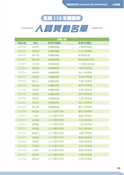 桃園消防季刊 TAOYUAN FIRE DEPARTMENT 消防花絮 桃園消防季刊 TAOYUAN FIRE DEPARTMENT 人員異動 本局 113 年第四季 人員異動名單 新進人員 新進日期 姓名 原單位及職稱 新單位及職稱 1131001 田名妤 他機關調進 人事室助理員 1131001 曾誌誼 他機關調進 大竹分隊隊員 1131007 陳文清 他機關調進 秘書室股長 1131007 賴佳樂 他機關調進 教育訓練科科員 1131014 王怡蘋 他機關調進 火災預防科科員 1131014 夏宜敏 他機關調進 中路分隊隊員 1131014 黃皓翔 他機關調進 埔心分隊隊員 1131014 張家銘 他機關調進 平鎮分隊隊員 1131014 蔡治文 他機關調進 平鎮分隊隊員 1131014 吳佳鴻 他機關調進 龍岡分隊隊員 1131014 張雅雯 他機關調進 平鎮分隊隊員 1131014 黃建凱 他機關調進 埔子分隊隊員 1131014 陳新泰 他機關調進 中壢分隊隊員 1131014 林柏安 他機關調進 埔心分隊隊員 1131014 劉子嘉 他機關調進 蘆竹分隊隊員 1131014 陳冠捷 113 年警特四等 蘆竹分隊隊員 1131014 江彥辰 113 年警特四等 興國分隊隊員 1131014 俞祥豪 113 年警特四等 三民分隊隊員 1131014 黃偉誠 113 年警特四等 三民分隊隊員 1131014 馬家駿 113 年警特四等 埔心分隊隊員 1131014 劉捷文 113 年警特四等 大園分隊隊員 1131014 張家綺 113 年警特四等 楊梅分隊隊員 1131014 林峻玄 113 年警特四等 竹圍分隊隊員 1131014 許哲愷 113 年警特四等 三民分隊隊員 1131014 沈政昕 113 年警特四等 興國分隊隊員 1131014 吳俊諺 113 年警特四等 中壢分隊隊員 1131014 郭政源 113 年警特四等 中壢分隊隊員 25