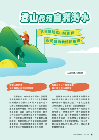 9%u5927%u6eaa%u5206%u968a%uff0f%u6d2a%u8056%u582f%u56de%u9867%u53bb (113) %u5e74%u53c3%u52a0%u7684%u8a13%u7df4%uff0c%u76ee%u524d%u9084%u610f%u7336%u672a%u76e1%u7684%u5206%u5225%u662f 10 %u6708 22 %u65e5%u5927%u968a%u8fa6%u7406%u7684%u5357%u63d2%u5929%u5c71%u5c71%u8a13%u4ee5%u53ca 5 %u6708 8 %u65e5%u81f3 5 %u6708 9%u65e5%u5169%u65e5%u6551%u52a9%u8a13%u7684%u5317%u63d2%u5929%u5c71%u5c71%u8a13%uff1b%u6216%u8a31%u5f9e%u524d%u662f%u88ab%u5404%u7a2e%u5831%u7ae0%u96dc%u8a8c%u3001%u7db2%u7d05%u793e%u7fa4%u5a92%u9ad4%u62cd%u651d%u7684%u7f8e%u666f%u5f71%u97ff%uff0c%u56e0%u6b64%u4e00%u76f4%u5c0d%u5c71%u6709%u80a1%u61a7%u61ac%uff0c%u751a%u81f3%u5728%u7af9%u5c71%u8a13%u7df4%u4e2d%u5fc3%u8a13%u7df4%u6642%u6700%u70ba%u671f%u5f85%u7684%u5c31%u662f%u5c71%u8a13%uff0c%u53ef%u8aaa%u662f%u5c0d%u5c71%u60c5%u6709%u7368%u937e%u3002%u5728%u53d7%u5c08%u696d%u5c71%u57df%u8a13%u7df4%u524d%uff0c%u6211%u5c0d%u65bc%u722c%u5c71%u7684%u521d%u6b65%u8a8d%u8b58%u5c31%u4ee5%u70ba%u662f%u50cf%u8d70%u6a13%u68af%uff0c%u7136%u5f8c%u63a7%u5236%u547c%u5438%u722c%u4e0a%u53bb%u5373%u53ef%uff0c%u4f46%u771f%u6b63%u4e86%u89e3%u5f8c%u624d%u767c%u73fe%u88cf%u982d%u5967%u5999%u535a%u5927%u7cbe%u6df1%u3002%u56de%u9867%u7b2c%u4e00%u6b21%u53c3%u52a0%u5c71%u8a13%u662f%u6d88%u9632%u7f72%u8a13%u7df4%u4e2d%u5fc3%u7684%u5408%u6b61%u5317%u5cf0%uff0c%u5728%u6b64%u4e4b%u524d%u5f9e%u6c92%u8a8d%u771f%u722c%u904e%u4e00%u5ea7%u5c71%uff0c%u66f4%u5225%u63d0%u767e%u5cb3%u4e86%uff0c%u56e0%u6b64%u5b8c%u5168%u662f%u4ee5%u9580%u5916%u6f22%u7684%u5fc3%u614b%u53c3%u52a0%u3002%u5c71%u8a13%u904e%u7a0b%u80cc%u8ca0%u4e00%u3001%u4e8c%u5341%u516c%u65a4%u91cd%u7684%u88dd%u5099%u7ce7%u98df%u7368%u6500%uff0c%u6b64%u90e8%u5206%u6211%u5c1a%u53ef%u52dd%u4efb%uff0c%u4f46%u767b%u9802%u9014%u4e2d%uff0c%u6559%u5b98%u8b93%u5927%u5bb6%u9ad4%u9a57%u80cc%u4eba%u4e0a%u5c71%uff0c%u7576%u4e0b%u624d%u767c%u73fe%u80cc%u4eba%u8207%u7368%u6500%u7684%u91cd%u91cf%u5929%u5dee%u5730%u9060%uff0c%u4e5f%u9ede%u9192%u6211%u4eba%u547d%u95dc%u5929%u7684%u5c71%u57df%u6551%u63f4%u8207%u96a8%u5fc3%u6240%u6b32%u7684%u4f11%u9592%u767b%u5c71%uff0c%u5728%u5fc3%u614b%u3001%u9ad4%u529b%u8207%u6642%u9593%u6025%u8feb%u6027%u90fd%u5927%u4e0d%u540c%uff0c%u56e0%u6b64%u624d%u9700%u8981%u5c08%u696d%u7684%u8a13%u7df4%u3002%u80cc%u8ca0%u4e8c%u5341%u516c%u65a4%u88dd%u5099%u7368%u6500%uff0c%u7adf%u6bd4%u80cc%u4eba%u767b%u5c71%u9084%u7c21%u55ae%u61a7%u61ac%u5c71%u6797%u4e4b%u7f8e %u52a0%u5165%u5c08%u696d%u5c71%u57df%u8a13%u7df4%u9577%u898b%u8b58