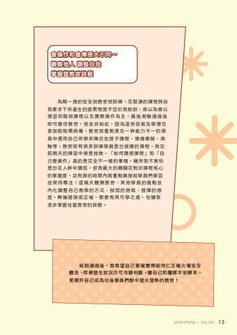 13%u6703%u64cd%u4f5c%u548c%u6703%u50b3%u6388%u5927%u4e0d%u540c%uff5e%u89c0%u5bdf%u4ed6%u4eba %u8abf%u6574%u81ea%u6211 %u638c%u63e1%u7576%u6559%u5b98%u8a23%u7ac5%u70ba%u671f%u4e00%u9031%u7684%u5b89%u5168%u8a13%u6559%u5b98%u73ed%u8a13%u7df4%uff0c%u5728%u7dca%u6e4a%u7684%u8ab2%u7a0b%u8207%u81ea%u6211%u8981%u6c42%u4e0b%u6240%u7522%u751f%u7684%u75b2%u7d2f%u7a0b%u5ea6%u4e0d%u4e9e%u65bc%u6551%u52a9%u8a13%uff1b%u539f%u4ee5%u70ba%u6703%u4ee5%u8907%u7fd2%u521d%u968e%u73ed%u8ab2%u7a0b%u4ee5%u53ca%u5be6%u969b%u64cd%u4f5c%u70ba%u4e3b%uff0c%u6700%u5f8c%u6e2c%u9a57%u901a%u904e%u5f8c%u5373%u53ef%u64d4%u4efb%u6559%u5b98%uff0c%u4f46%u4e26%u975e%u5982%u6b64%uff0c%u56e0%u70ba%u9019%u4e9b%u6280%u80fd%u53ca%u5b78%u7406%u5728%u53c3%u52a0%u524d%u5c31%u9700%u5177%u5099%uff0c%u6559%u5b98%u73ed%u91cd%u9ede%u662f%u5728%u4e00%u7fa4%u80fd%u529b%u4e0d%u4e00%u7684%u5b78%u54e1%u4e2d%u904b%u7528%u81ea%u5df1%u6240%u5b78%u4f86%u9673%u8ff0%u4e26%u6388%u4e88%u8ab2%u7a0b%u3001%u60c5%u5883%u6a21%u64ec%u3001%u6e2c%u9a57%u7b49%uff1b%u6559%u5b98%u73ed%u6709%u5f88%u591a%u8a13%u7df4%u5b78%u54e1%u767b%u53f0%u6388%u8ab2%u7684%u8ab2%u7a0b%uff0c%u6211%u5728%u524d%u5169%u5929%u7684%u7df4%u7fd2%u4e2d%u5f88%u662f%u632b%u6557%uff0c%u300c%u5982%u4f55%u8b1b%u6388%u8ab2%u7a0b%u300d%u548c%u300c%u81ea%u5df1%u6703%u64cd%u4f5c%u300d%u771f%u7684%u662f%u5b8c%u5168%u4e0d%u4e00%u6a23%u7684%u4e8b%u60c5%uff0c%u96d6%u7136%u6211%u4e0d%u5bb3%u6015%u767b%u53f0%u5728%u4eba%u7fa4%u4e2d%u8b1b%u8a71%uff0c%u4f46%u6211%u6700%u5927%u7684%u96e3%u95dc%u5728%u5c0d%u65bc%u8ab2%u7a0b%u6838%u5fc3%u7684%u638c%u63e1%u5ea6%uff0c%u4e14%u6709%u9650%u7684%u6642%u9593%u5167%u5c07%u91cd%u9ede%u8b1b%u6388%u7d66%u5b78%u54e1%u5011%u5b78%u7fd2%u4e26%u4fdd%u6301%u5c08%u6ce8%uff1b%u9019%u5e7e%u5929%u89c0%u5bdf%u6559%u5b98%u3001%u5176%u4ed6%u5b78%u54e1%u7684%u512a%u9ede%u4e26%u5167%u5316%u8abf%u6574%u81ea%u5df1%u6559%u5b78%u7684%u65b9%u5f0f%u3001%u8aaa%u8a71%u7684%u8a9e%u6c23%u3001%u6388%u8ab2%u7684%u614b%u5ea6%uff0c%u7121%u8ad6%u932f%u8aa4%u6216%u6b63%u78ba%uff0c%u90fd%u6703%u6709%u5176%u53ef%u5b78%u4e4b%u8655%uff0c%u4e5f%u8b93%u6211%u9010%u6b65%u638c%u63e1%u4f4f%u7576%u6559%u5b98%u7684%u8a23%u7ac5%u3002%u7d50%u8a13%u901a%u904e%u5f8c%uff0c%u6211%u5e0c%u671b%u81ea%u5df1%u8981%u78ba%u5be6%u5e36%u7d66%u540c%u4ec1%u6b63%u78ba%u706b%u5834%u5b89%u5168%u89c0%u5ff5%uff0c%u5373%u4fbf%u767c%u751f%u72c0%u6cc1%u4ea6%u53ef%u51b7%u975c%u5224%u65b7%uff0c%u8b93%u81ea%u5df1%u548c%u5718%u968a%u5e73%u5b89%u6b78%u4f86%uff0c%u66f4%u671f%u8a31%u81ea%u5df1%u6210%u70ba%u5f80%u5f8c%u5b78%u54e1%u5011%u773c%u4e2d%u767c%u5149%u767c%u71b1%u7684%u6559%u5b98%uff01