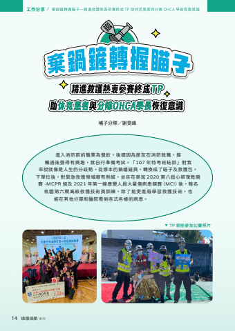 14 %u5de5%u4f5c%u5206%u4eab / %u57d4%u5b50%u5206%u968a%uff0f%u8b1d%u65fb%u5cf0 %u9032%u5165%u6d88%u9632%u524d%u7684%u8077%u696d%u70ba%u9910%u98f2%uff0c%u5f8c%u7e8c%u56e0%u70ba%u670b%u53cb%u5728%u6d88%u9632%u5c31%u8077%uff0c%u63a5%u89f8%u904e%u5f8c%u89ba%u5f97%u6709%u8208%u8da3%uff0c%u5c31%u81ea%u884c%u6e96%u5099%u8003%u8a66%u3002%u300c107 %u5e74%u7279%u8003%u73ed%u7d50%u8a13%u300d%u5c0d%u6211%u4f86%u8aaa%u5c31%u50cf%u662f%u4eba%u751f%u7684%u5206%u6b67%u9ede%uff0c%u5f9e%u539f%u672c%u7684%u934b%u7210%u93df%u5177%uff0c%u8f49%u63db%u6210%u4e86%u7784%u5b50%u53ca%u6551%u8b77%u5305%u3002%u4e0b%u55ae%u4f4d%u5f8c%uff0c%u5c0d%u7dca%u6025%u6551%u8b77%u9818%u57df%u9817%u6709%u71b1%u8aa0%uff0c%u4e26%u4e14%u5728%u53c3%u52a0 2020 %u7b2c%u516b%u5c46%u5fc3%u80ba%u5fa9%u7526%u7af6%u8cfd -MCPR %u7d44%u53ca 2021 %u5e74%u7b2c%u4e00%u7dda%u61c9%u8b8a%u4eba%u54e1%u5927%u91cf%u50b7%u75c5%u60a3%u7af6%u8cfd%uff08MCI%uff09%u5f8c%uff0c%u5831%u540d%u6843%u5712%u7b2c%u516d%u671f%u9ad8%u7d1a%u6551%u8b77%u6280%u8853%u54e1%u8a13%u7df4%uff0c%u9664%u4e86%u80fd%u66f4%u9032%u968e%u5b78%u7fd2%u6551%u8b77%u6280%u8853%uff0c%u4e5f%u80fd%u5728%u5176%u4ed6%u5206%u968a%u548c%u91ab%u9662%u770b%u5230%u5404%u5f0f%u5404%u6a23%u7684%u75c5%u60a3%u3002TP %u8a13%u524d%u53c3%u52a0%u6bd4%u8cfd%u7167%u7247