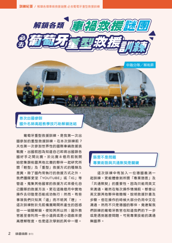 2 %u8a13%u7df4%u7d00%u8981 / %u89e3%u9396%u5404%u985e%u8eca%u798d%u6551%u63f4%u8b0e%u5718 %u5fc5%u53bb%u8461%u8404%u7259%u91cd%u578b%u6551%u63f4%u8a13%u7df4%u8461%u8404%u7259%u91cd%u578b%u6551%u63f4%u8a13%u7df4%uff0c%u662f%u6211%u7b2c%u4e00%u6b21%u51fa%u570b%u53c3%u52a0%u7684%u91cd%u578b%u6551%u63f4%u8a13%u7df4%uff0c%u5728%u672c%u6b21%u8a13%u7df4%u524d 7%u5929%u4e5f%u7b2c%u4e00%u6b21%u53c3%u52a0%u4e16%u754c%u6027%u7684%u570b%u969b%u8eca%u798d%u6551%u63f4%u6311%u6230%u8cfd%uff0c%u51fa%u570b%u524d%u56e0%u70ba%u77e5%u9053%u81ea%u5df1%u5373%u5c07%u51fa%u570b%u8ddf%u5404%u570b%u597d%u624b%u4e4b%u9593%u6bd4%u8cfd%uff0c%u65bc%u6bd4%u8cfd 8 %u500b%u6708%u524d%u5c31%u958b%u59cb%u5bc6%u96c6%u8ddf%u6843%u5712%u5176%u4ed6%u6bd4%u8cfd%u7684%u5925%u4f34%u4e00%u8d77%u7814%u7a76%u6240%u8b02%u300c%u8f15%u578b%u300d%u53ca%u300c%u91cd%u578b%u300d%u6551%u63f4%u65b9%u5f0f%u7684%u7a2e%u985e%u53ca%u5dee%u7570%uff0c%u9664%u4e86%u570b%u5167%u5e38%u57f7%u884c%u7684%u6551%u63f4%u65b9%u5f0f%u4e4b%u5916%uff0c%u6211%u5011%u5718%u968a%u66f4%u81f3%u300cYOUTUBE%u300d%u6216%u300cIG%u300d%u7b49%u7ba1%u9053%uff0c%u8490%u96c6%u5176%u4ed6%u570b%u5bb6%u7684%u6551%u63f4%u65b9%u5f0f%u4f86%u512a%u5316%u81ea%u5df1%u5718%u968a%u7684%u6551%u63f4%u65b9%u6cd5%uff0c%u66f4%u5728%u9019%u5e7e%u500b%u6708%u4e2d%u5be6%u5730%u64cd%u4f5c%u53bb%u5370%u8b49%u662f%u5426%u80fd%u6210%u529f%u57f7%u884c%uff1b%u7136%u800c%uff0c%u6709%u4e9b%u4e8b%u9805%u6211%u5011%u53ea%u77e5%u5176%u300c%u9053%u300d%u800c%u4e0d%u660e%u5176%u300c%u7406%u300d%uff0c%u9019%u6b21%u8a13%u7df4%u5c0d%u65bc%u5148%u524d%u5099%u8cfd%u671f%u9593%u6240%u7522%u751f%u7684%u56f0%u60d1%u7686%u4e00%u4e00%u7834%u95dc%u89e3%u9396%uff0c%u4f7f%u77e5%u5176%u6240%u4ee5%u7136%uff1b%u570b%u5916%u6559%u5b98%u751a%u81f3%u6703%u5229%u7528%u4e00%u4e9b%u5c0f%u9053%u5177%u6216%u662f%u5c0f%u904a%u6232%u4f86%u63d0%u9ad8%u7406%u89e3%u7a0b%u5ea6%uff0c%u4e5f%u662f%u9019%u6b21%u5b78%u5230%u7684%u5176%u4e2d%u4e00%u74b0%u3002%u9019%u6b21%u8a13%u7df4%u4e2d%u6709%u52a0%u5165%u4e00%u4f4d%u5fb7%u570b%u7fa9%u6d88%u4e00%u8d77%u8a13%u7df4%uff0c%u66f4%u80fd%u9ad4%u6703%u5230%u6240%u8b02%u300c%u5c08%u696d%u8a9e%u8a00%u300d%u53ca%u300c%u5171%u901a%u9ed8%u5951%u300d%u7684%u91cd%u8981%u6027%uff0c%u56e0%u70ba%u53ea%u80fd%u7528%u82f1%u6587%u4f86%u6e9d%u901a%uff0c%u96d6%u7136%u5728%u6bcf%u6b21%u64cd%u4f5c%u60c5%u5883%u524d%uff0c%u90fd%u6703%u4ee5%u82f1%u6587%u8ddf%u5176%u4ed6%u5925%u4f34%u505a%u7c21%u5831%uff0c%u8aaa%u660e%u6551%u63f4%u8a08%u756b%u53ca%u6b65%u9a5f%uff0c%u4f46%u5728%u64cd%u4f5c%u7684%u6642%u5019%u5927%u90e8%u5206%u4ecd%u7528%u4e2d%u6587%u5728%u6e9d%u901a%uff0c%u7136%u800c%u4e0d%u53ea%u662f%u5fb7%u570b%u7684%u5925%u4f34%uff0c%u7adf%u9023%u5e6b%u6211%u5011%u8a13%u7df4%u7684%u8461%u8404%u7259%u6559%u5b98%u4e5f%u77e5%u9053%u6211%u5011%u7684%u4e0b%u4e00%u6b65%u6216%u662f%u9047%u5230%u751a%u9ebc%u554f%u984c%uff0c%u53ef%u898b%u5c08%u696d%u6280%u80fd%u7684%u6e9d%u901a%u7121%u570b%u754c%u3002%u4e2d%u8def%u5206%u968a%uff0f%u8521%u548c%u6607%u9996%u6b21%u51fa%u570b%u53c3%u8a13 %u570b%u5916%u540d%u5e2b%u9ad8%u8d85%u6559%u5b78%u6280%u5de7%u52a9%u89e3%u9396%u8ff7%u7d50%u8a9e%u8a00%u4e0d%u662f%u554f%u984c %u5c08%u696d%u8853%u8a9e%u8207%u5171%u901a%u9ed8%u5951%u662f%u95dc%u9375