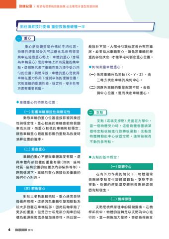 4 %u8a13%u7df4%u7d00%u8981 / %u89e3%u9396%u5404%u985e%u8eca%u798d%u6551%u63f4%u8b0e%u5718 %u5fc5%u53bb%u8461%u8404%u7259%u91cd%u578b%u6551%u63f4%u8a13%u7df4%u8eca%u9ad4%u91cd%u5fc3%u7684%u7279%u9ede%u53ca%u4f4d%u7f6e%uff1a%uff08%u4e00%uff09%u5f71%u97ff%u8eca%u8f1b%u64cd%u63a7%u6027%u8207%u7a69%u5b9a%u6027%u52d5%u614b%u8eca%u8f1b%u7684%u91cd%u5fc3%u4f4d%u7f6e%u76f4%u63a5%u5f71%u97ff%u5176%u64cd%u63a7%u6027%u8207%u7a69%u5b9a%u6027%u3002%u91cd%u5fc3%u8f03%u9ad8%u7684%u8eca%u8f1b%u6703%u8f03%u5bb9%u6613%u7ffb%u8eca%u6216%u5931%u63a7%uff0c%u800c%u91cd%u5fc3%u8f03%u4f4e%u7684%u8eca%u8f1b%u5247%u8f03%u7a69%u5b9a ;%u975c%u614b%u8eca%u8f1b%u91cd%u5fc3%u6700%u76f4%u63a5%u5f71%u97ff%u7684%u91cd%u9ede%u70ba%u6551%u63f4%u6642%u9802%u6607%u4f4d%u7f6e%u7684%u9078%u64c7%u3002%uff08%u4e8c%uff09%u5782%u76f4%u91cd%u5fc3%u8eca%u8f1b%u7684%u91cd%u5fc3%u4e0d%u50c5%u8207%u8eca%u9ad4%u9ad8%u5ea6%u6709%u95dc%uff0c%u9084%u8207%u8eca%u9ad4%u5167%u90e8%u8a2d%u7f6e%u7684%u91cd%u91cf%u6709%u95dc%uff08%u4f8b%u5982 : %u5ea7%u6905%u6750%u8cea%u3001%u5ea7%u6905%u8a2d%u7f6e%u7684%u4f4d%u7f6e%u53ca%u5167%u90e8%u88dd%u98fe%u7b49%u7b49%uff09%u3002%u7406%u60f3%u60c5%u6cc1%u4e0b%uff0c%u8eca%u8f1b%u7684%u91cd%u5fc3%u61c9%u8a72%u4f4d%u65bc%u8eca%u8f1b%u7684%u5e7e%u4f55%u4e2d%u5fc3%u9644%u8fd1%u3002%uff08%u4e09%uff09%u524d%u5f8c%u91cd%u5fc3%u5c0d%u65bc%u5927%u591a%u6578%u8eca%u8f1b%u4f86%u8aaa%uff0c%u91cd%u5fc3%u901a%u5e38%u6703%u7a0d%u5fae%u504f%u5411%u524d%u90e8%uff0c%u9019%u662f%u56e0%u70ba%u8eca%u8f1b%u5f15%u64ce%u548c%u9a45%u52d5%u7cfb%u7d71%u5927%u591a%u8a2d%u7f6e%u5728%u8eca%u8f1b%u524d%u90e8%uff0c%u56e0%u6b64%u524d%u8ef8%u627f%u64d4%u4e86%u66f4%u591a%u7684%u91cd%u91cf%uff0c%u4f46%u662f%u5df4%u58eb%u6216%u662f%u90e8%u5206%u8dd1%u8eca%u7684%u7d50%u69cb%u70ba%u8f09%u904b%u4e58%u5ba2%u6216%u662f%u589e%u52a0%u64cd%u63a7%u6027%uff0c%u6240%u4ee5%u8ddf%u4e00%u652f%u9ede%u7684%u57fa%u672c%u6982%u5ff5%uff1a%uff08%u4e00%uff09%u65cb%u8f49%u4e2d%u5fc3%u5728%u6709%u5916%u529b%u4f5c%u7528%u7684%u60c5%u6cc1%u4e0b%uff0c%u7269%u9ad4%u901a%u5e38%u6703%u570d%u7e5e%u652f%u9ede%u767c%u751f%u65cb%u8f49%u6216%u8f49%u52d5%u3002%u652f%u9ede%u4e0d%u6703%u79fb%u52d5%uff0c%u7269%u9ad4%u7684%u904b%u52d5%u6216%u65cb%u8f49%u5247%u6703%u570d%u7e5e%u9019%u500b%u56fa%u5b9a%u9ede%u767c%u751f%u3002%uff08%u4e8c%uff09%u69d3%u687f%u539f%u7406%u652f%u9ede%u662f%u69d3%u687f%u539f%u7406%u4e2d%u7684%u95dc%u9375%u8981%u7d20%u3002%u5728%u69d3%u687f%u7cfb%u7d71%u4e2d%uff0c%u7269%u9ad4%u7684%u65cb%u8f49%u662f%u4ee5%u652f%u9ede%u70ba%u4e2d%u5fc3%u9032%u884c%u7684%uff0c%u7576%u4e00%u5074%u65bd%u52a0%u529b%u91cf%u6642%uff0c%u6703%u4f7f%u69d3%u687f%u7e5e%u652f%u91cd%u5fc3%u662f%u7269%u9ad4%u8cea%u91cf%u5206%u4f48%u7684%u5e73%u5747%u4f4d%u7f6e%uff0c%u7269%u9ad4%u7684%u904b%u52d5%u548c%u53d7%u529b%u53ef%u4ee5%u7c21%u5316%u70ba%u6240%u6709%u8cea%u91cf%u96c6%u4e2d%u5728%u9019%u500b%u91cd%u5fc3%u9ede%u4e0a%uff0c%u8eca%u9ad4%u7684%u91cd%u5fc3%uff08%u4e5f%u7a31%u70ba%u8eca%u8f1b%u8cea%u5fc3%uff09%u662f%u6307%u8eca%u8f1b%u4e0a%u6240%u6709%u8cea%u91cf%u7684%u96c6%u4e2d%u9ede%uff0c%u9019%u500b%u9ede%u4ee3%u8868%u4e86%u8eca%u8f1b%u5728%u91cd%u529b%u5834%u4e2d%u53d7%u529b%u5747%u52fb%u7684%u4f4d%u7f6e%u3002%u5177%u9ad4%u4f86%u8aaa%uff0c%u8eca%u9ad4%u7684%u91cd%u5fc3%u662f%u4f7f%u5f97%u8eca%u8f1b%u5728%u91cd%u529b%u4f5c%u7528%u4e0b%u9054%u5230%u5e73%u8861%u7684%u7406%u8ad6%u4f4d%u7f6e%uff0c%u5b83%u5c0d%u8eca%u8f1b%u7684%u52d5%u614b%u6027%u80fd%u3001%u7a69%u5b9a%u6027%u3001%u5b89%u5168%u6027%u7b49%u65b9%u9762%u6709%u91cd%u8981%u5f71%u97ff%u3002%u652f%u9ede%uff08%u6216%u7a31%u652f%u6490%u9ede%uff09%u662f%u6307%u5728%u529b%u5b78%u4e2d%uff0c %u7576%u4e00%u500b%u7269%u9ad4%u53d7%u529b%u6642%uff0c%u9019%u500b%u7269%u9ad4%u6703%u570d%u7e5e%u67d0%u500b%u7279%u5b9a%u9ede%u6216%u8ef8%u9032%u884c%u65cb%u8f49%u6216%u904b%u52d5%uff1b%u652f%u9ede%u662f%u7269%u9ad4%u8f49%u52d5%u7684%u4e2d%u5fc3%u6216%u56fa%u5b9a%u9ede%uff0c%u901a%u5e38%u88ab%u8996%u70ba%u4e0d%u52d5%u7684%u53c3%u8003%u9ede%u3002%u4e00 %u91cd%u5fc3%u4e8c %u652f%u9ede%u822c%u8a2d%u8a08%u4e0d%u540c%uff0c%u5927%u90e8%u5206%u5f15%u64ce%u4f4d%u7f6e%u6703%u5206%u5e03%u5728%u8eca%u5c3e%uff0c%u6545%u8981%u627e%u51fa%u8eca%u8f1b%u91cd%u5fc3%uff0c%u9808%u5148%u5c07%u8eca%u8f1b%u7684%u6700%u91cd%u7684%u90e8%u4f4d%u627e%u51fa%uff0c%u624d%u80fd%u6e96%u78ba%u5224%u65b7%u51fa%u91cd%u5fc3%u4f4d%u7f6e%u3002%u5982%u4f55%u6e2c%u91cf%u8eca%u9ad4%u91cd%u5fc3%uff1a%uff08%u4e00%uff09%u5148%u5c07%u8eca%u8f1b%u5206%u70ba%u4e09%u8ef8%uff08X%u3001Y%u3001Z%uff09%uff0c%u7531%u4e09%u8ef8%u53bb%u627e%u51fa%u8eca%u8f1b%u7684%u5e7e%u4f55%u4e2d%u5fc3%u3002%uff08%u4e8c%uff09%u56e0%u61c9%u5404%u8eca%u8f1b%u7684%u91cd%u91cf%u914d%u7f6e%u4e0d%u540c%uff0c%u53bb%u5fae%u8abf%u4e2d%u5fc3%u4f4d%u7f6e%uff0c%u9032%u800c%u627e%u51fa%u8eca%u8f1b%u91cd%u5fc3%u3002%u6293%u4f4f%u9802%u6607%u6280%u5de7%u8981%u9818 %u91cd%u578b%u6551%u63f4%u57fa%u790e%u61c2%u4e00%u534a