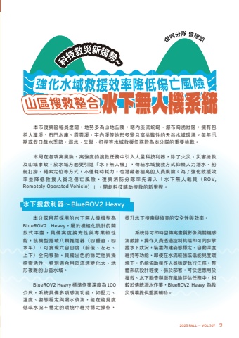 2025 SUMMER %u2014 VOL.106%u672c%u5e02%u5fa9%u8208%u5340%u5e45%u54e1%u907c%u95ca%uff0c%u5730%u52e2%u591a%u70ba%u5c71%u5730%u4e18%u9675%uff0c%u8f44%u5167%u6eaa%u6d41%u873f%u8712%u3001%u7011%u5e03%u6d36%u6e67%u58ef%u95ca%uff0c%u64c1%u6709%u5305%u62ec%u5927%u6f22%u6eaa%u3001%u77f3%u9580%u6c34%u5eab%u3001%u971e%u96f2%u6eaa%u3001%u5b87%u5167%u6eaa%u7b49%u5730%u5f62%u591a%u8b8a%u4e14%u5bcc%u6311%u6230%u6027%u7684%u5929%u7136%u6c34%u57df%u74b0%u5883%u3002%u6bcf%u5e74%u6c5b%u671f%u6216%u5047%u65e5%u6232%u6c34%u5b63%u7bc0%uff0c%u6eba%u6c34%u3001%u5931%u806f%u3001%u6253%u6488%u7b49%u6c34%u57df%u6551%u63f4%u4efb%u52d9%u7686%u70ba%u672c%u5206%u968a%u7684%u91cd%u8981%u6311%u6230%u3002%u672c%u5c40%u5728%u5404%u9805%u9ad8%u98a8%u96aa%u3001%u9ad8%u5f37%u5ea6%u7684%u641c%u6551%u4efb%u52d9%u4e2d%u5f15%u5165%u5927%u91cf%u79d1%u6280%u5229%u5668%uff0c%u9664%u4e86%u706b%u707d%u3001%u707d%u5bb3%u6436%u6551%u53ca%u5c71%u57df%u4e8b%u6545%uff0c%u65bc%u6c34%u57df%u65b9%u9762%u66f4%u5f15%u9032%u300c%u6c34%u4e0b%u7121%u4eba%u6a5f%u300d%uff0c%u50b3%u7d71%u6c34%u57df%u641c%u6551%u65b9%u5f0f%u4ef0%u8cf4%u4eba%u529b%u6f5b%u6c34%u3001%u8239%u8247%u6253%u6488%u3001%u7e69%u7d22%u5b9a%u4f4d%u7b49%u65b9%u5f0f%uff0c%u4e0d%u50c5%u8017%u6642%u8017%u529b%uff0c%u4e5f%u6f5b%u85cf%u8457%u6975%u9ad8%u7684%u4eba%u54e1%u98a8%u96aa%u3002%u70ba%u4e86%u5f37%u5316%u6551%u63f4%u6548%u7387%u4e26%u964d%u4f4e%u6551%u63f4%u4eba%u54e1%u4e4b%u50b7%u4ea1%u98a8%u96aa%uff0c%u5fa9%u8208%u6d88%u9632%u5206%u968a%u7387%u5148%u5c0e%u5165%u300c%u6c34%u4e0b%u7121%u4eba%u8f09%u5177%uff08 ROV, Remotely Operated Vehicle%uff09%u300d%uff0c%u958b%u5275%u79d1%u6280%u8f14%u52a9%u641c%u6551%u7684%u65b0%u91cc%u7a0b%u3002%u672c%u5206%u968a%u76ee%u524d%u63a1%u7528%u7684%u6c34%u4e0b%u7121%u4eba%u6a5f%u6a5f%u578b%u70ba BlueROV2 Heavy%uff0c%u5c6c%u65bc%u6a21%u7d44%u5316%u8a2d%u8a08%u7684%u958b%u653e%u5f0f%u5e73%u81fa%uff0c%u5177%u5099%u9ad8%u5ea6%u64f4%u5145%u6027%u8207%u5c08%u696d%u7d1a%u6027%u80fd%uff0c%u8a72%u6a5f%u578b%u642d%u8f09%u516b%u9846%u63a8%u9032%u5668%uff08%u56db%u5782%u76f4%u3001%u56db%u6c34%u5e73%uff09%uff0c%u53ef%u5be6%u73fe%u516d%u81ea%u7531%u5ea6%uff08%u524d%u5f8c%u3001%u5de6%u53f3%u3001%u4e0a%u4e0b%uff09%u5168%u5411%u79fb%u52d5%uff0c%u5177%u5099%u51fa%u8272%u7684%u7a69%u5b9a%u6027%u8207%u64cd%u63a7%u9748%u6d3b%u6027%uff0c%u7279%u5225%u9069%u5408%u7528%u65bc%u6d41%u901f%u8b8a%u5316%u5927%u3001%u5730%u5f62%u8907%u96dc%u7684%u5c71%u5340%u6c34%u57df%u3002 BlueROV2 Heavy %u6a19%u6e96%u4f5c%u696d%u6df1%u5ea6%u70ba100%u516c%u5c3a%uff0c%u7cfb%u7d71%u5177%u5099%u591a%u9805%u611f%u6e2c%u529f%u80fd%uff0c%u5982%u58d3%u529b%u3001%u6eab%u5ea6%u3001%u59ff%u614b%u7a69%u5b9a%u8207%u6f0f%u6c34%u5075%u6e2c%uff0c%u80fd%u5728%u80fd%u898b%u5ea6%u4f4e%u6216%u6c34%u6cc1%u4e0d%u7a69%u5b9a%u7684%u74b0%u5883%u4e2d%u7dad%u6301%u7a69%u5b9a%u64cd%u4f5c%uff0c%u6c34%u4e0b%u641c%u6551%u5229%u5668%uff5eBlueROV2 Heavy%ufffd%u63d0%u5347%u6c34%u4e0b%u641c%u7d22%u8207%u5075%u67e5%u7684%u5b89%u5168%u6027%u8207%u6548%u7387%u3002 %u7cfb%u7d71%u9664%u53ef%u5373%u6642%u56de%u50b3%u9ad8%u756b%u8cea%u5f71%u50cf%u8207%u95dc%u9375%u611f%u6e2c%u6578%u64da%uff0c%u64cd%u4f5c%u4eba%u54e1%u900f%u904e%u63a7%u5236%u7d42%u7aef%u5373%u53ef%u540c%u6b65%u638c%u63e1%u6c34%u4e0b%u72c0%u6cc1%uff0c%u88dd%u7f6e%u5167%u5efa%u59ff%u614b%u7a69%u5b9a%u3001%u81ea%u52d5%u6df1%u5ea6%u7dad%u6301%u7b49%u529f%u80fd%uff0c%u5373%u4f7f%u5728%u6c34%u6d41%u8f03%u5f37%u6216%u4f4e%u80fd%u898b%u5ea6%u74b0%u5883%u4e0b%uff0c%u4ecd%u80fd%u5354%u52a9%u64cd%u4f5c%u4eba%u54e1%u7a69%u5b9a%u57f7%u884c%u4efb%u52d9%u3002%u6574%u9ad4%u7cfb%u7d71%u8a2d%u8a08%u8f15%u4fbf%u3001%u6613%u65bc%u90e8%u7f72%uff0c%u53ef%u5feb%u901f%u61c9%u7528%u65bc%u641c%u6551%u3001%u6c34%u4e0b%u52d8%u67e5%u8207%u6f5b%u5728%u98a8%u96aa%u8a55%u4f30%u4efb%u52d9%u4e2d%uff0c%u76f8%u8f03%u65bc%u50b3%u7d71%u6f5b%u6c34%u4f5c%u696d%uff0cBlueROV2 Heavy %u70ba%u6551%u707d%u73fe%u5834%u63d0%u4f9b%u91cd%u8981%u8f14%u52a9%u3002%u6c34%u4e0b%u7121%u4eba%u6a5f%u7cfb%u7d712025 FALL %u2014 VOL.107 9