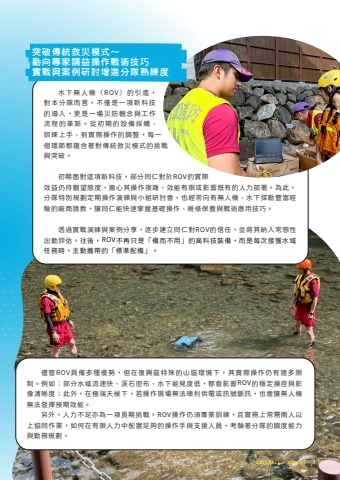 %u5118%u7ba1ROV%u5177%u5099%u591a%u7a2e%u512a%u52e2%uff0c%u4f46%u5728%u5fa9%u8208%u5340%u7279%u6b8a%u7684%u5c71%u5340%u74b0%u5883%u4e0b%uff0c%u5176%u5be6%u969b%u64cd%u4f5c%u4ecd%u6709%u8af8%u591a%u9650%u5236%u3002%u4f8b%u5982%uff1a%u90e8%u5206%u6c34%u57df%u6d41%u901f%u5feb%u3001%u6eaa%u77f3%u5bc6%u5e03%u3001%u6c34%u4e0b%u80fd%u898b%u5ea6%u4f4e%uff0c%u90fd%u6703%u5f71%u97ffROV%u7684%u7a69%u5b9a%u64cd%u63a7%u8207%u5f71%u50cf%u6e05%u6670%u5ea6%uff1b%u6b64%u5916%uff0c%u5728%u6975%u7aef%u5929%u5019%u4e0b%uff0c%u82e5%u64cd%u4f5c%u73fe%u5834%u7121%u6cd5%u9806%u5229%u4f9b%u96fb%u6216%u8a0a%u865f%u65b7%u8a0a%uff0c%u4e5f%u6703%u8b93%u7121%u4eba%u6a5f%u7121%u6cd5%u767c%u63ee%u9810%u671f%u6548%u80fd%u3002%u53e6%u5916%uff0c%u4eba%u529b%u4e0d%u8db3%u4ea6%u70ba%u4e00%u9805%u9577%u671f%u6311%u6230%u3002ROV%u64cd%u4f5c%u4ecd%u9808%u5c08%u696d%u8a13%u7df4%uff0c%u4e14%u5be6%u52d9%u4e0a%u5e38%u9700%u5169%u4eba%u4ee5%u4e0a%u5354%u540c%u4f5c%u696d%uff0c%u5982%u4f55%u5728%u6709%u9650%u4eba%u529b%u4e2d%u914d%u7f6e%u8db3%u5920%u7684%u64cd%u4f5c%u624b%u8207%u652f%u63f4%u4eba%u54e1%uff0c%u8003%u9a57%u8457%u5206%u968a%u7684%u8abf%u5ea6%u80fd%u529b%u8207%u52e4%u52d9%u898f%u5283%u3002%u6c34%u4e0b%u7121%u4eba%u6a5f%uff08ROV%uff09%u7684%u5f15%u9032%uff0c%u5c0d%u672c%u5206%u968a%u800c%u8a00%uff0c%u4e0d%u50c5%u662f%u4e00%u9805%u65b0%u79d1%u6280%u7684%u5c0e%u5165%uff0c%u66f4%u662f%u4e00%u5834%u707d%u9632%u89c0%u5ff5%u8207%u5de5%u4f5c%u6d41%u7a0b%u7684%u9769%u65b0%u3002%u5f9e%u521d%u671f%u7684%u8a2d%u5099%u63a1%u8cfc%u3001%u8a13%u7df4%u4e0a%u624b%u3001%u5230%u5be6%u969b%u64cd%u4f5c%u7684%u8abf%u6574%uff0c%u6bcf%u4e00%u500b%u74b0%u7bc0%u90fd%u860a%u542b%u8457%u5c0d%u50b3%u7d71%u6551%u707d%u6a21%u5f0f%u7684%u6311%u6230%u8207%u7a81%u7834%u3002%u521d%u671f%u9762%u5c0d%u9019%u9805%u65b0%u79d1%u6280%uff0c%u90e8%u5206%u540c%u4ec1%u5c0d%u65bcROV%u7684%u5be6%u969b%u6548%u76ca%u4ecd%u6301%u89c0%u671b%u614b%u5ea6%uff0c%u64d4%u5fc3%u5176%u64cd%u4f5c%u8907%u96dc%u3001%u6548%u80fd%u6709%u9650%u6216%u5f71%u97ff%u65e2%u6709%u7684%u4eba%u529b%u90e8%u7f72%u3002%u70ba%u6b64%uff0c%u5206%u968a%u7279%u5225%u898f%u5283%u5b9a%u671f%u64cd%u4f5c%u6f14%u7df4%u8207%u5c0f%u7d44%u7814%u8a0e%u6703%uff0c%u4e5f%u7d93%u5e38%u5411%u6709%u7121%u4eba%u6a5f%u3001%u6c34%u4e0b%u63a2%u52d8%u8c50%u5bcc%u7d93%u9a57%u7684%u5ee0%u5546%u8acb%u6559%uff0c%u8b93%u540c%u4ec1%u80fd%u5feb%u901f%u638c%u63e1%u57fa%u790e%u64cd%u4f5c%u3001%u7dad%u4fee%u4fdd%u990a%u8207%u6230%u8853%u61c9%u7528%u6280%u5de7%u3002%u900f%u904e%u5be6%u6230%u6f14%u7df4%u8207%u6848%u4f8b%u5206%u4eab%uff0c%u9010%u6b65%u5efa%u7acb%u540c%u4ec1%u5c0dROV%u7684%u4fe1%u4efb%uff0c%u4e26%u5c07%u5176%u7d0d%u5165%u5e38%u614b%u6027%u51fa%u52e4%u8a55%u4f30%u3002%u5f80%u5f8c%uff0cROV%u4e0d%u518d%u53ea%u662f%u300c%u5099%u800c%u4e0d%u7528%u300d%u7684%u9ad8%u79d1%u6280%u88dd%u5099%uff0c%u800c%u662f%u6bcf%u6b21%u63a5%u7372%u6c34%u57df%u4efb%u52d9%u6642%uff0c%u4e3b%u52d5%u651c%u5e36%u7684%u300c%u6a19%u6e96%u914d%u5099%u300d%u3002%u7a81%u7834%u50b3%u7d71%u6551%u707d%u6a21%u5f0f%uff5e%u52e4%u5411%u5c08%u5bb6%u8acb%u76ca%u64cd%u4f5c%u6230%u8853%u6280%u5de7 %u3000%u5be6%u6230%u8207%u6848%u4f8b%u7814%u8a0e%u589e%u9032%u5206%u968a%u719f%u7df4%u5ea62025 FALL %u2014 VOL.107 11