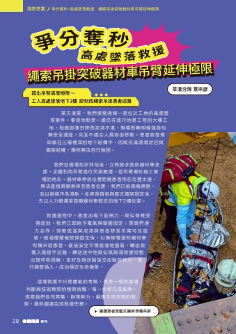%u8349%u6f2f%u5206%u968a %u8449%u5b97%u8afa%u67d0%u5929%u6e05%u6668%uff0c%u6211%u5011%u63a5%u7372%u901a%u5831%u4e00%u8d77%u4f4d%u65bc%u5de5%u5730%u7684%u9ad8%u8655%u589c%u843d%u6848%u4ef6%uff0c%u4e8b%u767c%u5730%u9ede%u662f%u4e00%u8655%u4ecd%u5728%u9032%u884c%u5730%u57fa%u5de5%u7a0b%u7684%u5927%u6a13%u5de5%u5730%uff0c%u5730%u9762%u56e0%u9023%u65e5%u964d%u96e8%u6ce5%u6fd8%u4e0d%u582a%uff0c%u73fe%u5834%u65e2%u7121%u660e%u78ba%u9053%u8def%u4e5f%u7121%u5b89%u5168%u901a%u9053%uff0c%u5b8c%u5168%u4e0d%u9069%u5408%u4eba%u54e1%u81ea%u7531%u79fb%u52d5%u3002%u60a3%u8005%u88ab%u767c%u73fe%u4ef0%u8eba%u5728%u4e09%u5c64%u6a13%u6df1%u7684%u5730%u4e0b%u7d50%u69cb%u4e2d%uff0c%u56db%u5468%u5145%u6eff%u6fd5%u6ed1%u6ce5%u5df4%u8207%u92fc%u67b6%u7d50%u69cb%uff0c%u986f%u7136%u7121%u6cd5%u81ea%u884c%u812b%u56f0%u3002%u6211%u5011%u5728%u73fe%u5834%u521d%u6b65%u8a55%u4f30%u5f8c%uff0c%u7acb%u5373%u8acb%u6c42%u6551%u52a9%u5668%u6750%u8eca%u652f%u63f4%uff0c%u4f01%u5716%u5229%u7528%u540a%u81c2%u9032%u884c%u540a%u639b%u642c%u904b%uff0c%u4f46%u540a%u81c2%u7919%u65bc%u65bd%u5de5%u73fe%u5834%u7684%u5730%u5f62%uff0c%u5668%u6750%u8eca%u505c%u653e%u4f4d%u7f6e%u8ddd%u96e2%u60a3%u8005%u6240%u5728%u4f4d%u7f6e%u592a%u9060%uff0c%u7121%u6cd5%u76f4%u63a5%u5c07%u92fc%u7d22%u4f38%u81f3%u60a3%u8005%u4f4d%u7f6e%uff0c%u6211%u5011%u53ea%u80fd%u81e8%u6a5f%u61c9%u8b8a%uff0c%u6539%u4ee5%u639b%u68af%u4f5c%u70ba%u6ed1%u8ecc%uff0c%u4e26%u5c07%u9577%u80cc%u677f%u8207%u7c43%u5f0f%u64d4%u67b6%u56fa%u5b9a%u5f8c%uff0c%u5148%u4ee5%u4eba%u529b%u642c%u904b%u81f3%u8ddd%u96e2%u5668%u6750%u8eca%u8f03%u8fd1%u7684%u5730%u4e0b2%u6a13%u4f4d%u7f6e%u3002%u6551%u63f4%u904e%u7a0b%u4e2d%uff0c%u60a3%u8005%u51fa%u73fe%u4e0b%u80a2%u7121%u529b%u3001%u7591%u4f3c%u810a%u690e%u53d7%u50b7%u75c7%u72c0%u3002%u6211%u5011%u7acb%u5373%u7d66%u4e88%u6c27%u6c23%u8207%u9838%u5708%u56fa%u5b9a%uff1b%u968a%u54e1%u5011%u901a%u529b%u5408%u4f5c%uff0c%u9802%u8457%u4f4e%u6eab%u8207%u6ce5%u6fd8%u5c07%u60a3%u8005%u79fb%u81f3%u540a%u81c2%u53ef%u53ca%u5340%u57df%uff0c%u7d93%u904e%u5c64%u5c64%u78ba%u8a8d%u8207%u56fa%u5b9a%u5f8c%uff0c%u4ee5%u7121%u7dda%u96fb%u901a%u77e5%u5668%u6750%u8eca%u53f8%u6a5f%u5347%u8d77%u60a3%u8005%uff0c%u6700%u5f8c%u5b89%u5168%u5e73%u7a69%u62b5%u9054%u5730%u9762%u5c64%uff0c%u8f49%u7531%u6551%u8b77%u4eba%u54e1%u63a5%u624b%u9001%u91ab%uff0c%u8f49%u9001%u9014%u4e2d%u4ed6%u7591%u4f3c%u6c23%u80f8%u5c0e%u81f4%u66fe%u77ed%u66ab%u51fa%u73fe%u547c%u5438%u56f0%u96e3%uff0c%u5e78%u597d%u53ca%u6642%u9001%u91ab%u5f8c%u4ea4%u7531%u91ab%u9662%u6551%u6cbb%uff0c%u9032%u884c%u80f8%u7ba1%u63d2%u5165%uff0c%u6210%u529f%u7a69%u5b9a%u751f%u547d%u5fb5%u8c61%u3002%u9019%u5834%u6551%u63f4%u4e0d%u53ea%u662f%u9ad4%u80fd%u7684%u8003%u9a57%uff0c%u66f4%u662f%u4e00%u5834%u5c0d%u81e8%u5834%u5224%u65b7%u8207%u6280%u8853%u9ed8%u5951%u7684%u6975%u9650%u6311%u6230%uff0c%u6bcf%u4e00%u6b65%u90fd%u5145%u6eff%u98a8%u96aa%uff0c%u4f46%u968a%u54e1%u5011%u5404%u53f8%u5176%u8077%u3001%u7fa4%u7b56%u7fa4%u529b%uff0c%u5c55%u73fe%u5e73%u6642%u8a13%u7df4%u7684%u9ed8%u5951%uff0c%u6700%u7d42%u5713%u6eff%u5b8c%u6210%u6551%u63f4%u4efb%u52d9%u3002%u6d88%u9632%u82b1%u7d6e %u722d%u5206%u596a%u79d2~%u9ad8%u8655%u589c%u843d%u6551%u63f4%u3000%u7e69%u7d22%u540a%u639b%u7a81%u7834%u5668%u6750%u8eca%u540a%u81c2%u5ef6%u4f38%u6975%u9650%u642c%u904b%u60a3%u8005%u81f3%u7c43%u5f0f%u64d4%u67b6%u6e96%u5099%u540a%u639b28 %u5668%u6750%u8eca