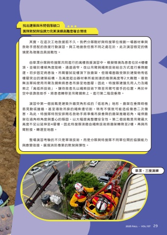 %u5176%u5be6%uff0c%u5728%u9019%u6b21%u5de5%u5730%u6551%u63f4%u524d%u4e0d%u4e45%uff0c%u6211%u5011%u5206%u968a%u525b%u597d%u8207%u7279%u641c%u55ae%u4f4d%u898f%u5283%u4e00%u5834%u5668%u6750%u8eca%u8207%u6551%u52a9%u624b%u642d%u914d%u7684%u6551%u63f4%u884c%u52d5%u6f14%u7fd2%uff0c%u8207%u5de5%u5730%u6436%u6551%u4efb%u52d9%u4e0d%u540c%u4e4b%u8655%u5728%u65bc%uff0c%u6b64%u6b21%u6f14%u7fd2%u5047%u5b9a%u7684%u60c5%u5883%u66f4%u70ba%u8907%u96dc%u4e14%u5177%u6311%u6230%u6027%u3002%u7531%u8349%u6f2f%u5206%u968a%u8207%u7279%u641c%u968a%u5171%u540c%u9032%u884c%u7684%u9ad8%u6a13%u6551%u63f4%u6f14%u7fd2%u4e2d%uff0c%u6a21%u64ec%u60c5%u5883%u70ba%u60a3%u8005%u4f4d%u65bc4%u6a13%u6a13%u9802%uff0c%u4e26%u7919%u65bc%u6a13%u68af%u89d2%u5ea6%u9661%u5ced%u3001%u901a%u9053%u904e%u7a84%uff0c%u6539%u4ee5%u540a%u81c2%u8207%u7e69%u7d22%u6280%u8853%u7d50%u5408%u65b9%u5f0f%u9032%u884c%u5782%u964d%u642c%u904b%u3002%u521d%u6b65%u56fa%u5b9a%u75c5%u60a3%u5f8c%uff0c%u540a%u81c2%u5617%u8a66%u5f9e%u6a13%u9802%u4e0b%u653e%u64d4%u67b6%uff0c%u4f46%u73fe%u5834%u9762%u81e8%u53d7%u9650%u65bc%u5efa%u7bc9%u7269%u6709%u4f4e%u6a13%u5c64%u7a81%u51fa%u7684%u5efa%u7bc9%u7d50%u69cb%uff0c%u53ca%u9ad8%u5ea6%u8d85%u51fa%u5668%u6750%u8eca%u6240%u80fd%u5230%u9054%u7684%u6975%u9650%u9ad8%u5ea6%u7b492%u5927%u96e3%u984c%uff0c%u5c0e%u81f4%u7121%u6cd5%u55ae%u7d14%u4f7f%u7528%u540a%u81c2%u53ca%u92fc%u7d22%u5c07%u60a3%u8005%u540a%u639b%u81f3%u5730%u9762%u5c64%uff1b%u56e0%u6b64%uff0c%u7279%u641c%u968a%u5efa%u8b70%u5148%u7528%u4eba%u529b%u53ca%u7e69%u7d22%u4e4b%u300c%u9ad8%u4f4e%u6240%u6280%u8853%u300d%uff0c%u8b93%u5f85%u6551%u8005%u5148%u4ee5%u7e69%u7d22%u6280%u8853%u4e0b%u964d%u81f3%u540a%u81c2%u53ef%u63a5%u624b%u7684%u4f4d%u7f6e%uff0c%u518d%u65bc%u534a%u7a7a%u4e2d%u4f9d%u9760%u6551%u52a9%u624b%uff0c%u5c07%u60a3%u8005%u8f49%u79fb%u81f3%u540a%u81c2%u92fc%u7d22%u4e0a%uff0c%u9032%u884c%u7b2c%u4e8c%u968e%u6bb5%u5782%u964d%u3002%u6f14%u7fd2%u4e2d%u7b2c%u4e00%u500b%u6311%u6230%u662f%u5efa%u7bc9%u5916%u7246%u7a81%u89d2%u5f62%u6210%u7684%u300c%u4f4e%u5ca9%u89d2%u300d%u5730%u5f62%uff0c%u64d4%u67b6%u5728%u5782%u964d%u6642%u6975%u6613%u6643%u52d5%u6216%u649e%u7246%uff0c%u751a%u81f3%u5c0e%u81f4%u540a%u639b%u7684%u7e69%u7d22%u906d%u5207%u5272%uff0c%u7a0d%u6709%u4e0d%u614e%u5c31%u53ef%u80fd%u9020%u6210%u50b7%u60a3%u4e8c%u6b21%u50b7%u5bb3%uff0c%u70ba%u6b64%uff0c%u7279%u641c%u968a%u7279%u5225%u5b89%u6392%u5169%u540d%u6551%u52a9%u624b%u5c07%u6e96%u5099%u540a%u639b%u5782%u964d%u7684%u64d4%u67b6%u63a8%u96e2%u5ca9%u89d2%uff0c%u78ba%u4fdd%u64d4%u67b6%u5728%u904e%u89d2%u6642%u89d2%u5ea6%u8207%u91cd%u5fc3%u7684%u7a69%u56fa%uff0c%u4ee5%u5927%u5e45%u63d0%u9ad8%u6574%u9ad4%u5b89%u5168%u6027%u3002%u7b2c%u4e8c%u500b%u6311%u6230%u662f%u540a%u81c2%u6700%u5927%u9ad8%u5ea6%u4e0d%u8db3%u4ee5%u5ef6%u4f38%u81f34%u5c64%u6a13%uff0c%u56e0%u6b64%u7279%u641c%u968a%u9808%u85c9%u7531%u7e69%u7d22%u6280%u8853%u5c07%u64d4%u67b6%u8f49%u964d%u81f32%u6a13%uff0c%u518d%u8207%u540a%u81c2%u5c0d%u63a5%uff0c%u8f49%u904b%u81f3%u5730%u9762%u3002%u6574%u5834%u6f14%u7fd2%u8003%u9a57%u7684%u4e0d%u53ea%u662f%u55ae%u9805%u6280%u8853%uff0c%u800c%u662f%u5206%u968a%u8207%u7279%u641c%u968a%u4e0d%u540c%u55ae%u4f4d%u9593%u7684%u5354%u8abf%u80fd%u529b%u8207%u61c9%u8b8a%u929c%u63a5%uff0c%u5c55%u73fe%u6d88%u9632%u5c08%u696d%u7684%u9ed8%u5951%u8207%u5f48%u6027%u3002%u8349%u6f2f%u3001%u4e09%u641c%u6f14%u7df42025 FALL %u2014 VOL.107 29