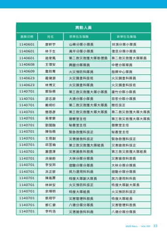 %u7570%u52d5%u4eba%u54e1%u7570%u52d5%u65e5%u671f %u59d3%u540d %u539f%u55ae%u4f4d%u53ca%u7a31%u8077 %u65b0%u55ae%u4f4d%u53ca%u8077%u7a311140601 %u5ed6%u8ed2%u5b87 %u5c71%u5cf0%u5206%u968a%u5c0f%u968a%u9577 %u5733%u9802%u5206%u968a%u5c0f%u968a%u95771140601 %u6797%u4e8e%u751f %u9ad8%u5e73%u5206%u968a%u5c0f%u968a%u9577 %u5fa9%u65e6%u5206%u968a%u5c0f%u968a%u95771140601 %u8d99%u5bb6%u9cf3 %u7b2c%u4e8c%u6551%u707d%u6551%u8b77%u5927%u968a%u52a9%u7406%u54e1 %u7b2c%u4e8c%u6551%u707d%u6551%u8b77%u5927%u968a%u968a%u54e11140608 %u738b%u61f7%u5b89 %u8208%u570b%u5206%u968a%u968a%u54e1 %u4e2d%u58e2%u5206%u968a%u968a%u54e11140609 %u8a79%u923a%u83c1 %u706b%u707d%u9810%u9632%u79d1%u968a%u54e1 %u6307%u63ee%u4e2d%u5fc3%u968a%u54e11140623 %u7f85%u5065%u6e90 %u706b%u707d%u8abf%u67e5%u79d1%u6280%u4f50 %u706b%u707d%u8abf%u67e5%u79d1%u968a%u54e11140623 %u6797%u535a%u6587 %u706b%u707d%u8abf%u67e5%u79d1%u968a%u54e1 %u706b%u707d%u8abf%u67e5%u79d1%u6280%u4f501140701 %u912d%u8a60%u5112 %u7b2c%u4e09%u6551%u707d%u6551%u8b77%u5927%u968a%u5c0f%u968a%u9577 %u8606%u7af9%u5206%u968a%u5c0f%u968a%u95771140701 %u6e38%u5fd7%u6e90 %u5927%u6e73%u5206%u968a%u5c0f%u968a%u9577 %u8304%u82f3%u5206%u968a%u5c0f%u968a%u95771140701 %u6234%u660e%u6749 %u7b2c%u4e8c%u6551%u707d%u6551%u8b77%u5927%u968a%u5927%u968a%u9577 %u7c21%u4efb%u6280%u6b631140701 %u7c21%u6148%u5f65 %u7b2c%u4e09%u6551%u707d%u6551%u8b77%u5927%u968a%u5927%u968a%u9577 %u7b2c%u4e8c%u6551%u707d%u6551%u8b77%u5927%u968a%u5927%u968a%u95771140701 %u5433%u5bb6%u8c6a %u7763%u5bdf%u5ba4%u4e3b%u4efb %u7b2c%u4e09%u6551%u707d%u6551%u8b77%u5927%u968a%u5927%u968a%u95771140701 %u5289%u95ca%u878d %u79d8%u66f8%u5ba4%u4e3b%u4efb %u7763%u5bdf%u5ba4%u4e3b%u4efb1140701 %u9673%u6021%u5112 %u7dca%u6025%u6551%u8b77%u79d1%u6280%u6b63 %u79d8%u66f8%u5ba4%u4e3b%u4efb1140701 %u856d%u96f2%u6fa4 %u707d%u5bb3%u6436%u6551%u79d1%u80a1%u9577 %u7b2c%u4e09%u6551%u707d%u6551%u8b77%u5927%u968a%u7d44%u95771140701 %u6d2a%u69ae%u851a %u5927%u6797%u5206%u968a%u5206%u968a%u9577 %u707d%u5bb3%u6436%u6551%u79d1%u80a1%u95771140701 %u674e%u5b89%u90a6 %u8ff4%u9f8d%u5206%u968a%u5206%u968a%u9577 %u5927%u6797%u5206%u968a%u5206%u968a%u95771140701 %u6d2a%u6b63%u8afa %u6c11%u529b%u904b%u7528%u79d1%u79d1%u54e1 %u8ff4%u9f8d%u5206%u968a%u5206%u968a%u95771140701 %u9673%u80e4%u849d %u7279%u641c%u5927%u968a%u526f%u5927%u968a%u9577 %u6c11%u529b%u904b%u7528%u79d1%u79d1%u95771140701 %u6797%u7965%u5b89 %u706b%u707d%u9810%u9632%u79d1%u6280%u6b63 %u7279%u641c%u5927%u968a%u526f%u5927%u968a%u95771140701 %u4f59%u9806%u660e %u7279%u641c%u5927%u968a%u7d44%u9577 %u706b%u707d%u9810%u9632%u79d1%u6280%u6b631140701 %u8521%u7fd4%u5b87 %u707d%u5bb3%u7ba1%u7406%u79d1%u80a1%u9577 %u7279%u641c%u5927%u968a%u7d44%u95771140701 %u912d%u4ec1%u8c6a %u516b%u5fb7%u5206%u968a%u5206%u968a%u9577 %u707d%u5bb3%u7ba1%u7406%u79d1%u80a1%u95771140701 %u674e%u6600%u6d69 %u707d%u5bb3%u6436%u6551%u79d1%u79d1%u54e1 %u516b%u5fb7%u5206%u968a%u5206%u968a%u95771140701 %u738b%u4fe1%u526f %u707d%u5bb3%u6436%u6551%u79d1%u6280%u6b63 %u7dca%u6025%u6551%u8b77%u79d1%u6280%u6b631140701 %u90b1%u6631%u7db8 %u7b2c%u4e09%u6551%u707d%u6551%u8b77%u5927%u968a%u7d44%u9577 %u707d%u5bb3%u6436%u6551%u79d1%u6280%u6b632025 FALL %u2014 VOL.107 33