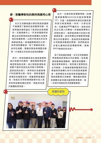 %u672c%u6b21%u4ea4%u6d41%u8b93%u6843%u5712%u5206%u968a%u7684%u7dca%u6025%u6551%u8b77%u54e1%u4e0d%u50c5%u7372%u5f97%u4e86%u6700%u65b0%u7684%u6025%u6551%u91ab%u5b78%u77e5%u8b58%uff0c%u4e5f%u5c0d%u5176%u81e8%u5e8a%u61c9%u7528%u7522%u751f%u4e86%u66f4%u6df1%u7684%u53cd%u601d%u8207%u671f%u5f85%u3002%u5728%u5be6%u52d9%u64cd%u4f5c%u4e0a%uff0c%u8a31%u591a%u6551%u8b77%u54e1%u7279%u5225%u95dc%u6ce8%u5982%u4f55%u5c07%u5b78%u5230%u7684%u65b0%u77e5%u8b58%u8f49%u5316%u70ba%u66f4%u6709%u6548%u7684%u6551%u8b77%u7b56%u7565%uff0c%u4ee5%u63d0%u5347%u60a3%u8005%u7684%u5b58%u6d3b%u7387%u8207%u795e%u7d93%u9810%u5f8c%u3002%u900f%u904e%u570b%u969b%u5c08%u5bb6%u7684%u5206%u4eab%uff0c%u6211%u5011%u6df1%u523b%u9ad4%u6703%u5230%uff0c%u9664%u4e86%u638c%u63e1%u65b0%u6280%u8853%uff0c%u5982%u4f55%u5728%u9ad8%u58d3%u3001%u8b8a%u52d5%u7684%u7dca%u6025%u73fe%u5834%u9748%u6d3b%u61c9%u7528%uff0c%u624d%u662f%u771f%u6b63%u6c7a%u5b9a%u6551%u6cbb%u6210%u6548%u7684%u95dc%u9375%u3002%u5176%u4e2d%uff0c%u5373%u6642%u56de%u994b%u6280%u8853%u5728%u901a%u6c23%u7ba1%u7406%u8207%u80f8%u5916%u6309%u58d3%u4e2d%u7684%u61c9%u7528%uff0c%u8b93%u6551%u8b77%u54e1%u66f4%u80fd%u6e96%u78ba%u63a7%u5236%u65bd%u6551%u54c1%u8cea%uff0c%u6e1b%u5c11%u56e0%u904e%u5ea6%u901a%u6c23%u6216%u6309%u58d3%u4e0d%u7576%u6240%u9020%u6210%u7684%u8840%u6d41%u52d5%u529b%u5b78%u554f%u984c%u3002%u9019%u9805%u6280%u8853%u7684%u5c0e%u5165%uff0c%u5c07%u6709%u52a9%u65bc%u6539%u5584%u73fe%u5834CPR%u7684%u6a19%u6e96%u5316%u8207%u4e00%u81f4%u6027%uff0c%u4f7f%u60a3%u8005%u7372%u5f97%u66f4%u7a69%u5b9a%u7684%u5faa%u74b0%u652f%u6301%u3002%u6551%u8b77%u54e1%u5011%u666e%u904d%u8a8d%u70ba%uff0c%u82e5%u80fd%u5728%u65e5%u5e38%u8a13%u7df4%u8207%u52e4%u52d9%u4e2d%u52a0%u5165%u66f4%u591a%u5373%u6642%u56de%u994b%u8a2d%u5099%u7684%u4f7f%u7528%uff0c%u5c07%u80fd%u6709%u6548%u63d0%u5347%u6574%u9ad4%u6025%u6551%u6548%u80fd%u3002%u6b64%u5916%uff0c%u5728%u61c9%u7528%u65b0%u578b%u96fb%u64ca%u7b56%u7565%uff08%u5982%u96d9%u91cd%u9023%u7e8c%u96fb%u64ca DSED %u53ca%u5411%u91cf%u6539%u8b8a%u96fb%u64caVC%uff09%u65b9%u9762%uff0c%u6551%u8b77%u54e1%u5c0d%u5176%u6f5b%u5728%u7684%u81e8%u5e8a%u904b%u7528%u8868%u793a%u9ad8%u5ea6%u8208%u8da3%u3002%u7136%u800c%uff0c%u5927%u5bb6%u4e5f%u8a8d%u70ba%uff0c%u5728%u81fa%u7063%u7684EMS%u9ad4%u7cfb%u4e2d%uff0c%u9019%u4e9b%u6280%u8853%u7684%u6b63%u5f0f%u5c0e%u5165%u4ecd%u9700%u9032%u4e00%u6b65%u9a57%u8b49%u8207%u6a19%u6e96%u5316%u6d41%u7a0b%u7684%u5efa%u7acb%uff0c%u78ba%u4fdd%u80fd%u8207%u73fe%u884c%u7684%u6307%u5f15%u8207%u8cc7%u6e90%u914d%u5957%u3002%u9019%u4e5f%u7a81%u986f%u51fa%u6301%u7e8c%u6559%u80b2%u8207%u570b%u969b%u5408%u4f5c%u7684%u91cd%u8981%u6027%uff0c%u900f%u904e%u66f4%u591a%u8de8%u570b%u7d93%u9a57%u4ea4%u6d41%u8207%u81e8%u5e8a%u6578%u64da%u7684%u7d2f%u7a4d%uff0c%u6211%u5011%u5c07%u80fd%u9010%u6b65%u512a%u5316%u81fa%u7063%u7684%u9662%u524d%u96fb%u64ca%u7b56%u7565%uff0c%u63d0%u9ad8OHCA%u60a3%u8005%u7684%u5b58%u6d3b%u7387%u3002%u9664%u4e86%u6280%u8853%u9762%u7684%u7cbe%u9032%uff0c%u672c%u6b21%u4ea4%u6d41%u66f4%u8b93%u6211%u5011%u610f%u8b58%u5230%u8de8%u9818%u57df%u5408%u4f5c%u7684%u50f9%u503c%u3002%u5f9e%u6551%u8b77%u54e1%u5230%u91ab%u7642%u6307%u5c0e%u91ab%u5e2b%u3001%u91ab%u9662%u6025%u8a3a%u5718%u968a%uff0c%u751a%u81f3%u662f%u5b78%u8853%u55ae%u4f4d%uff0c%u552f%u6709%u5efa%u7acb%u66f4%u7dca%u5bc6%u7684%u5408%u4f5c%u7db2%u7d61%uff0c%u624d%u80fd%u78ba%u4fdd%u6700%u65b0%u91ab%u5b78%u7814%u7a76%u6210%u679c%u80fd%u5920%u5feb%u901f%u8f49%u5316%u70ba%u53ef%u884c%u7684%u9662%u524d%u6551%u8b77%u6a19%u6e96%u3002%u6211%u5011%u671f%u5f85%u672a%u4f86%u80fd%u6709%u66f4%u591a%u570b%u969b%u7d1a%u7684%u5b78%u8853%u8207%u5be6%u52d9%u4ea4%u6d41%u6a5f%u6703%uff0c%u8b93%u6843%u5712%u7684%u7dca%u6025%u6551%u8b77%u9ad4%u7cfb%u80fd%u6301%u7e8c%u5411%u570b%u969b%u6a19%u6e96%u770b%u9f4a%uff0c%u9032%u4e00%u6b65%u63d0%u5347%u75c5%u60a3%u7684%u5b58%u6d3b%u8207%u5eb7%u5fa9%u6a5f%u6703%u3002%u53c3%u3001%u5c0d%u91ab%u5b78%u65b0%u77e5%u7684%u671f%u5f85%u8207%u61c9%u7528%u5fc3%u5f97%ufffd2025 FALL %u2014 VOL.107 7